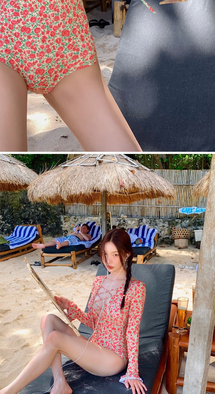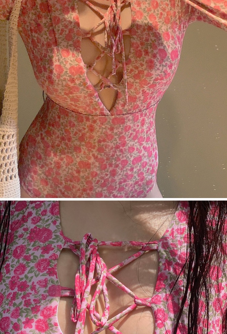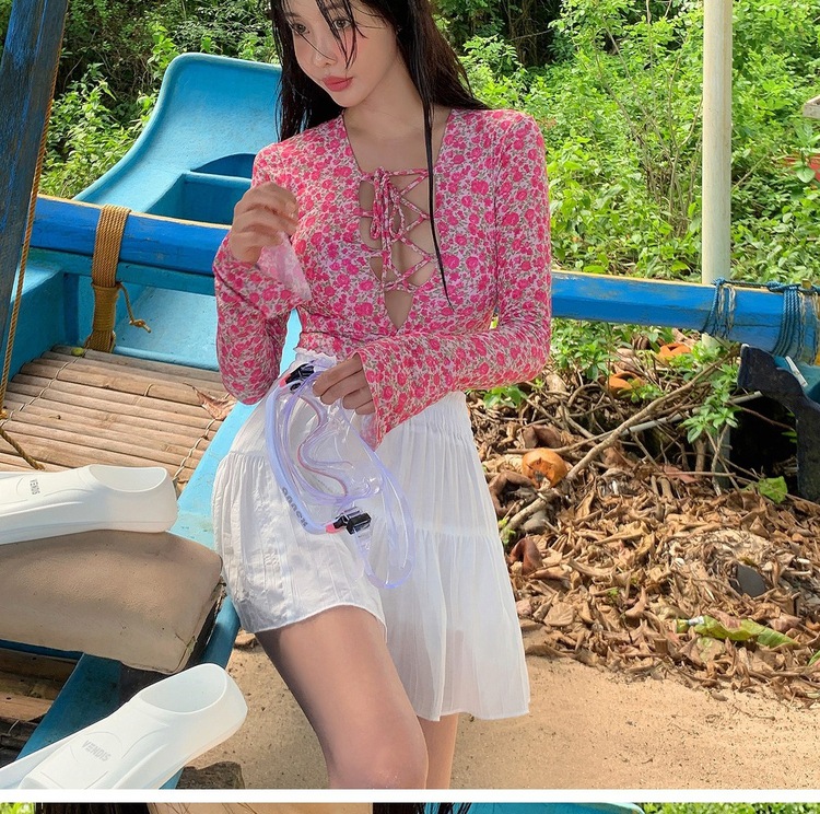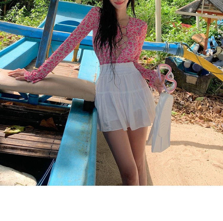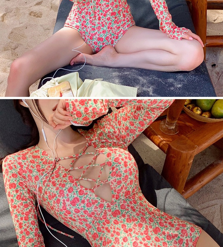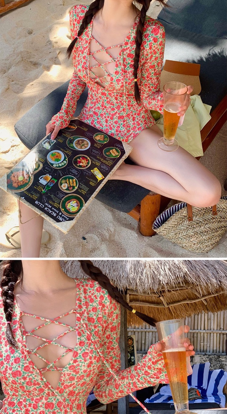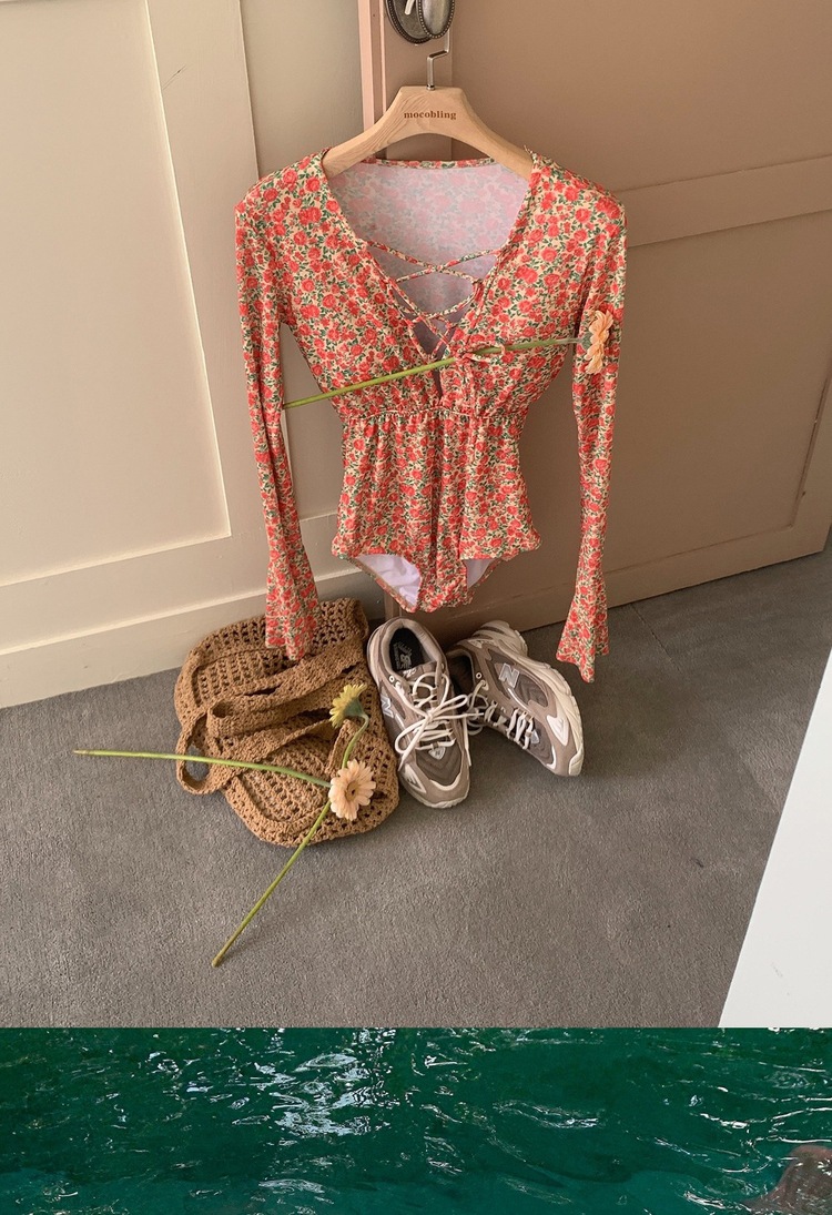 2024 한국식 동대문 딥 V 스트랩 플로럴 섹시 수영복 여성용 긴팔 슬림핏 작은 가슴 온천 수영복스토어 가기