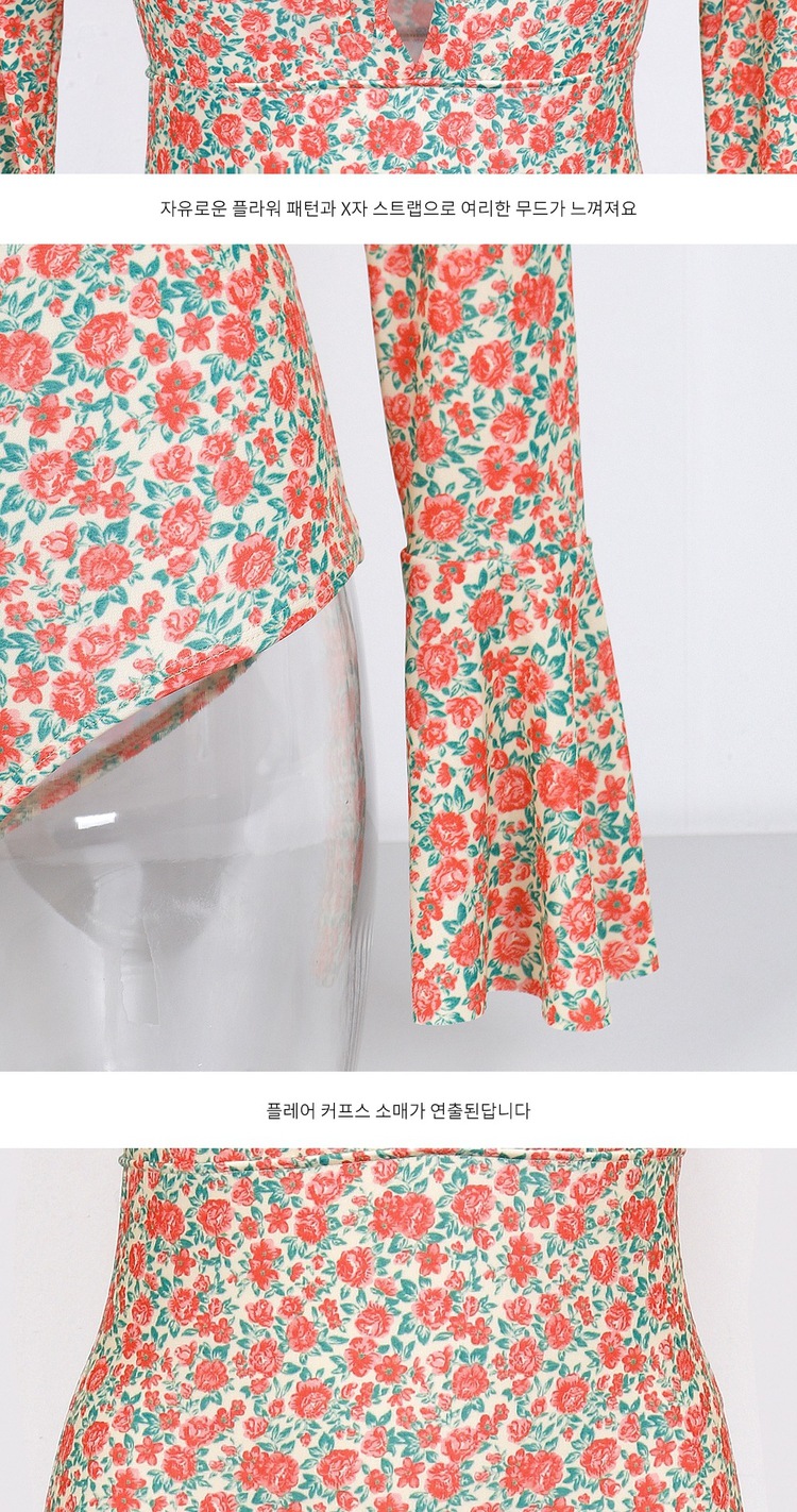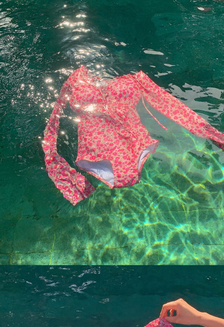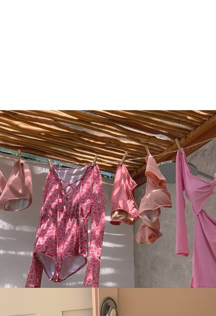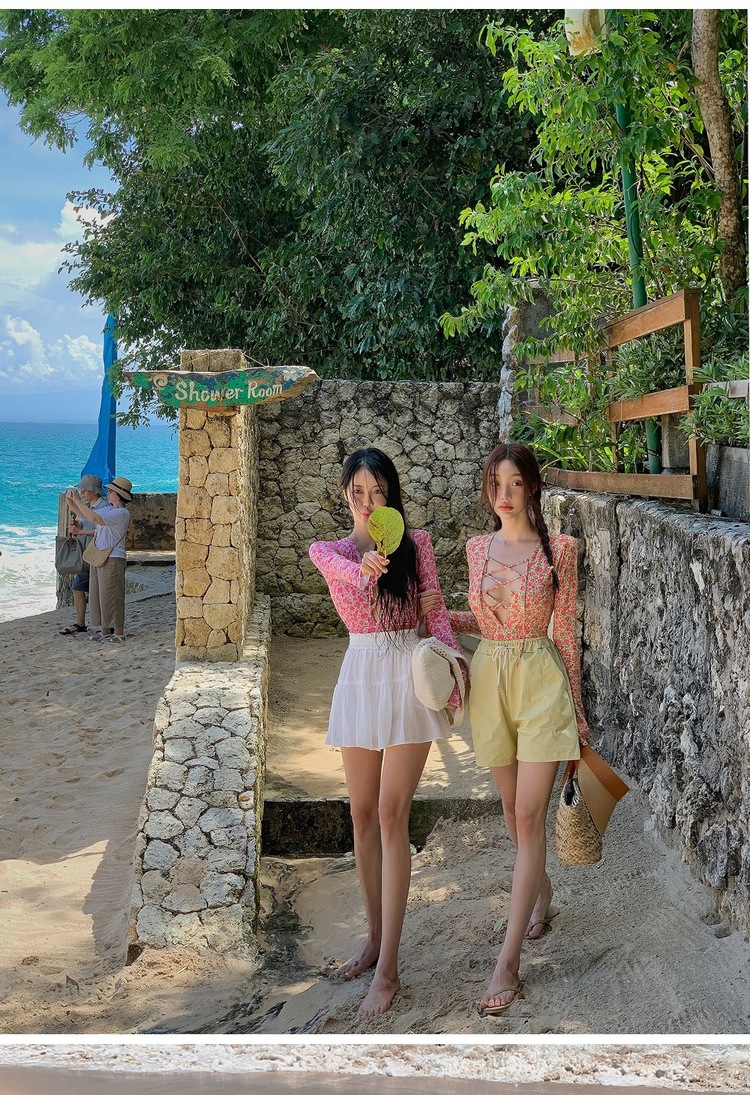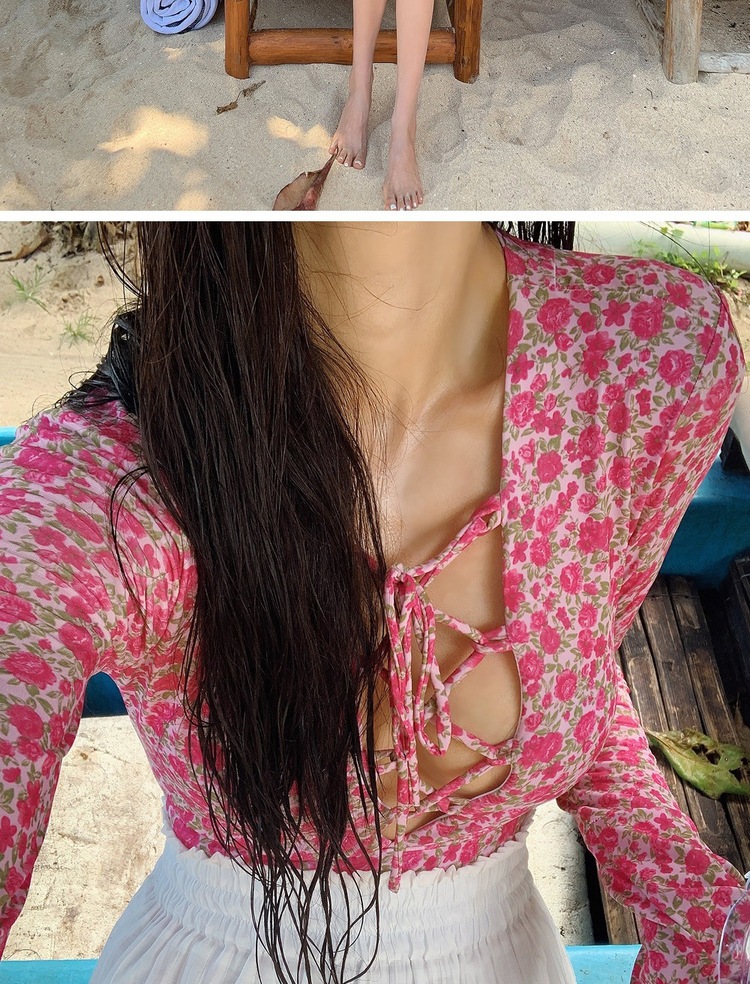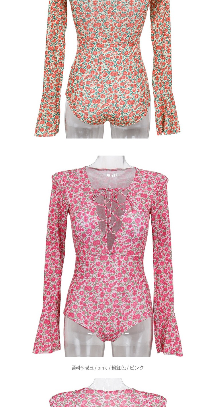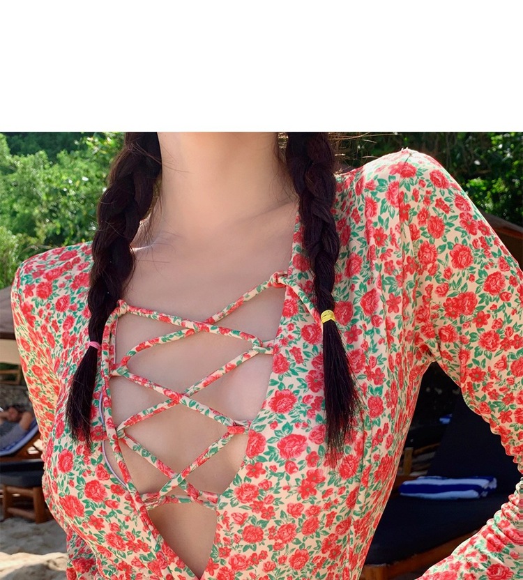 2024 한국식 동대문 딥 V 스트랩 플로럴 섹시 수영복 여성용 긴팔 슬림핏 작은 가슴 온천 수영복스토어 가기
