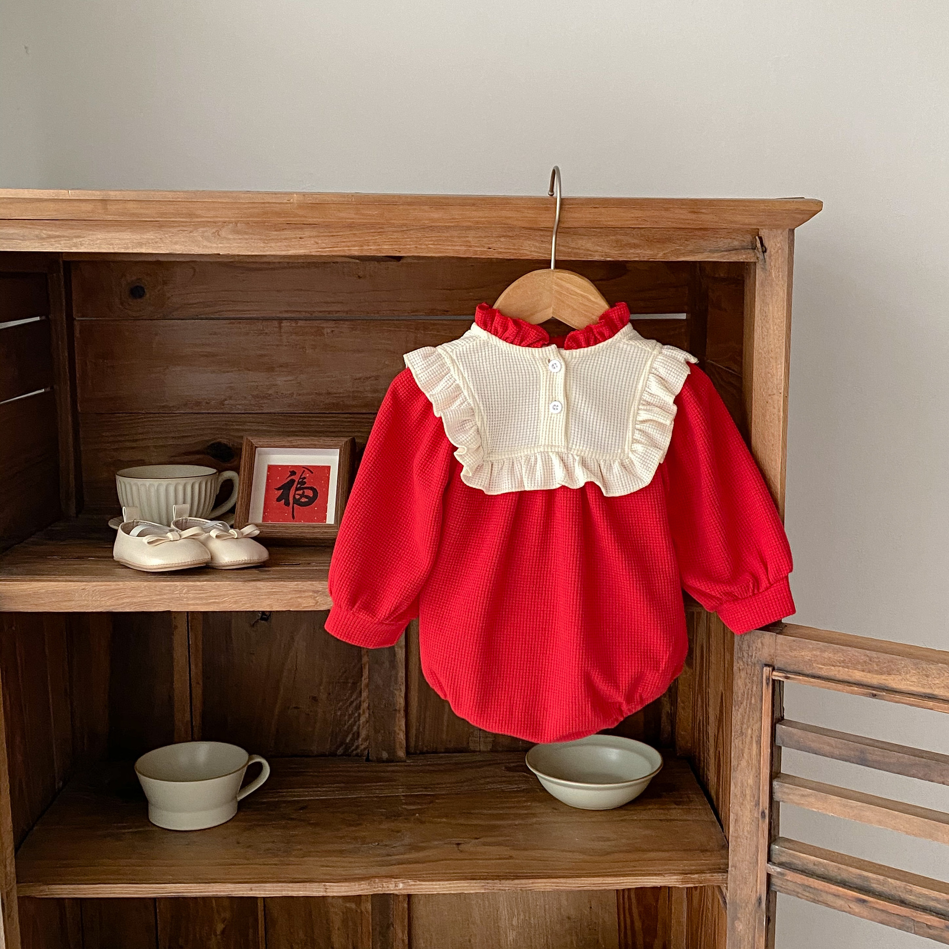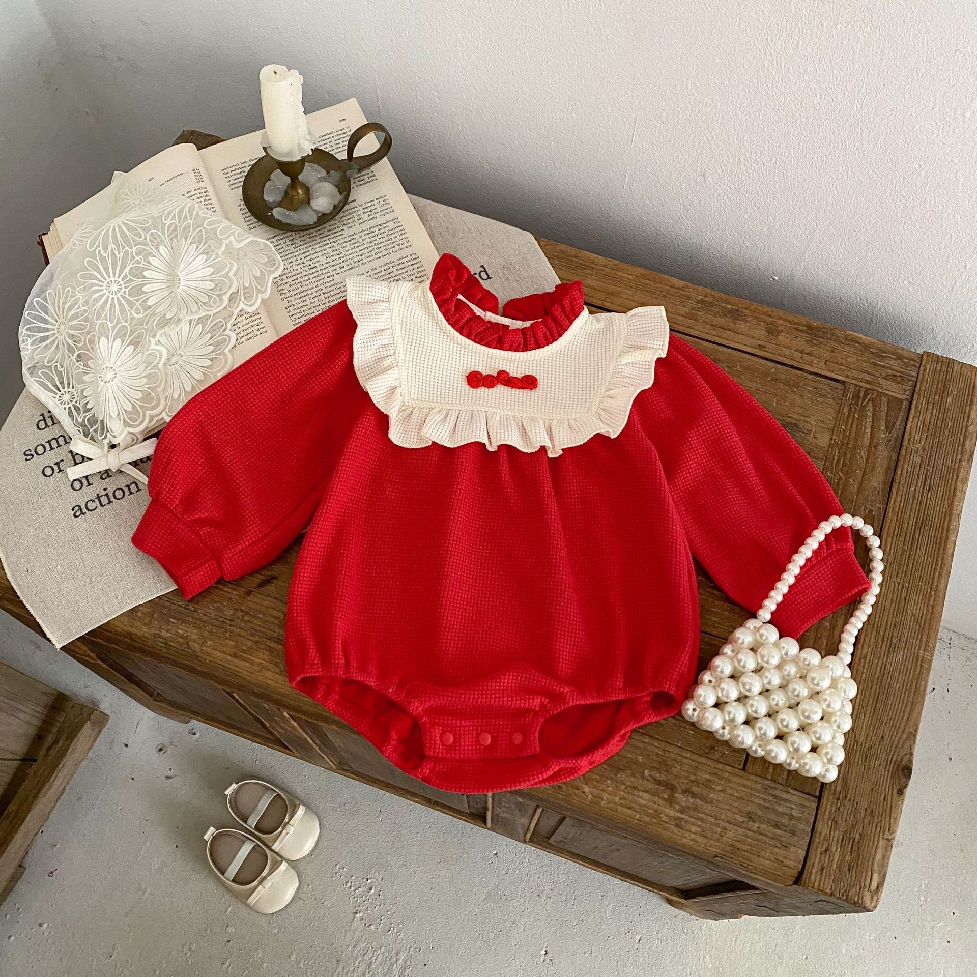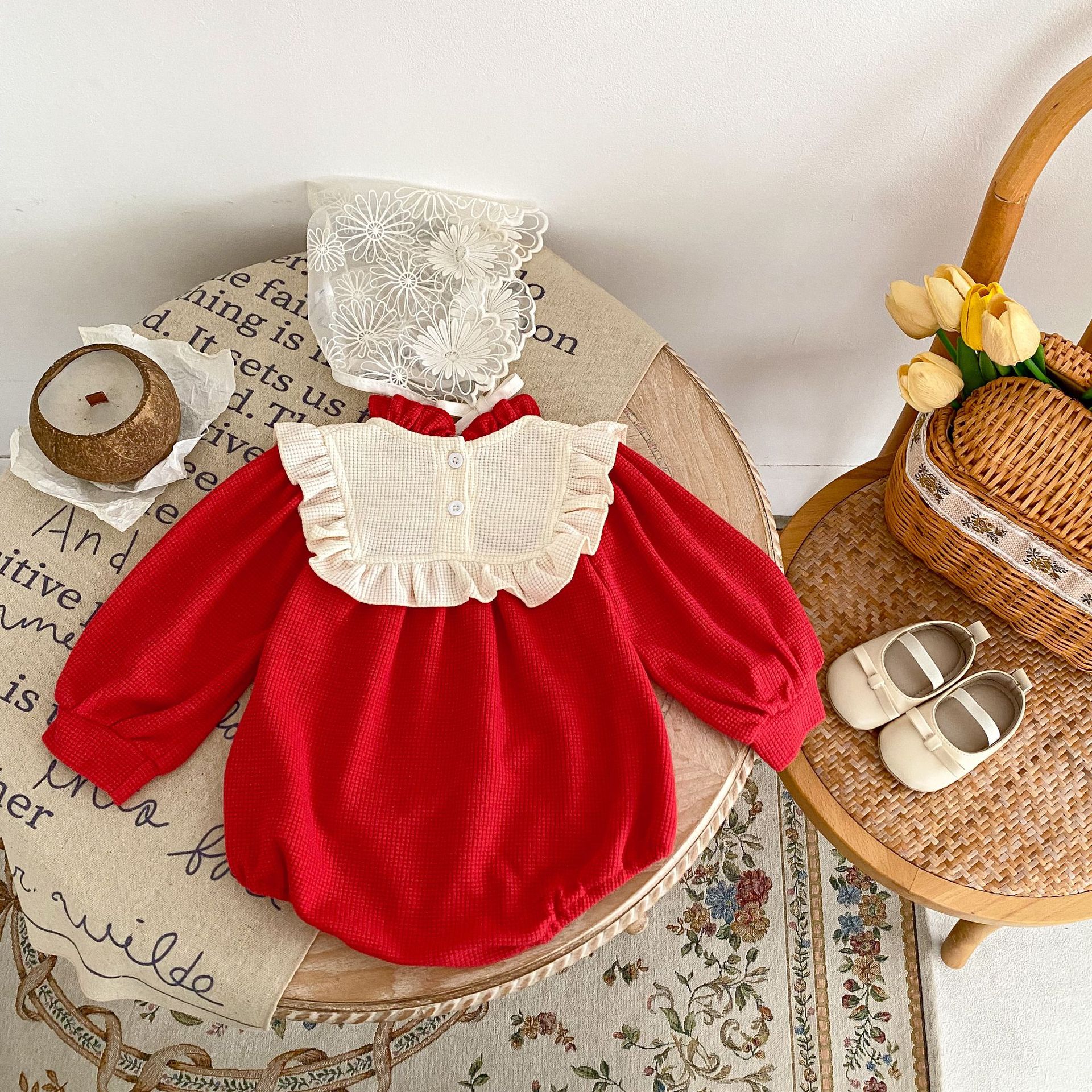 2025년 봄 신년 레드 유아 여아 와플 배색 바디수트 원피스 삼각형 롬퍼