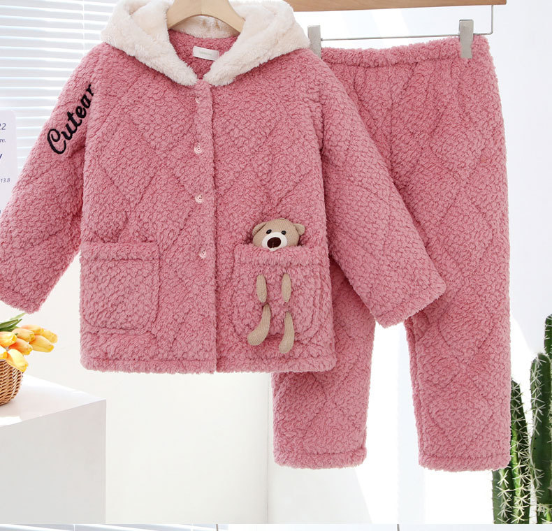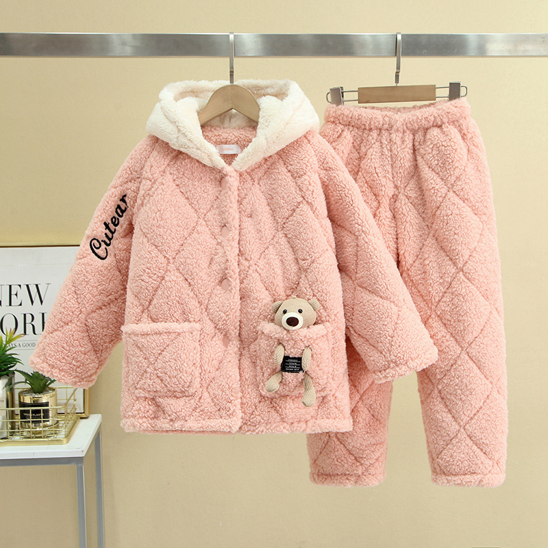 3 층 퀼트 산호 양털 어린이 모자 잠옷 여성의 겨울 긴 소매 두껍게 따뜻한 겉옷 홈웨어 세트