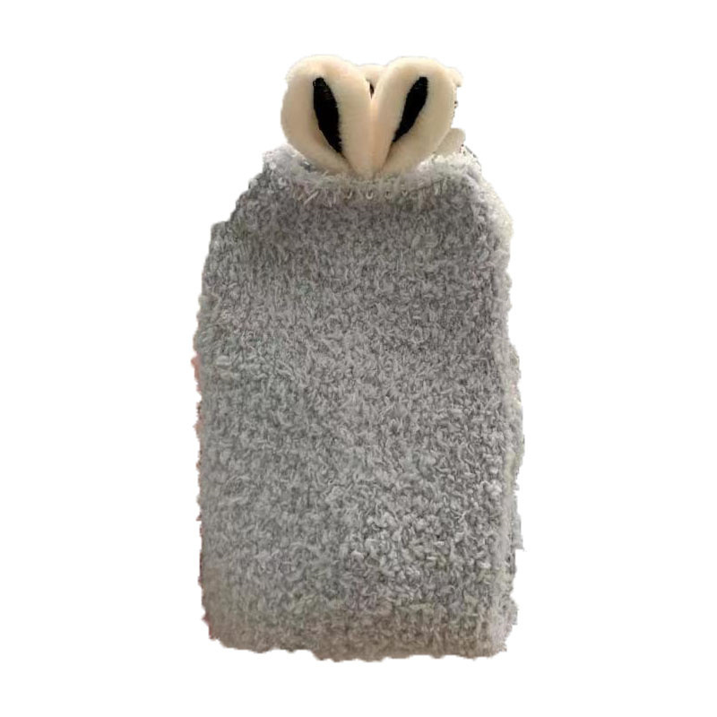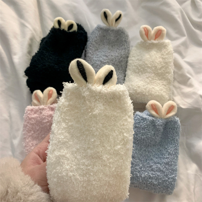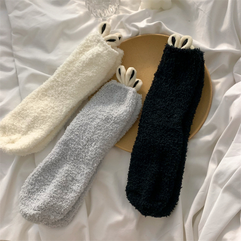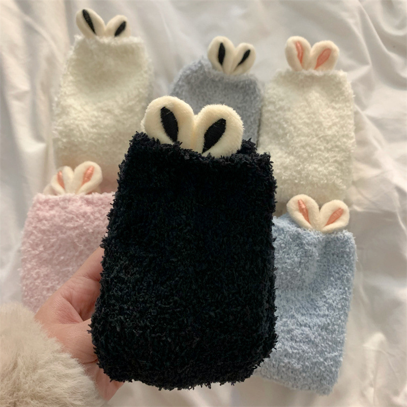 귀여운 토끼 귀 산호 양털 모피 양말 여성용 중간 튜브 가을 겨울 따뜻한 소녀의 미끄럼 방지 바닥 양말에 기모 두껍게