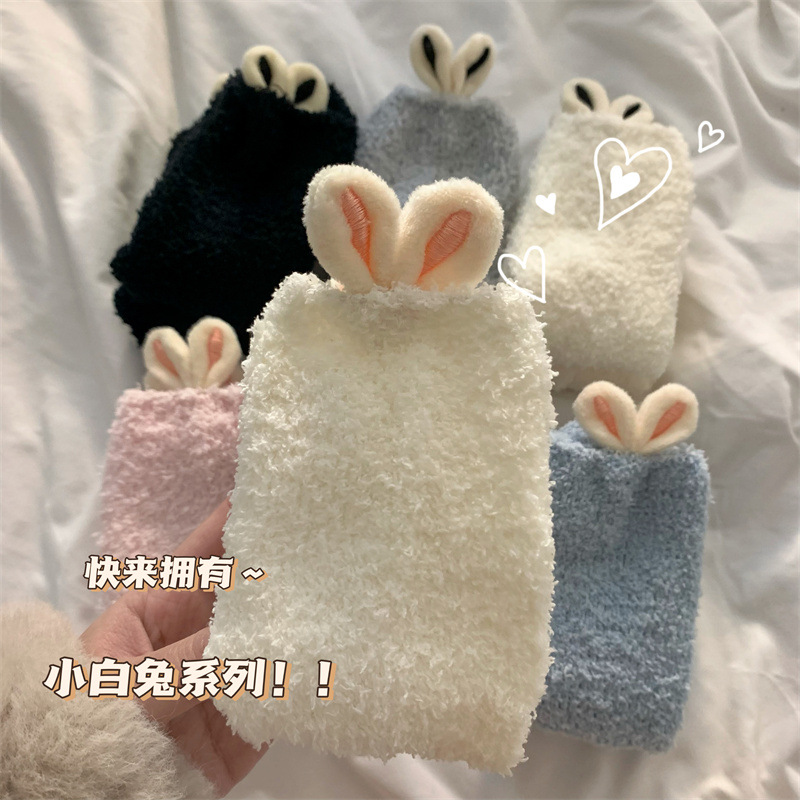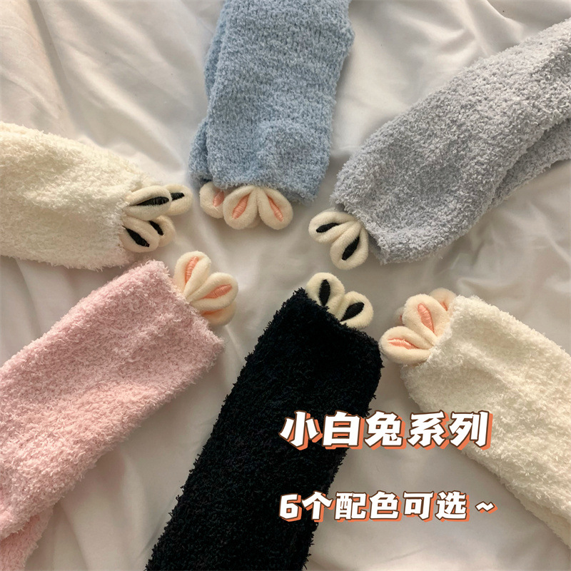 귀여운 토끼 귀 산호 양털 모피 양말 여성용 중간 튜브 가을 겨울 따뜻한 소녀의 미끄럼 방지 바닥 양말에 기모 두껍게스토어 가기