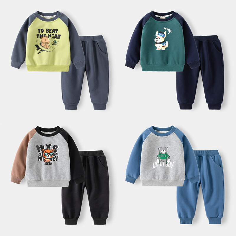 WAPYPY 아동복 2026년 신상 세트 남아용 스웨트셔츠와 스포츠 바지 투피스 세트 아기 만화 풀오버 의류 도매