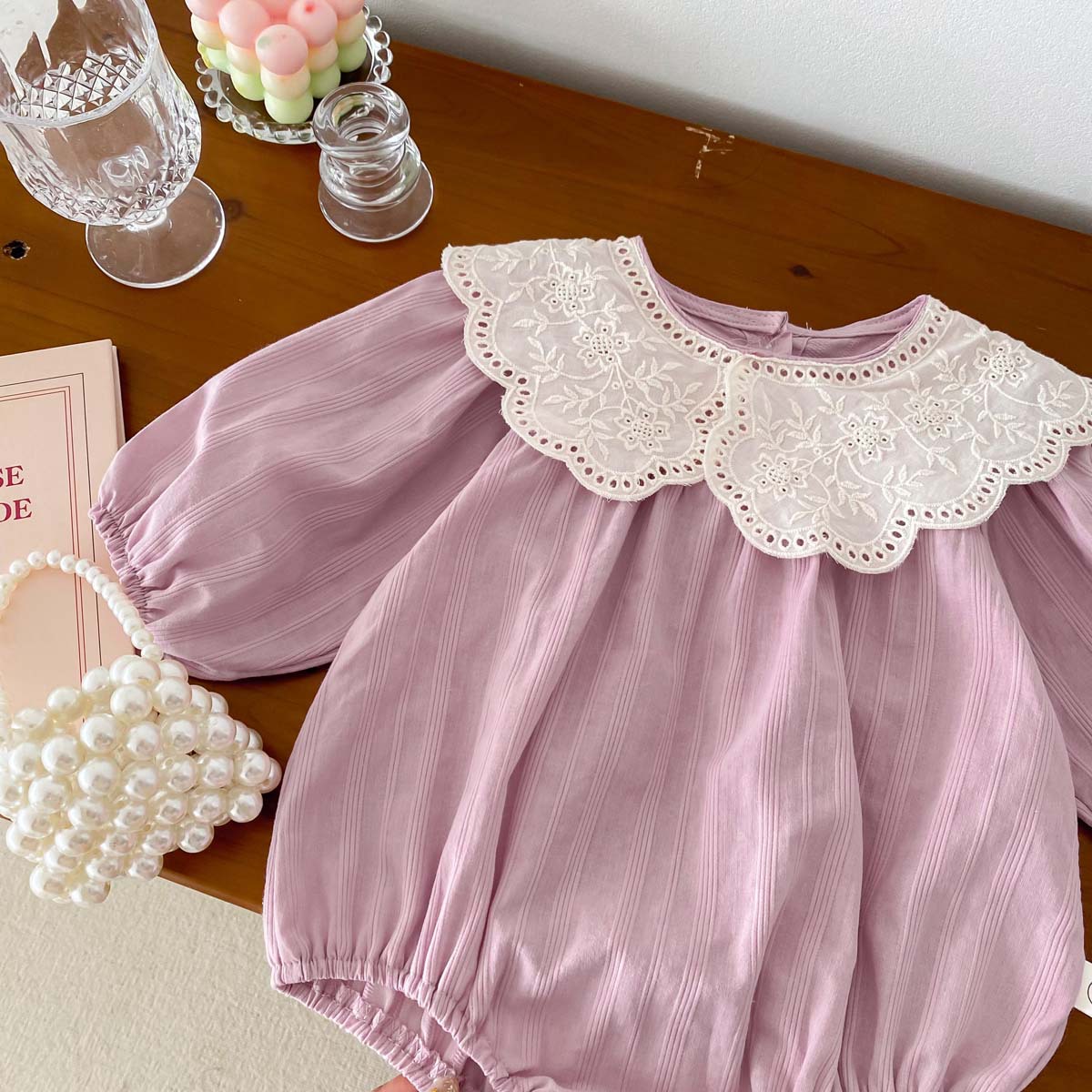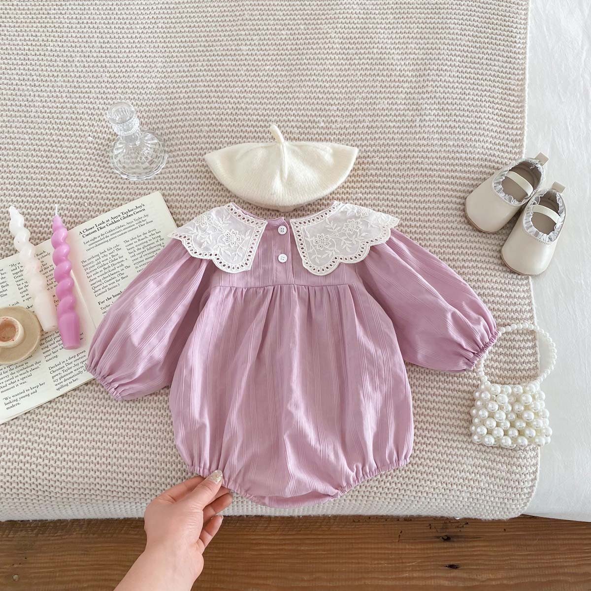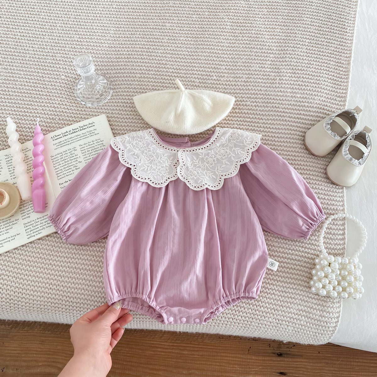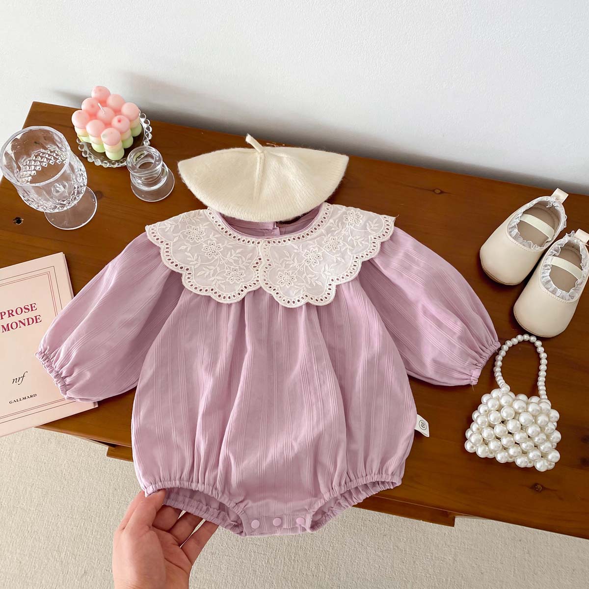 아기옷 봄가을 스타일, 멋스러운 큰 카라 바디슈트, 신생아 여아 보라색 백일촬영 외출복