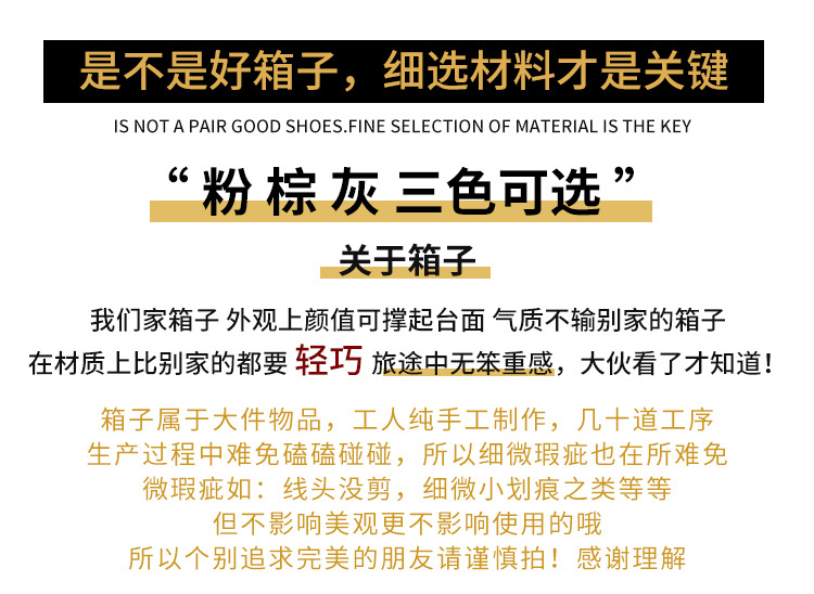 1.本店所售的拉杆箱,零配件终身保修,(轮子,拉杆,锁,把手等)