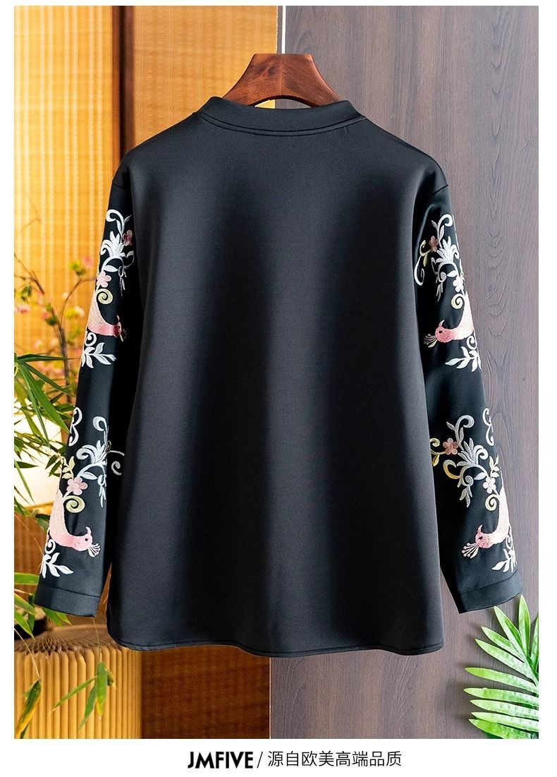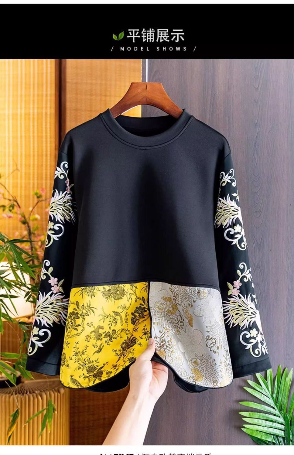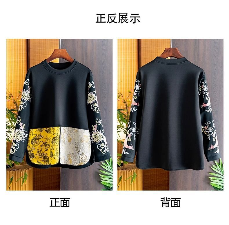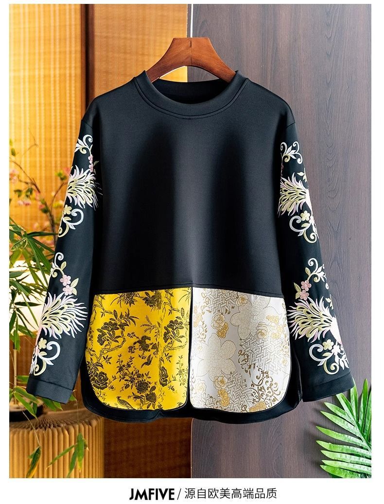 새로운 중국 대비 색상 스티칭 크루 넥 땀 여성의 2023 가을 및 겨울 새로운 국가 패션 자카드 자수 느슨한 긴 소매