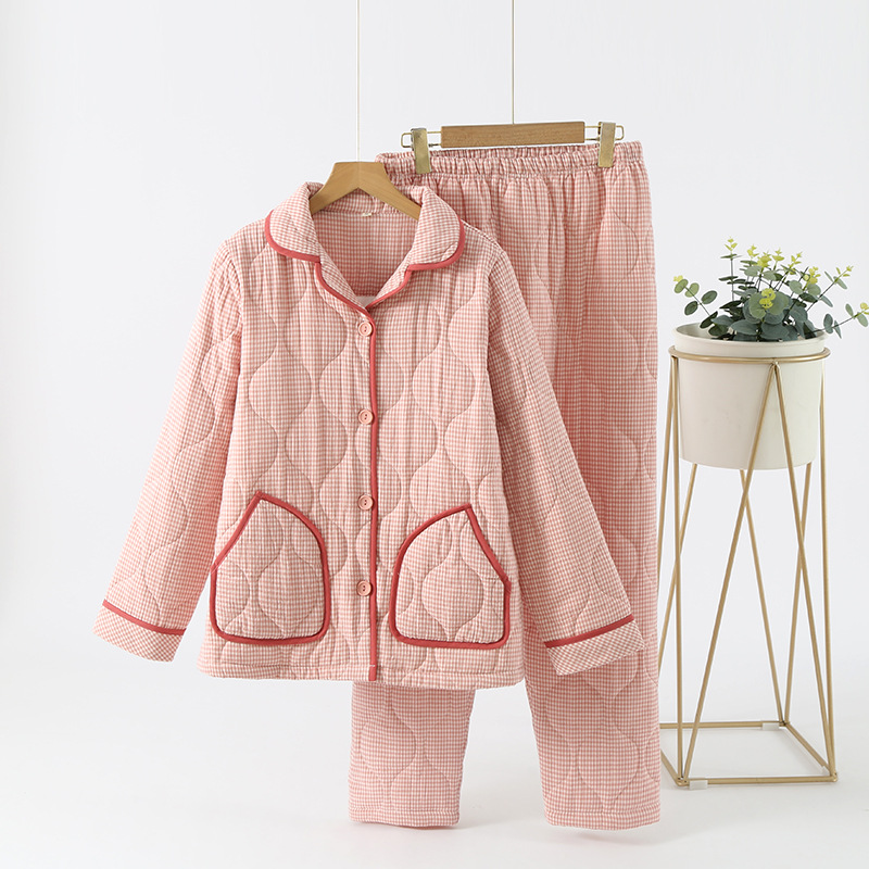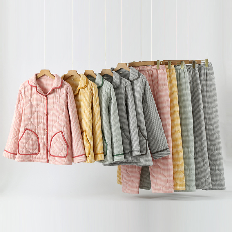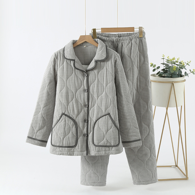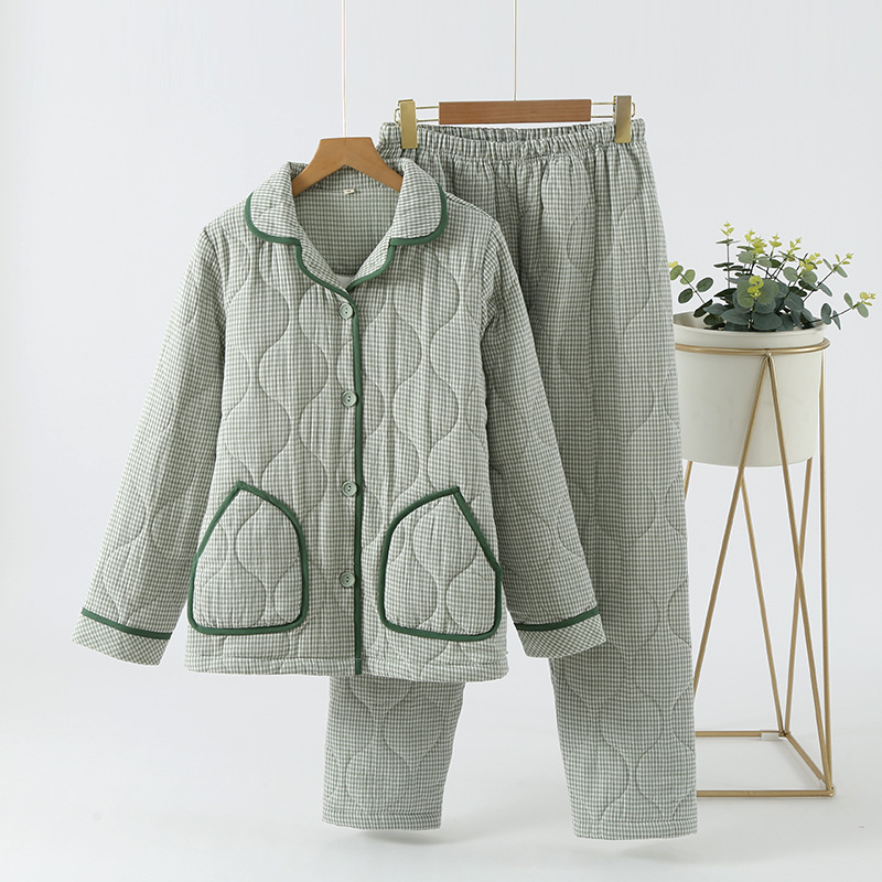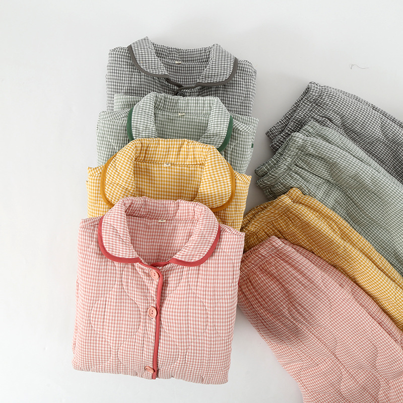 가을과 겨울 새로운 일본식 간단한 격자 무늬 더블 레이어 거즈 퀼트 남성과 여성 커플 잠옷 홈 두껍게 된면 패딩 재킷 세트