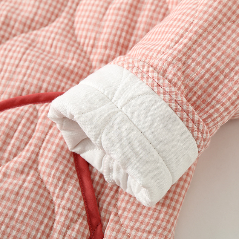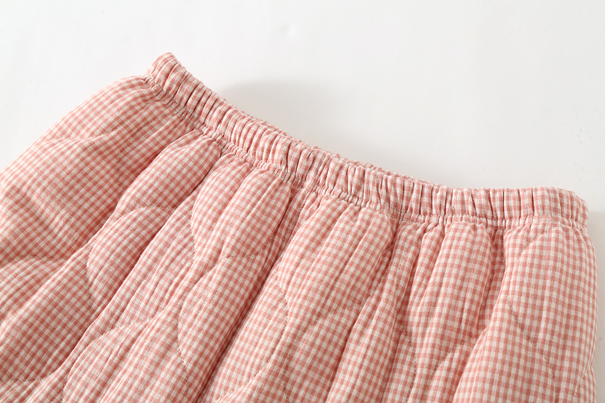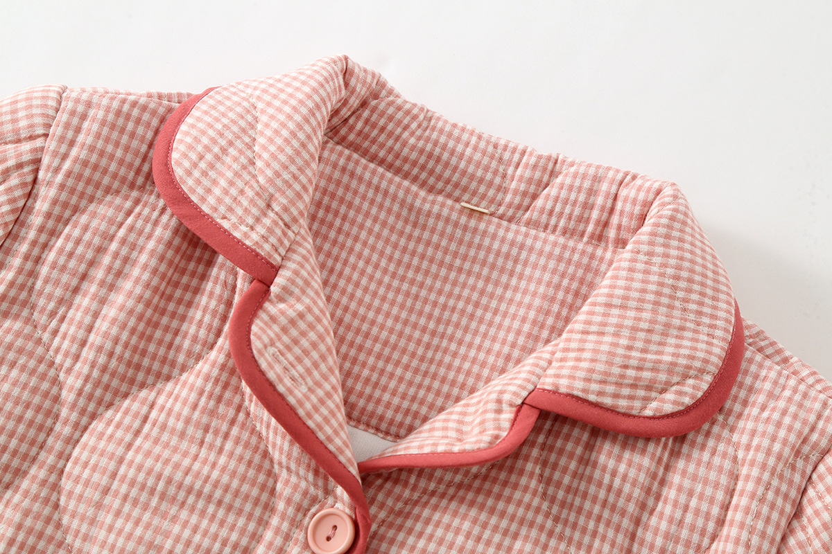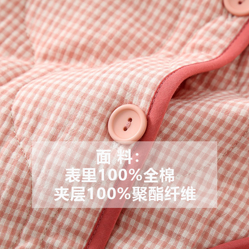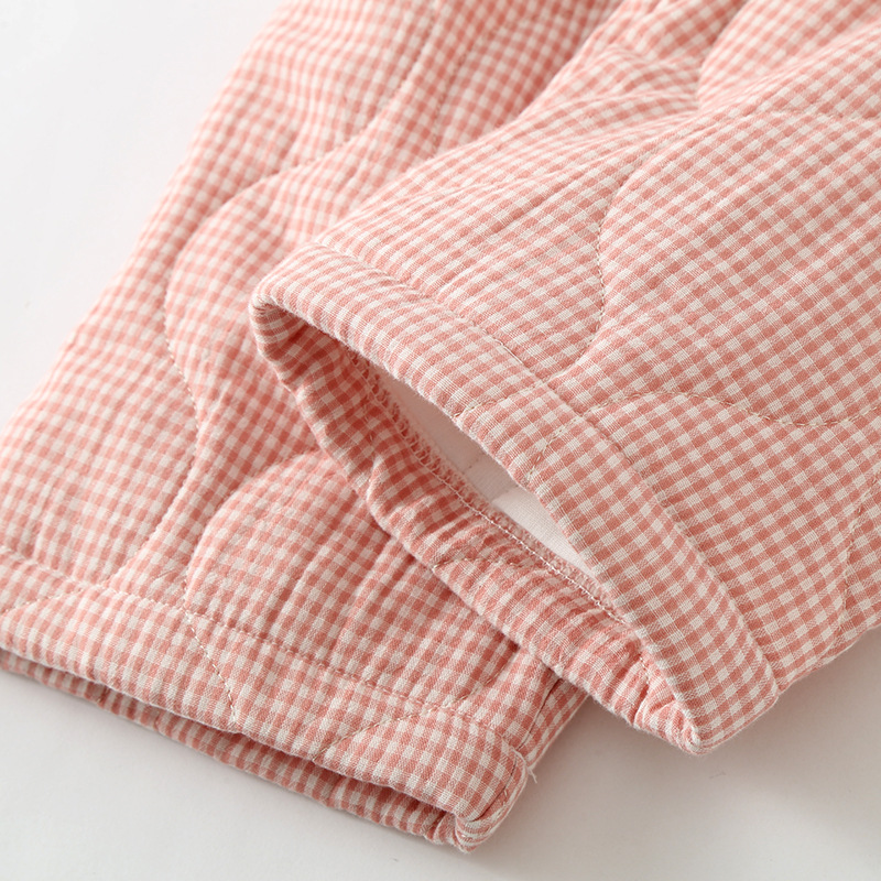 가을과 겨울 새로운 일본식 간단한 격자 무늬 더블 레이어 거즈 퀼트 남성과 여성 커플 잠옷 홈 두껍게 된면 패딩 재킷 세트