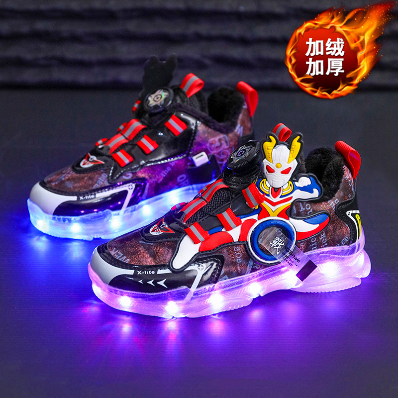 충전식 다채로운 조명 신발 셀로 울트라 맨 회전 버튼 기모 소년 소녀 어린이 빛나는 신발 운동화