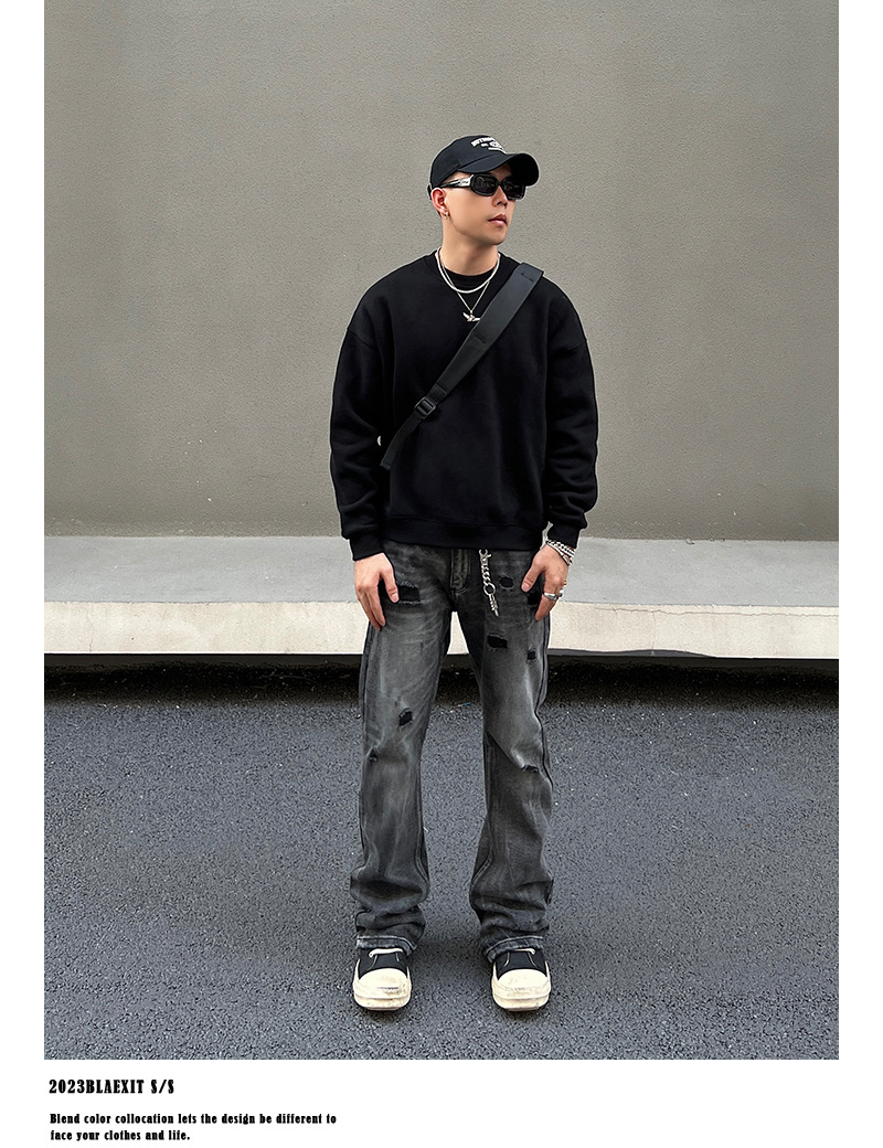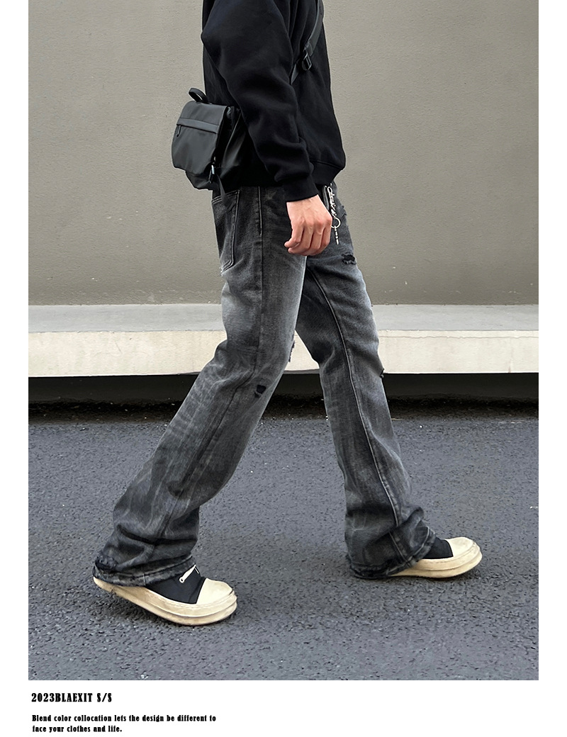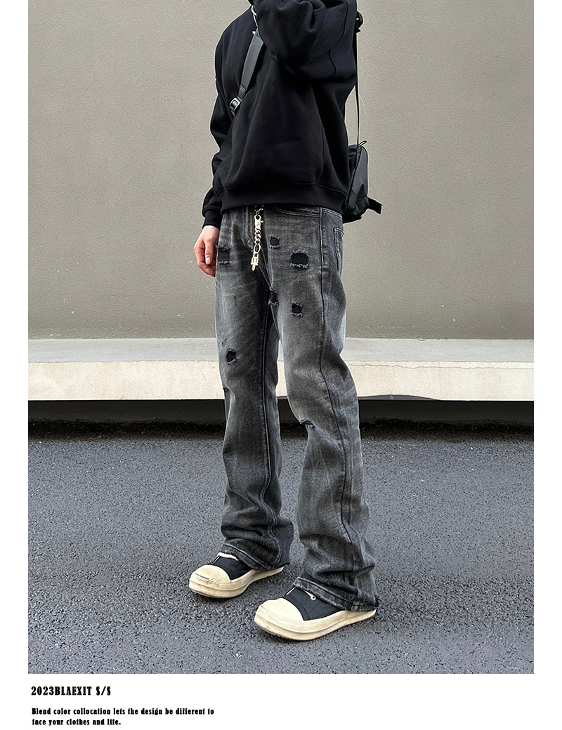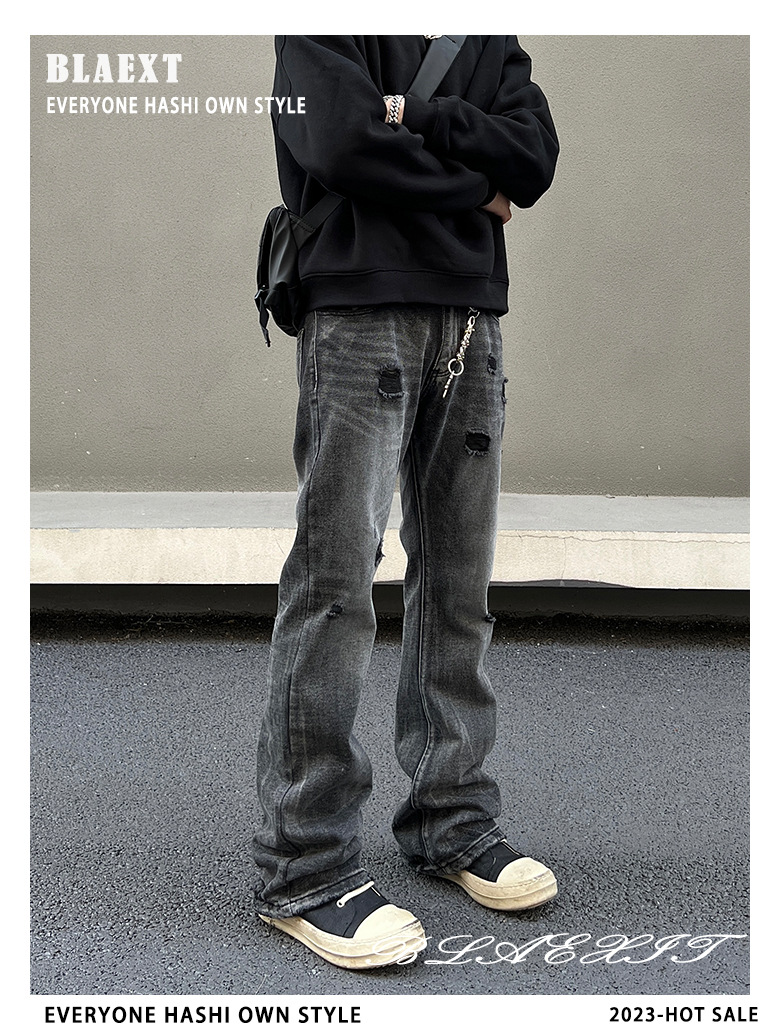 2024 새로운 스타일 세척 블랙 찢어진 청바지 남성용 스트레이트 마이크로 클린 핏 바지 미국 하이 스트리트 분위기스토어 가기
