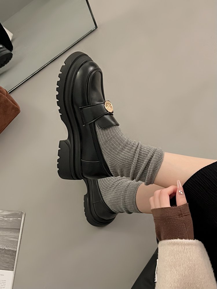 새로운 가을과 겨울 검은 색 영국 가죽 신발이 슬립 온 여성 신발 플랫 슈즈를 2024 여성의 두꺼운 밑창 로퍼