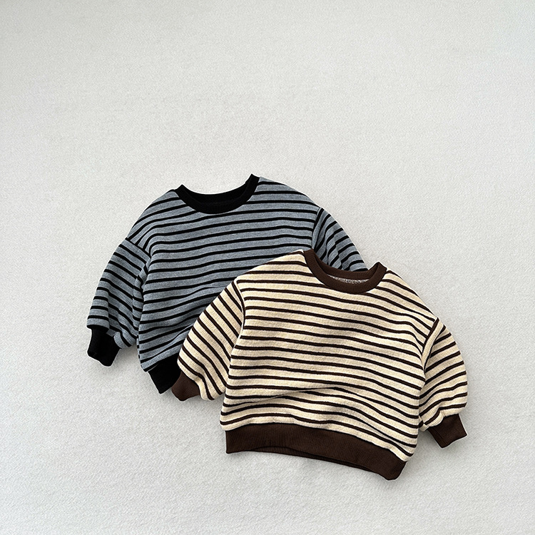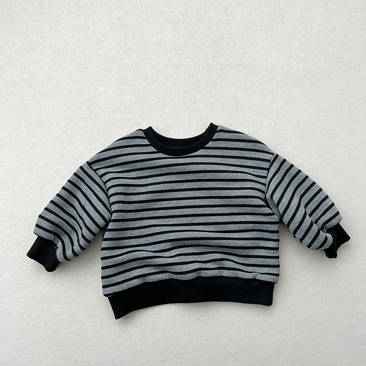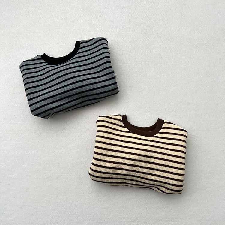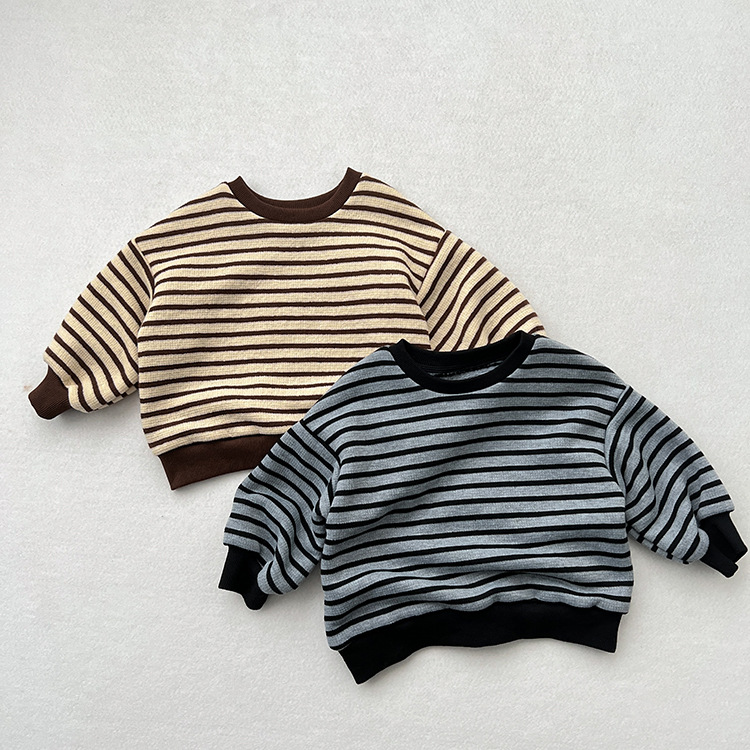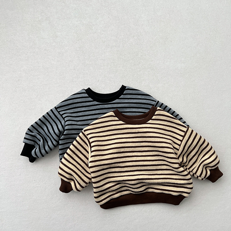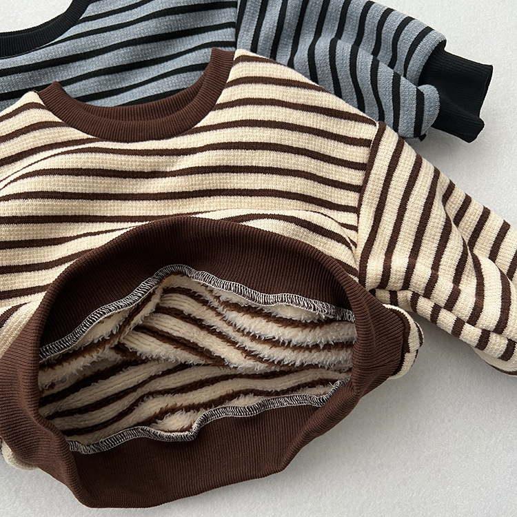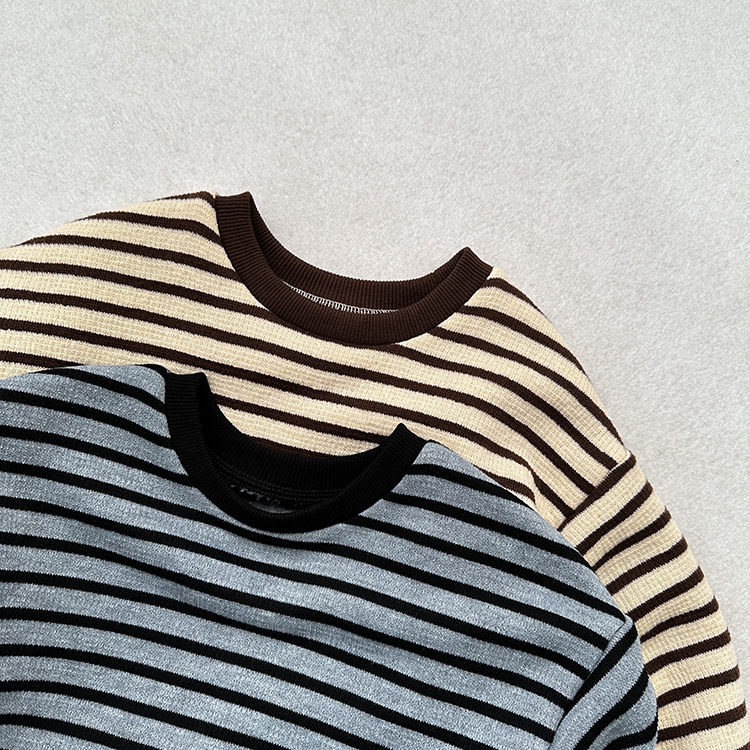 어린이 의류 겨울 새로운 어린이 두꺼운 따뜻한 풀오버 스웨터 소년과 소녀 일본 와플 플러시 스트라이프 탑
