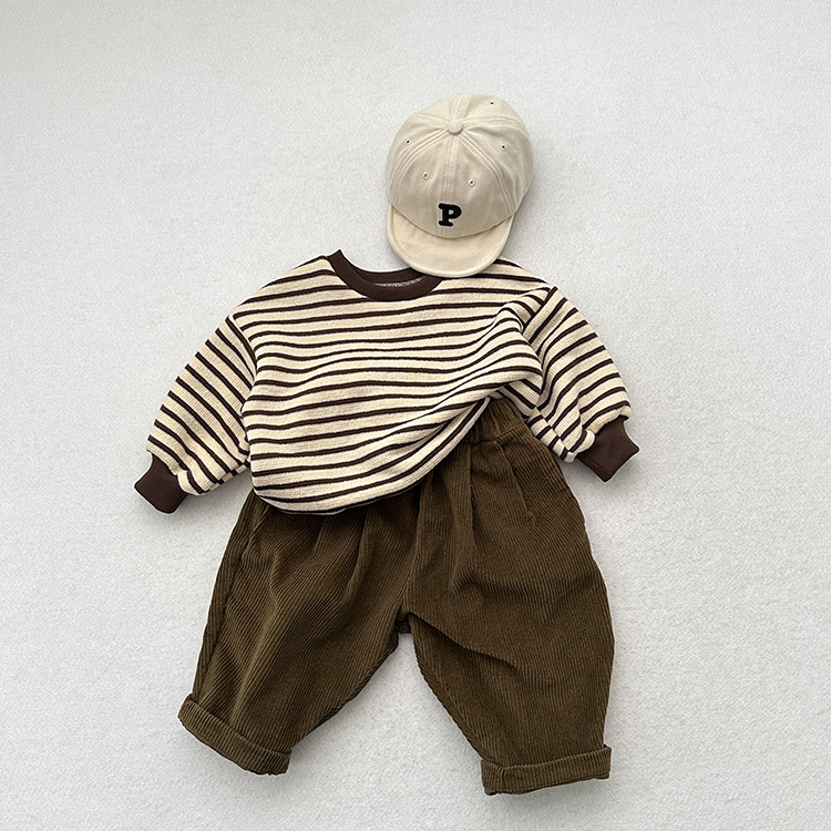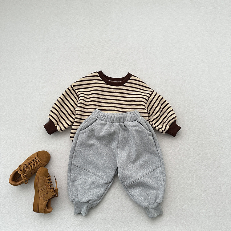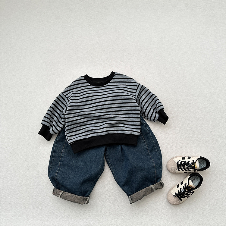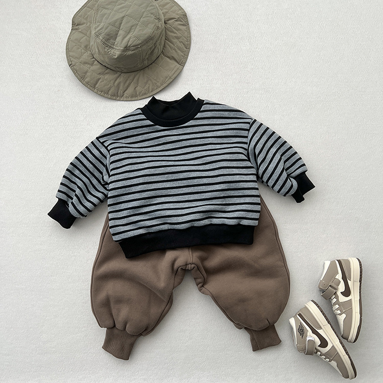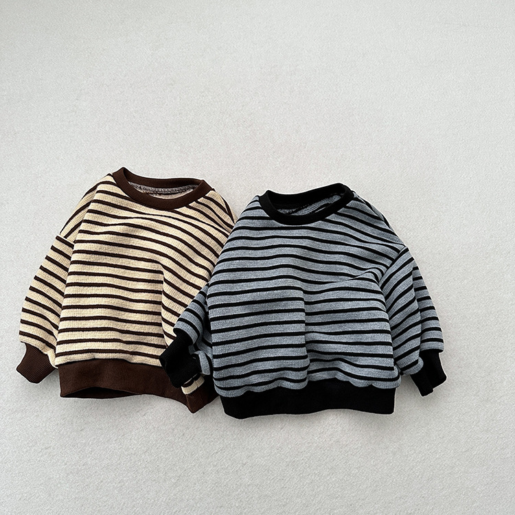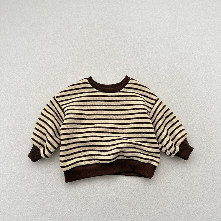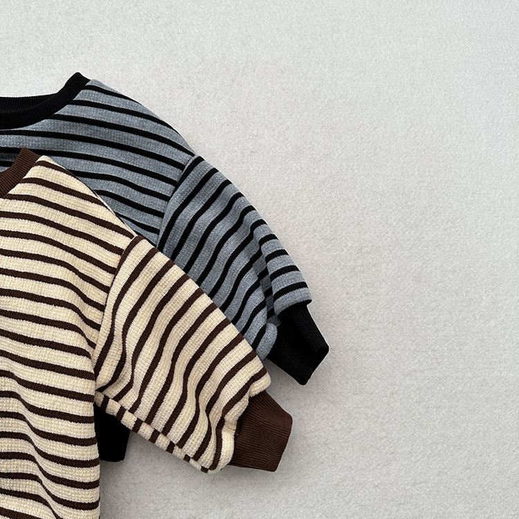 어린이 의류 겨울 새로운 어린이 두꺼운 따뜻한 풀오버 스웨터 소년과 소녀 일본 와플 플러시 스트라이프 탑
