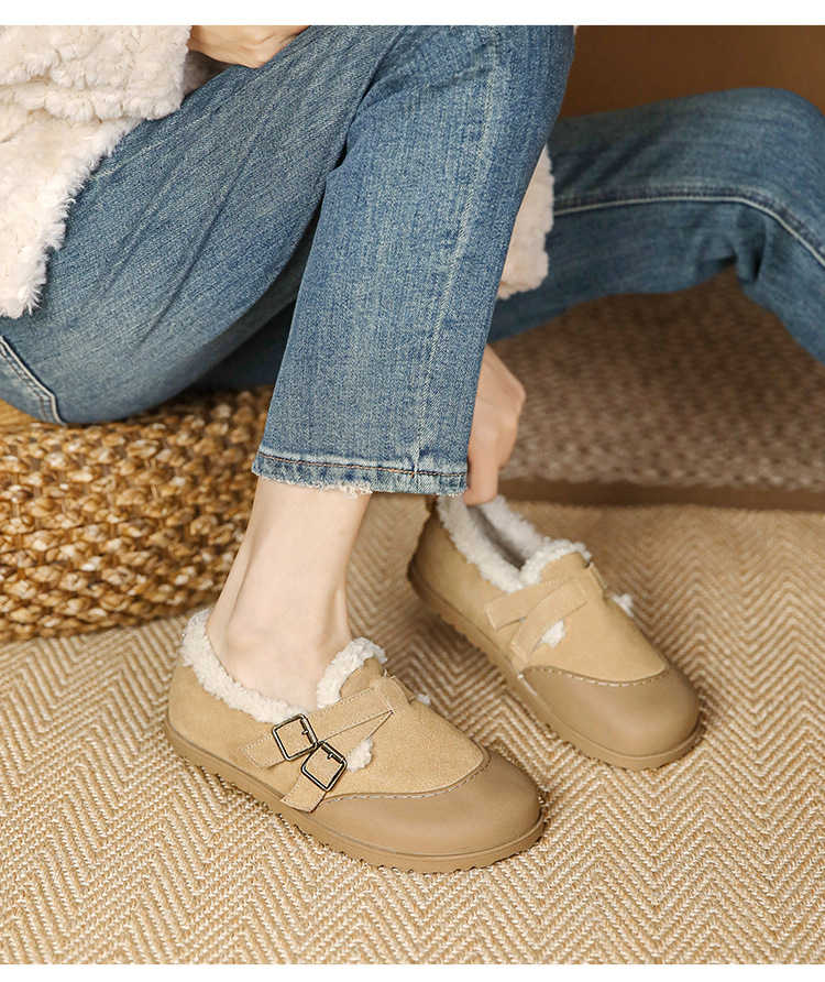 Cowhide 올 매치 플랫 Boken 신발 모피 기모 코튼 신발 2023 새로운 야외 착용 두꺼운 바닥 벨트 버클 캐주얼 신발 여성용스토어 가기