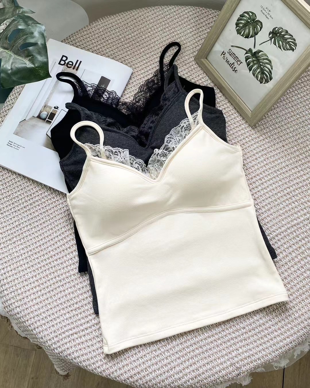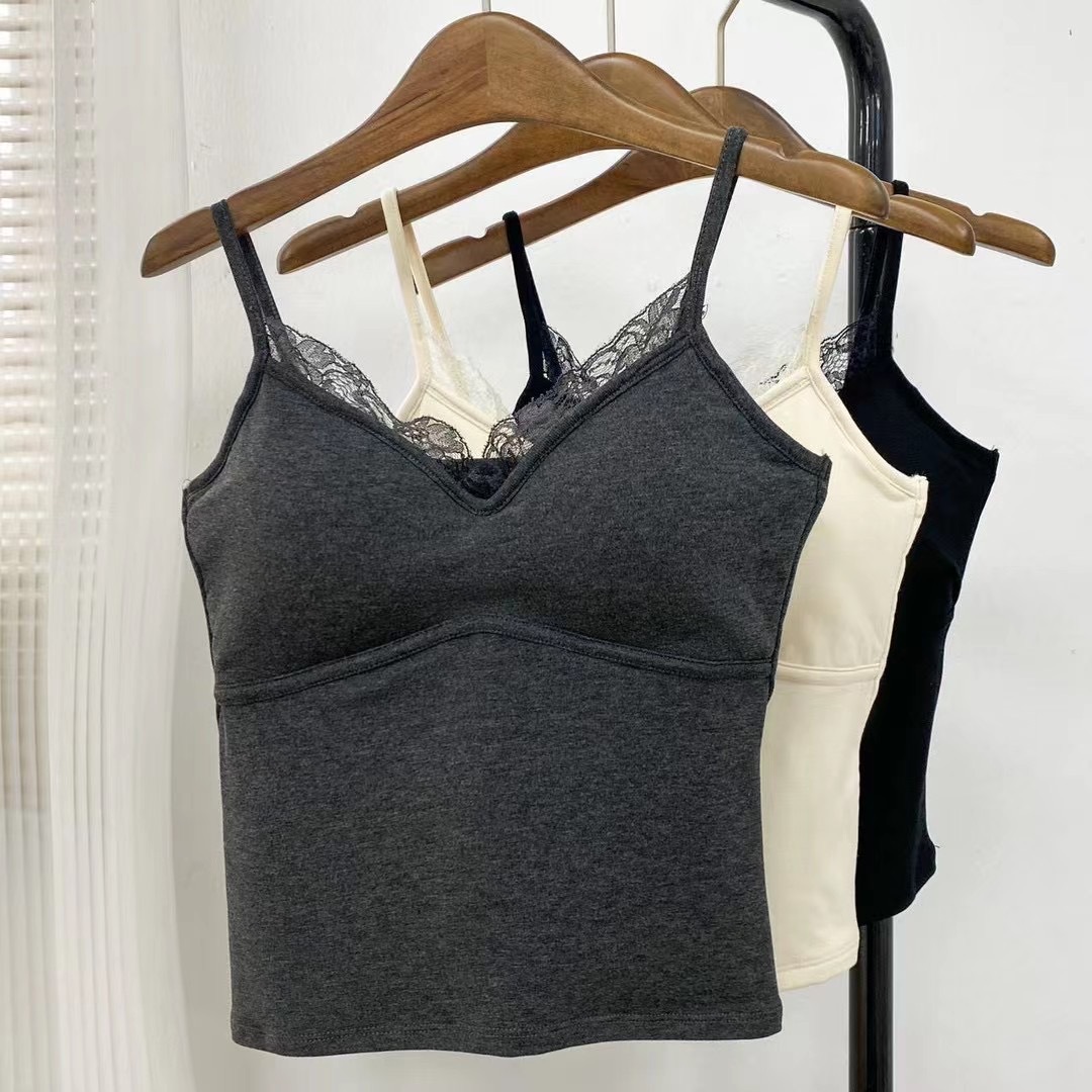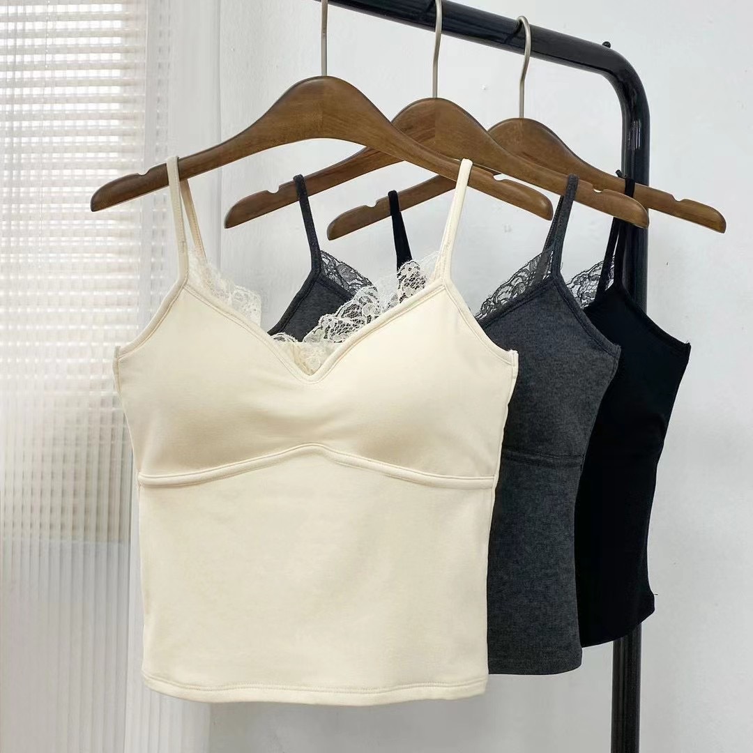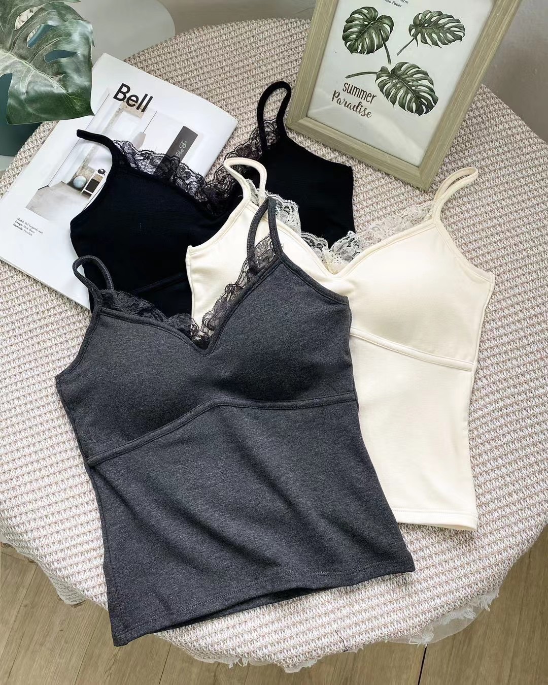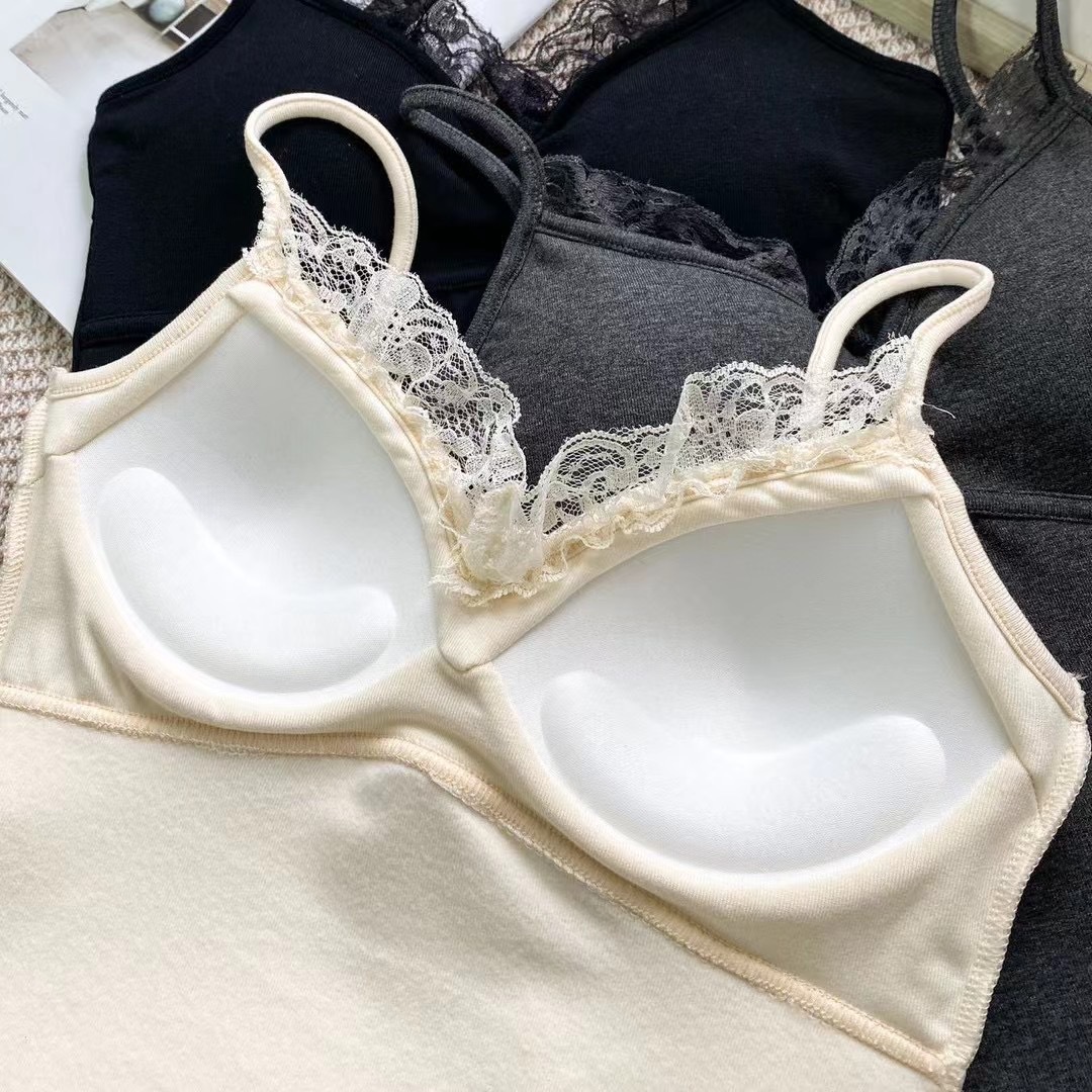 기모 처리된 골지 코튼 민소매 탑, 레이스 배색, 가슴 패드 내장, 패셔너블하고 다용도로 활용 가능한 베이스 레이어, 아웃웨어로도 착용 가능, 아름다운 등 디자인, 여성용 백리스 탑