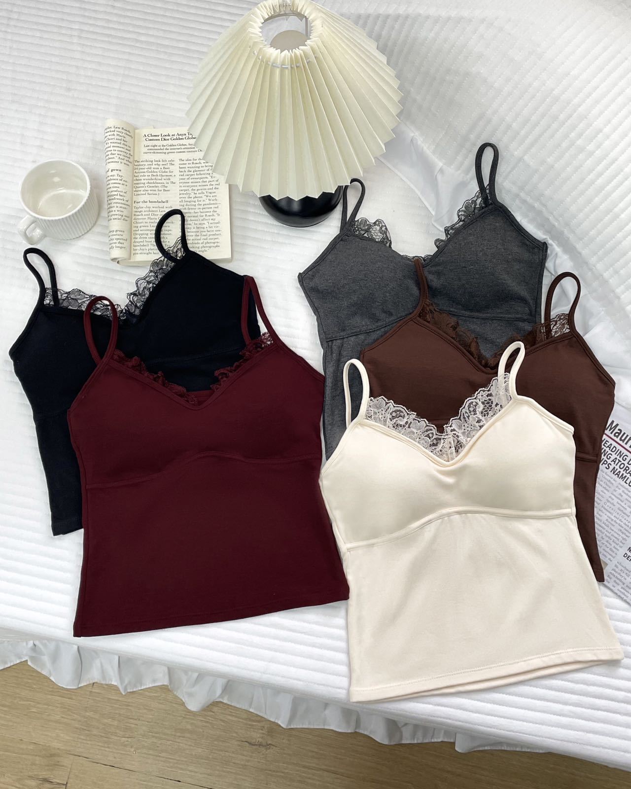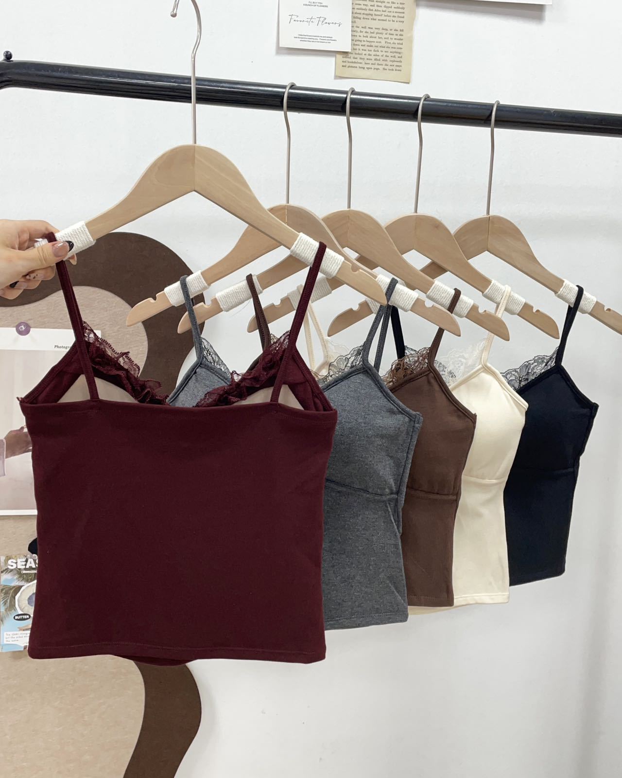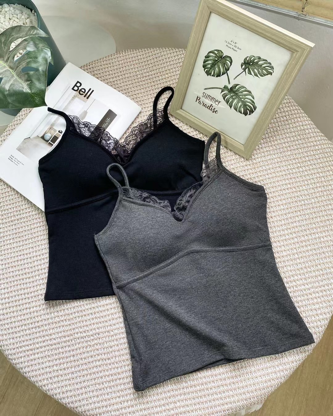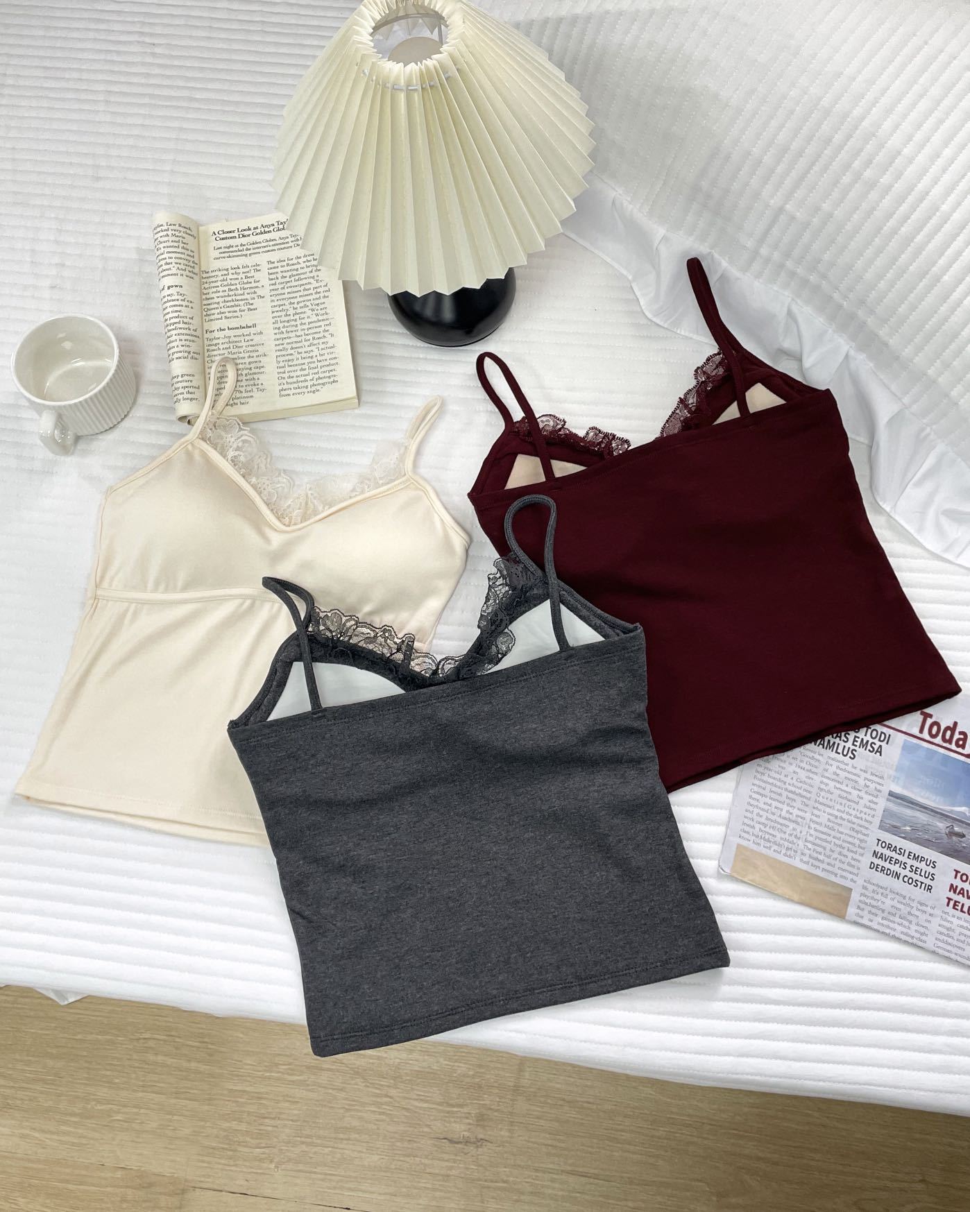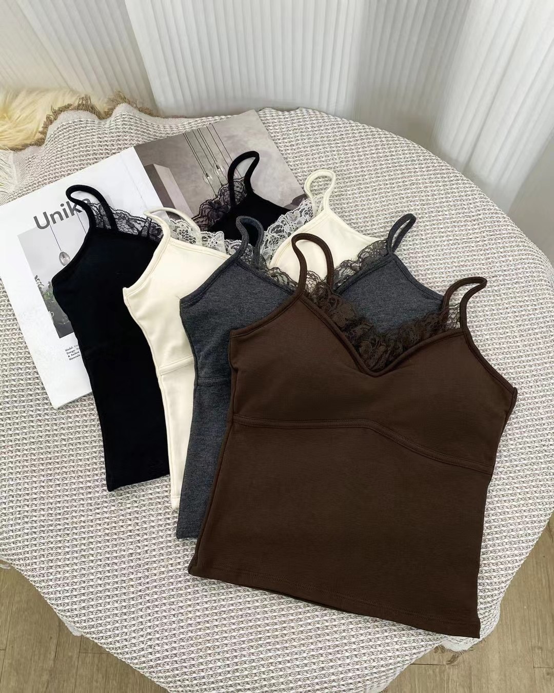 기모 처리된 골지 코튼 민소매 탑, 레이스 배색, 가슴 패드 내장, 패셔너블하고 다용도로 활용 가능한 베이스 레이어, 아웃웨어로도 착용 가능, 아름다운 등 디자인, 여성용 백리스 탑