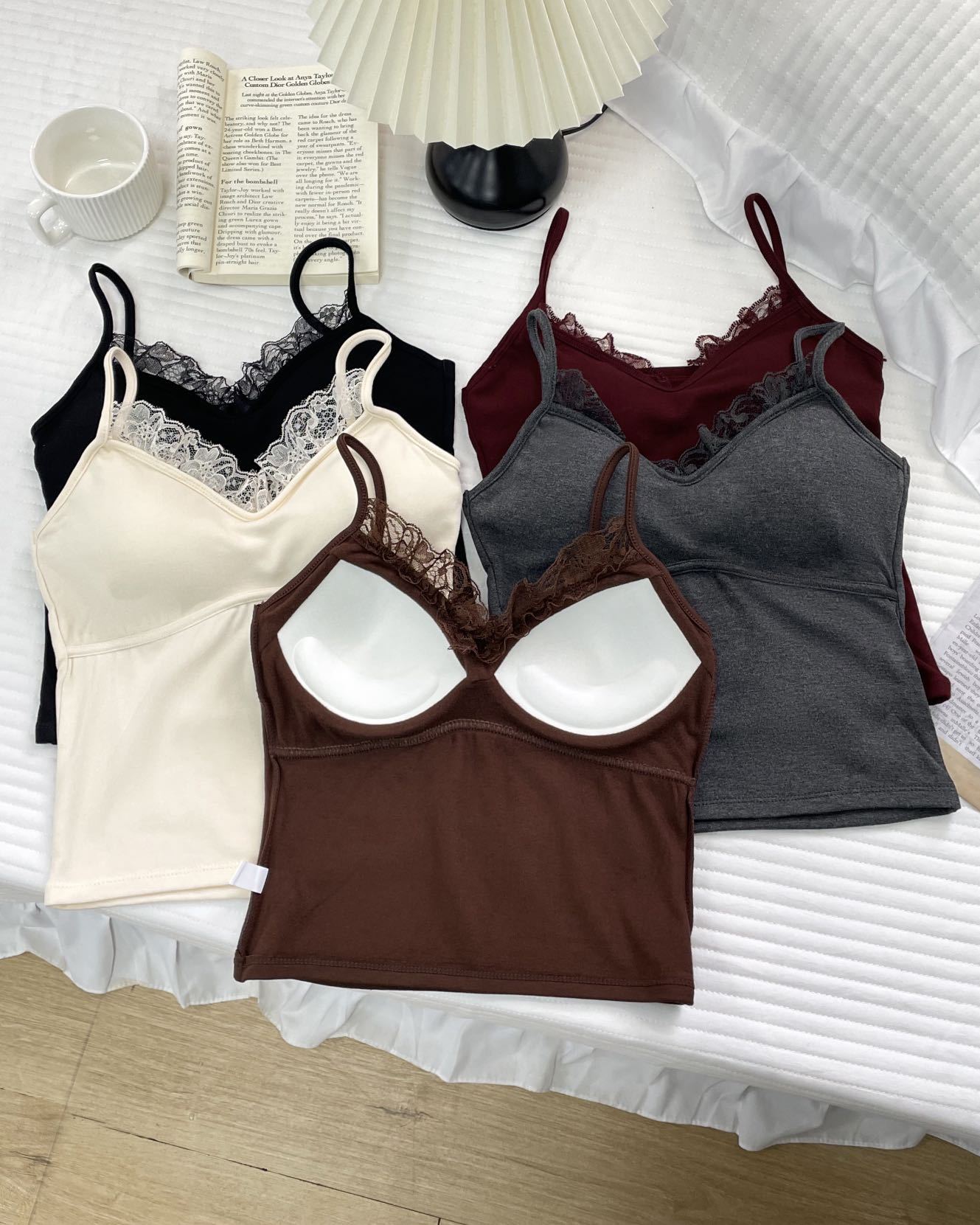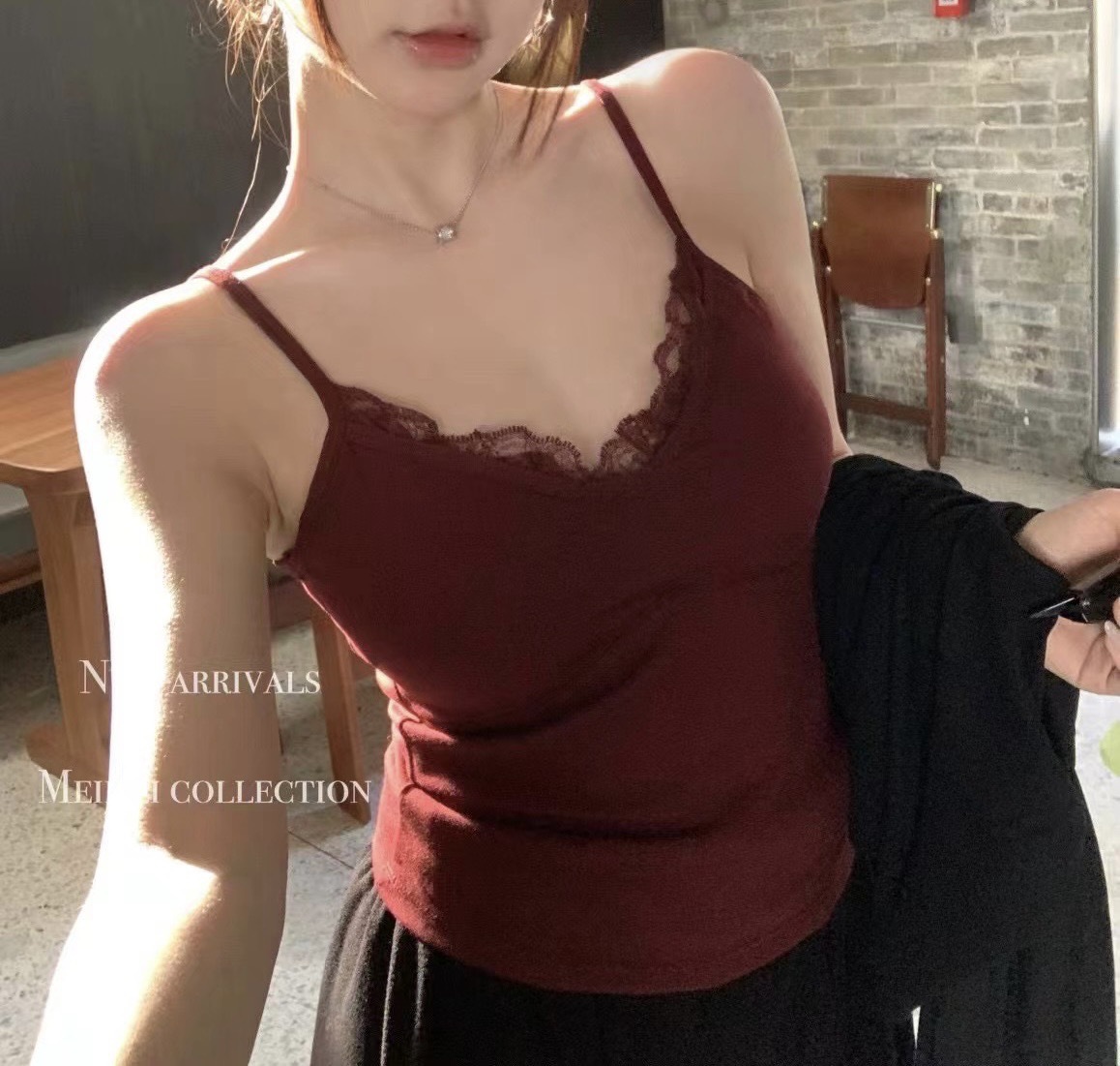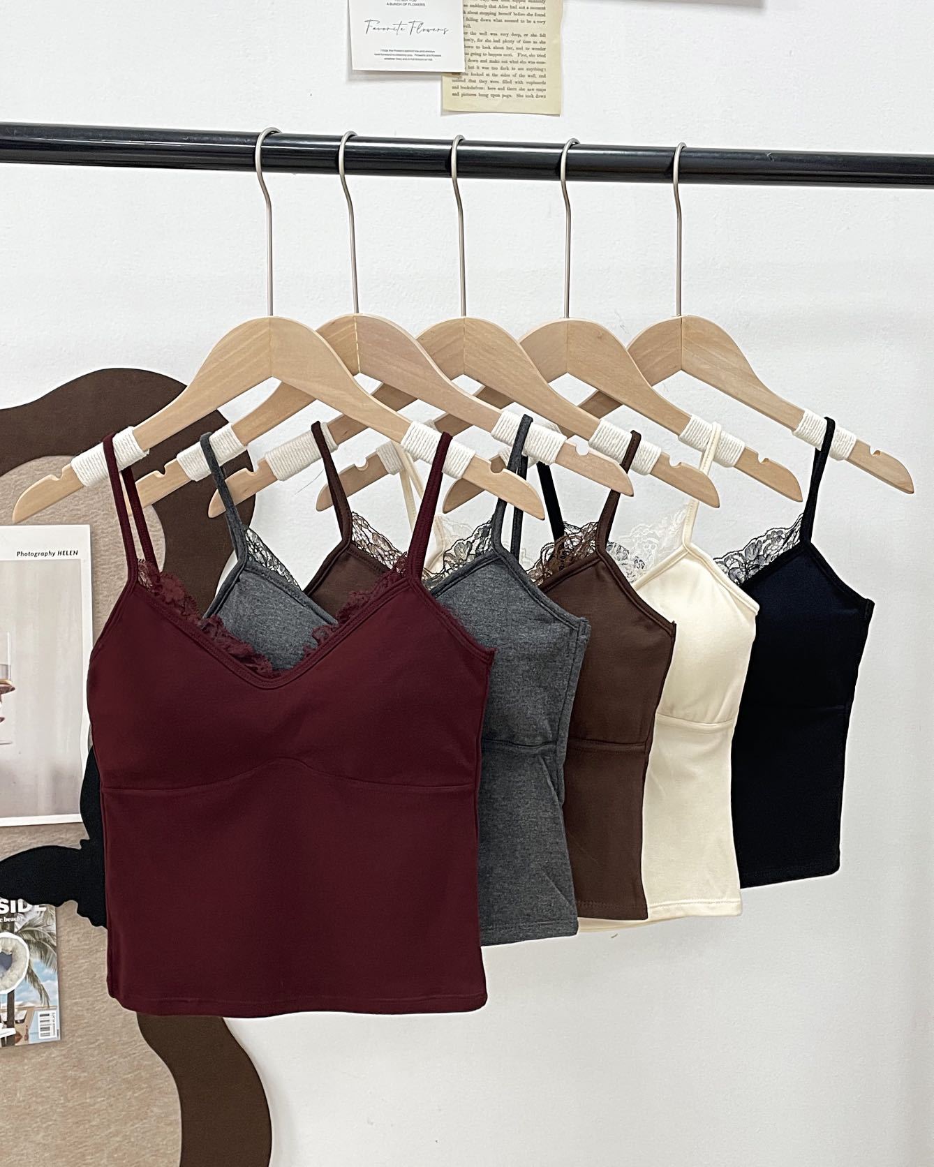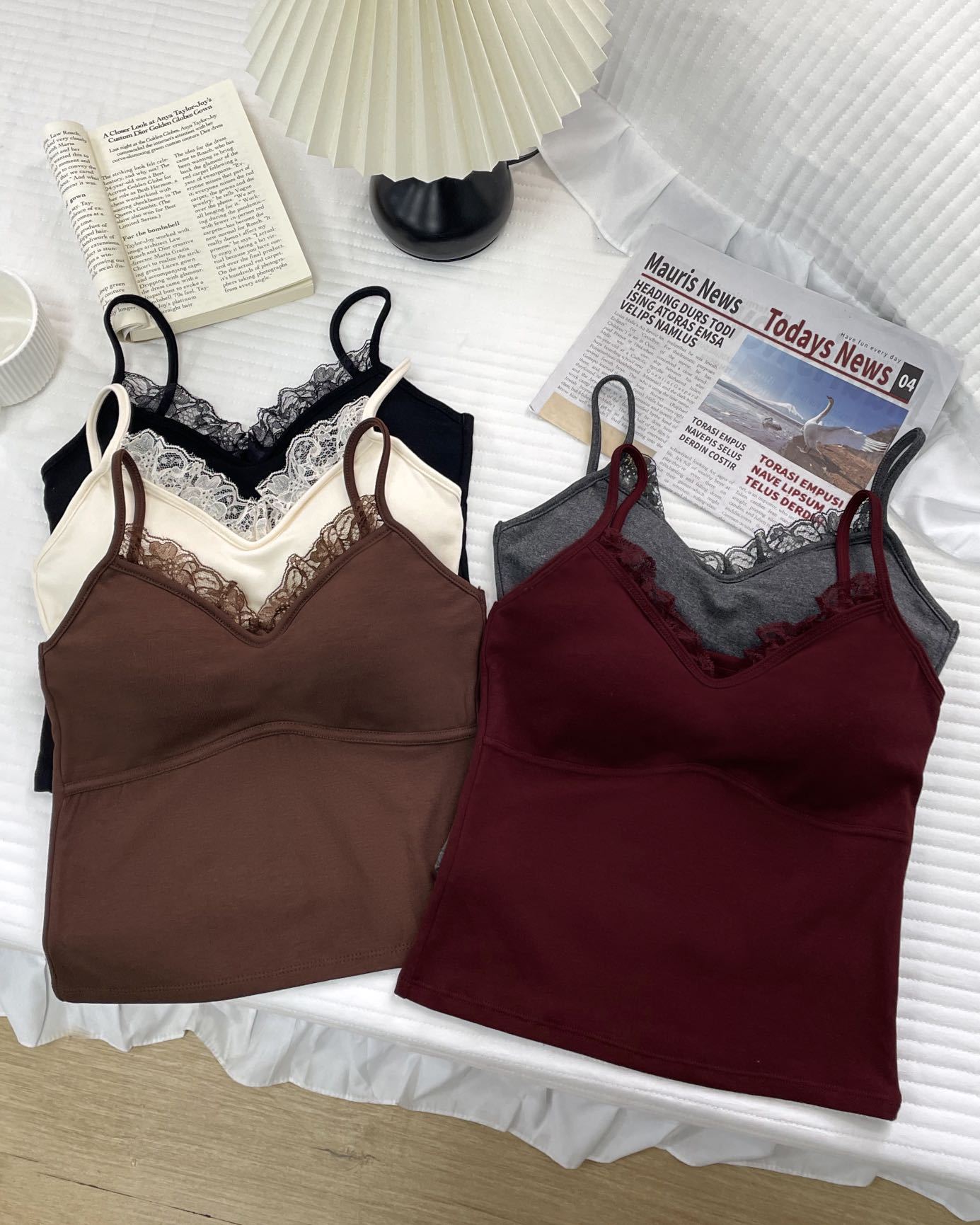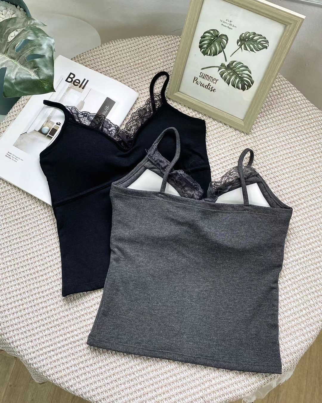 기모 처리된 골지 코튼 민소매 탑, 레이스 배색, 가슴 패드 내장, 패셔너블하고 다용도로 활용 가능한 베이스 레이어, 아웃웨어로도 착용 가능, 아름다운 등 디자인, 여성용 백리스 탑