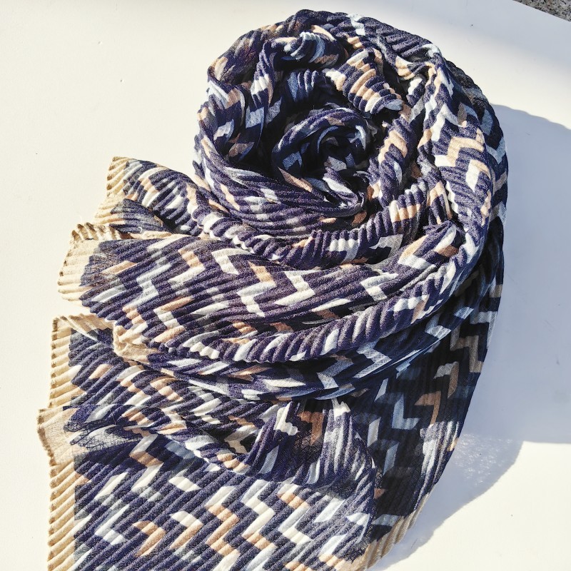 韩版新款文艺百搭压皱围巾女士蓝白条纹褶皱巴厘纱保暖披肩围巾