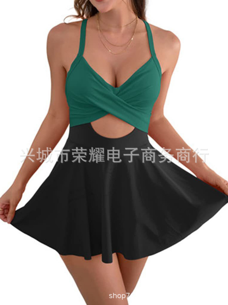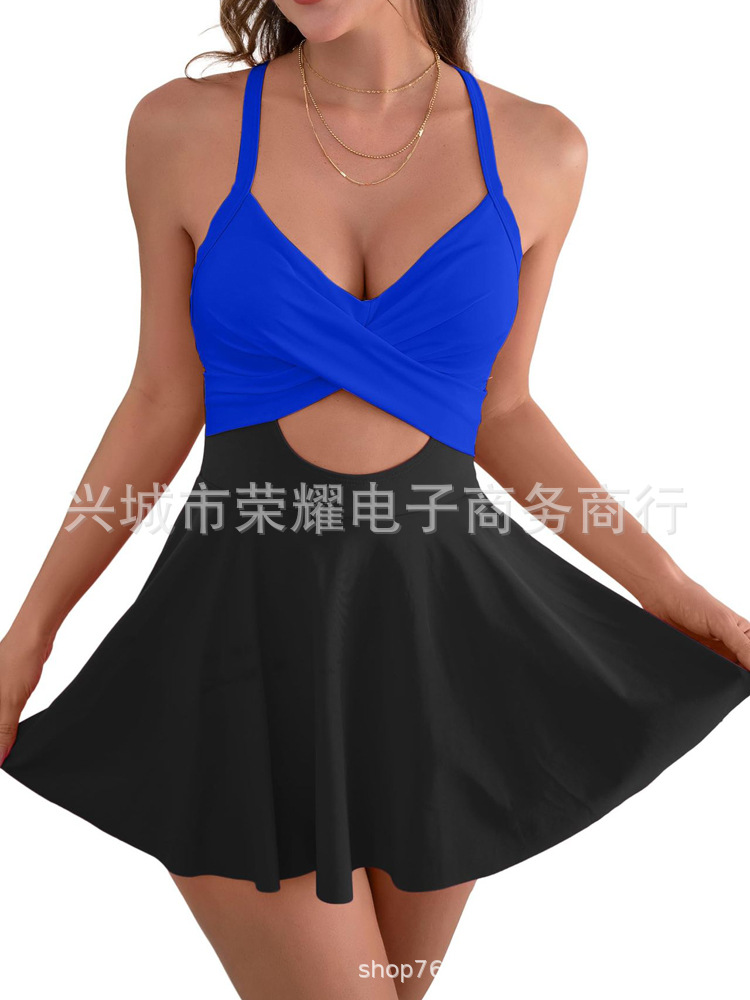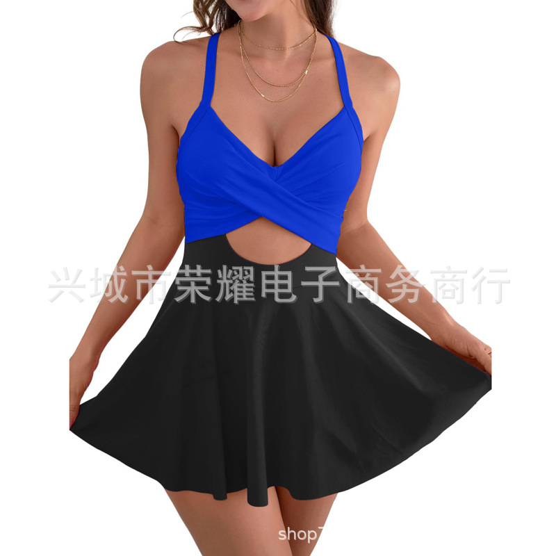 새로운 유럽과 미국의 대외 무역 아마존 국경 원피스 수영복 여성 배색 크로스 대형 원피스 서스펜더 스커트 2024스토어 가기