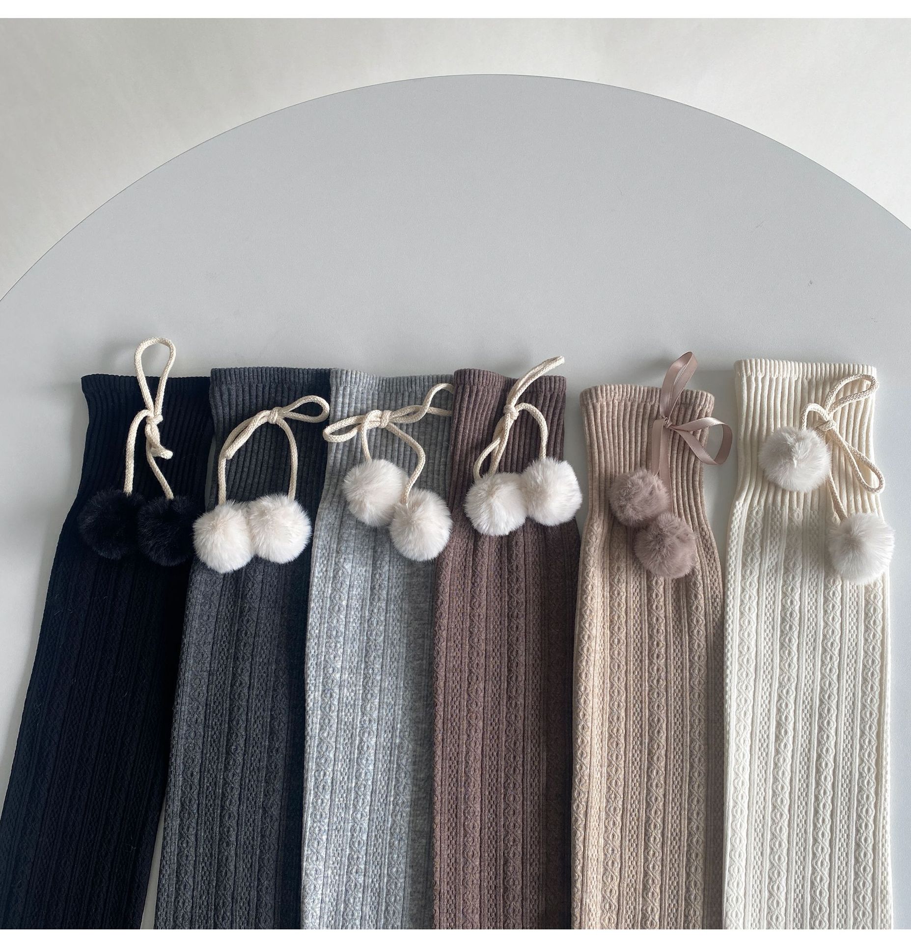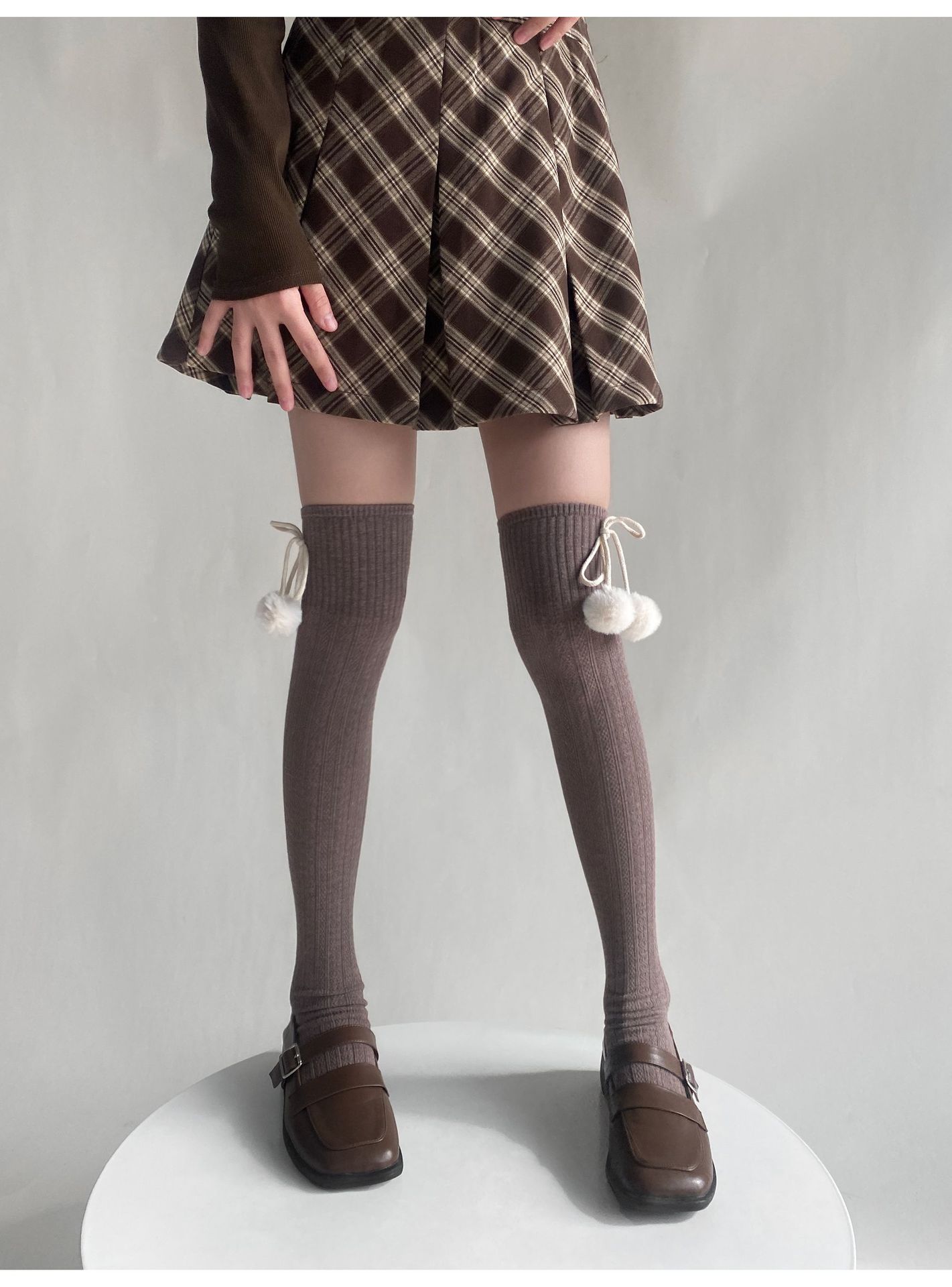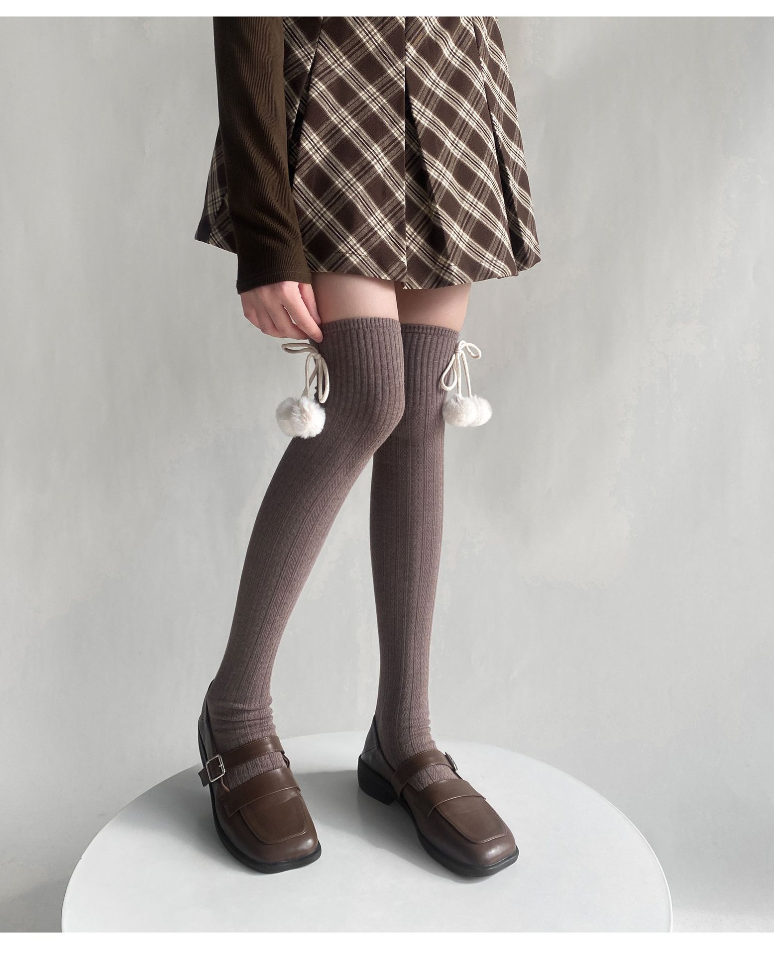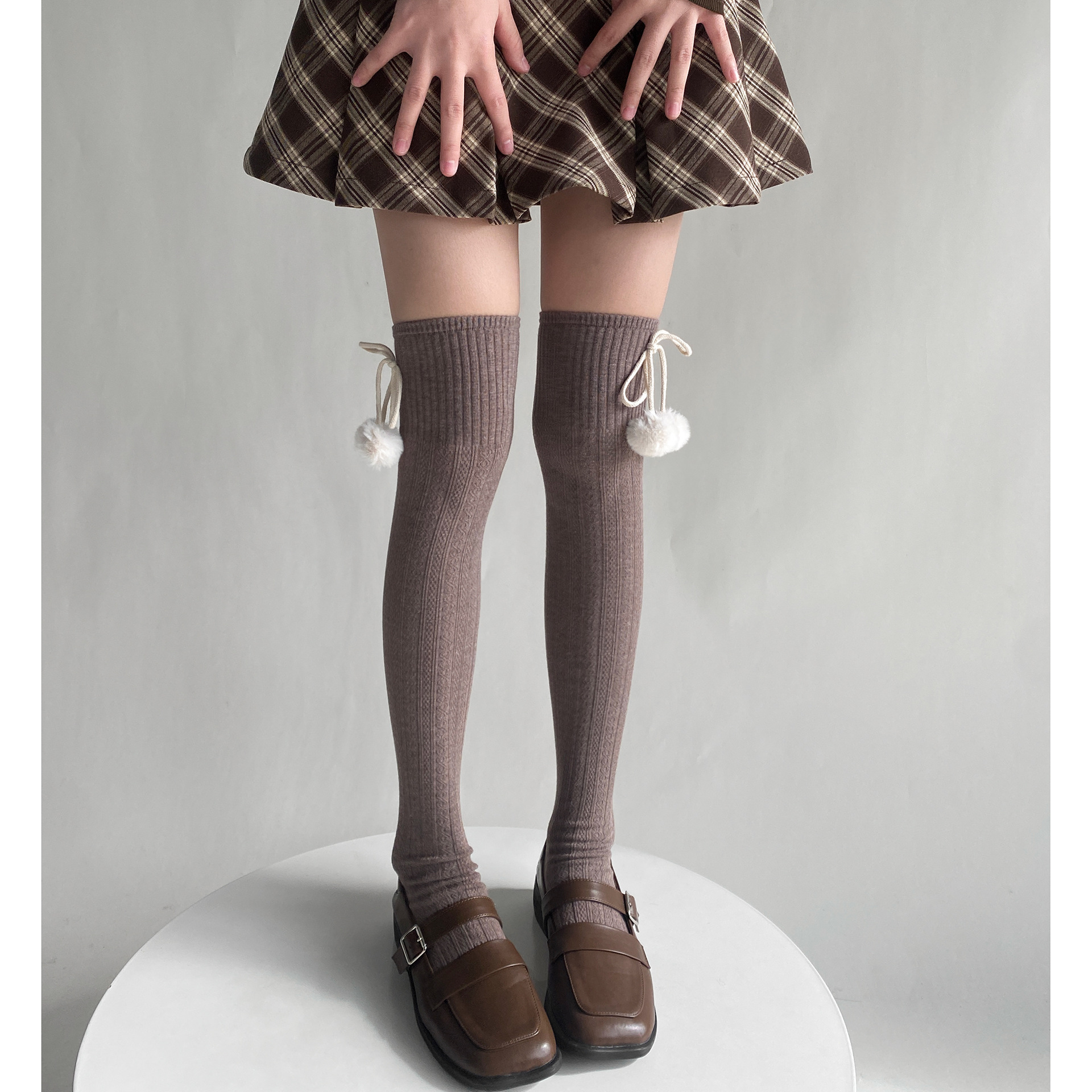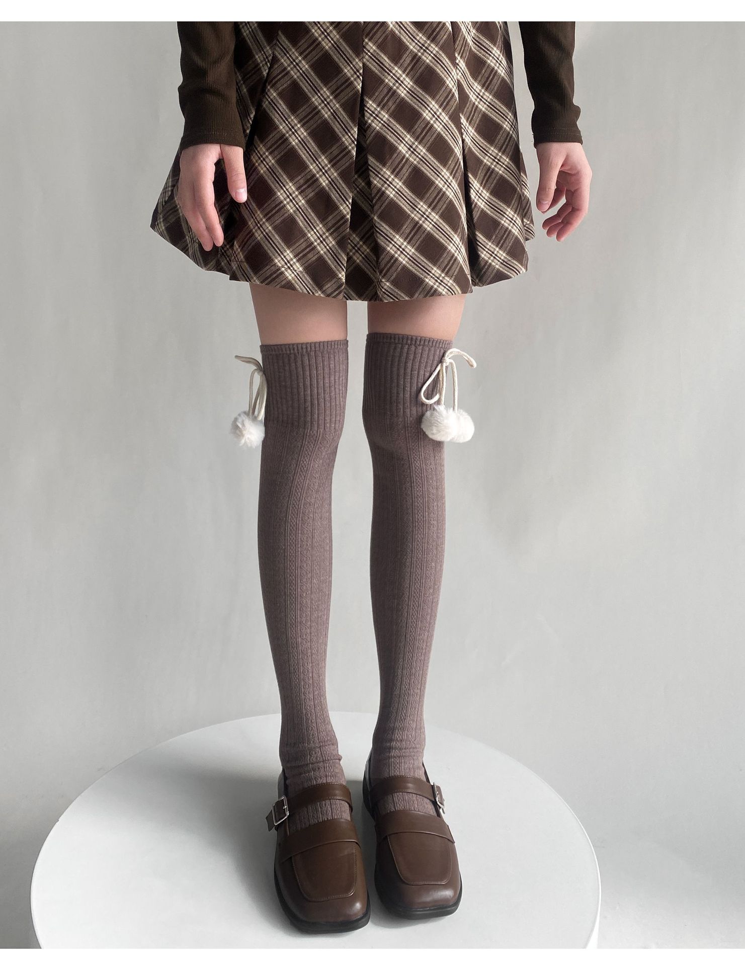 가을과 겨울 플러시 귀여운 큰 모피 공 레이스 업 무릎 양말 여성의 일본 트위스트 하이 양말 다크 브라운 스타킹 올 매치