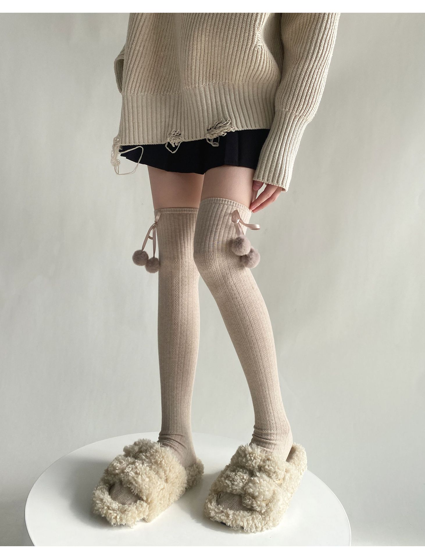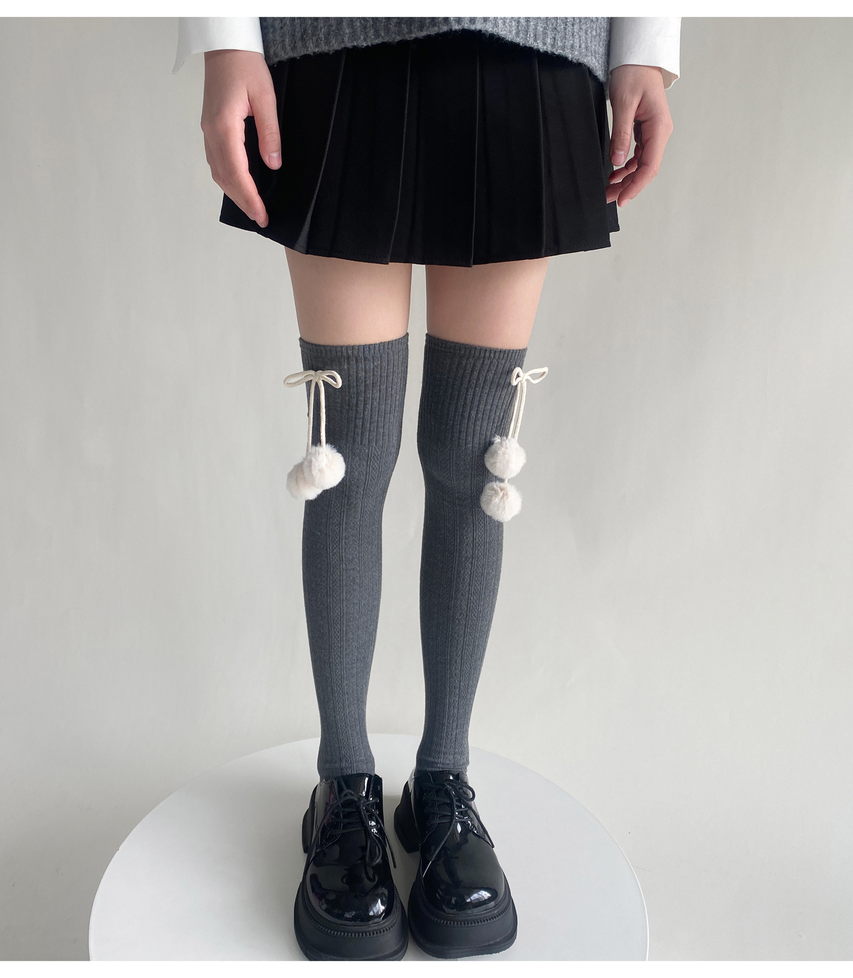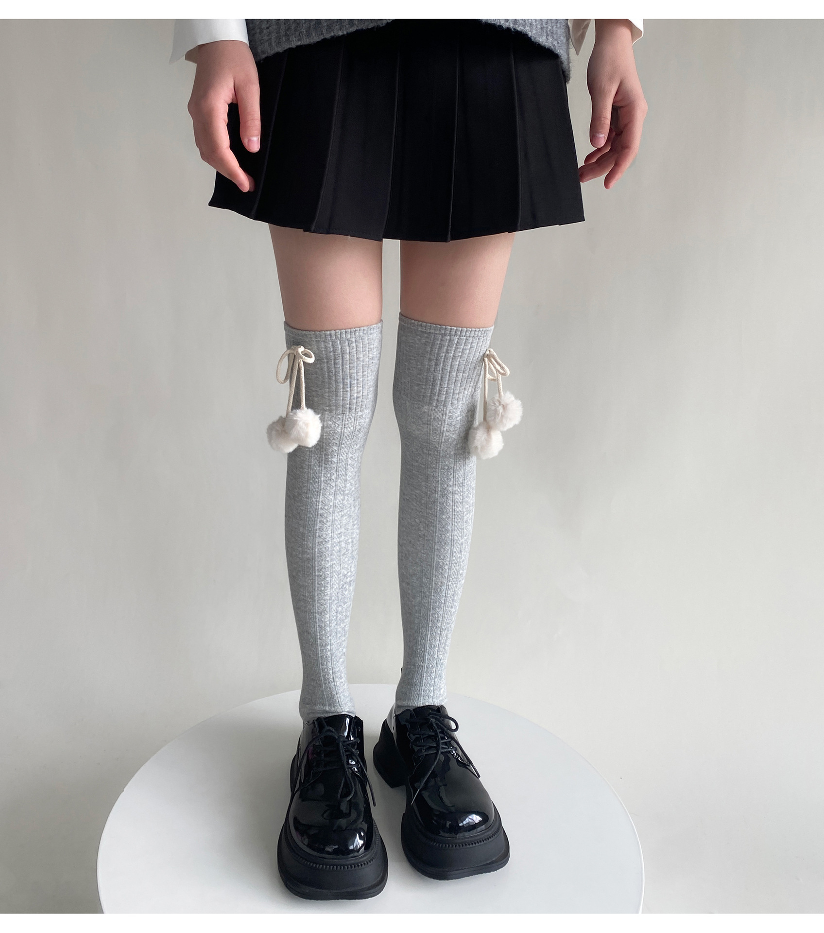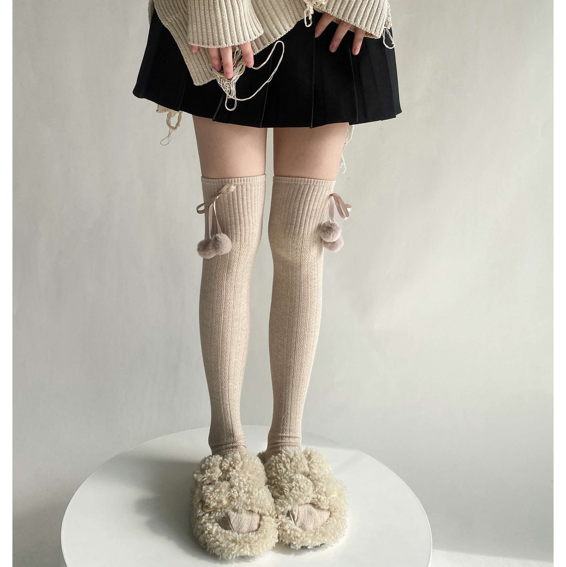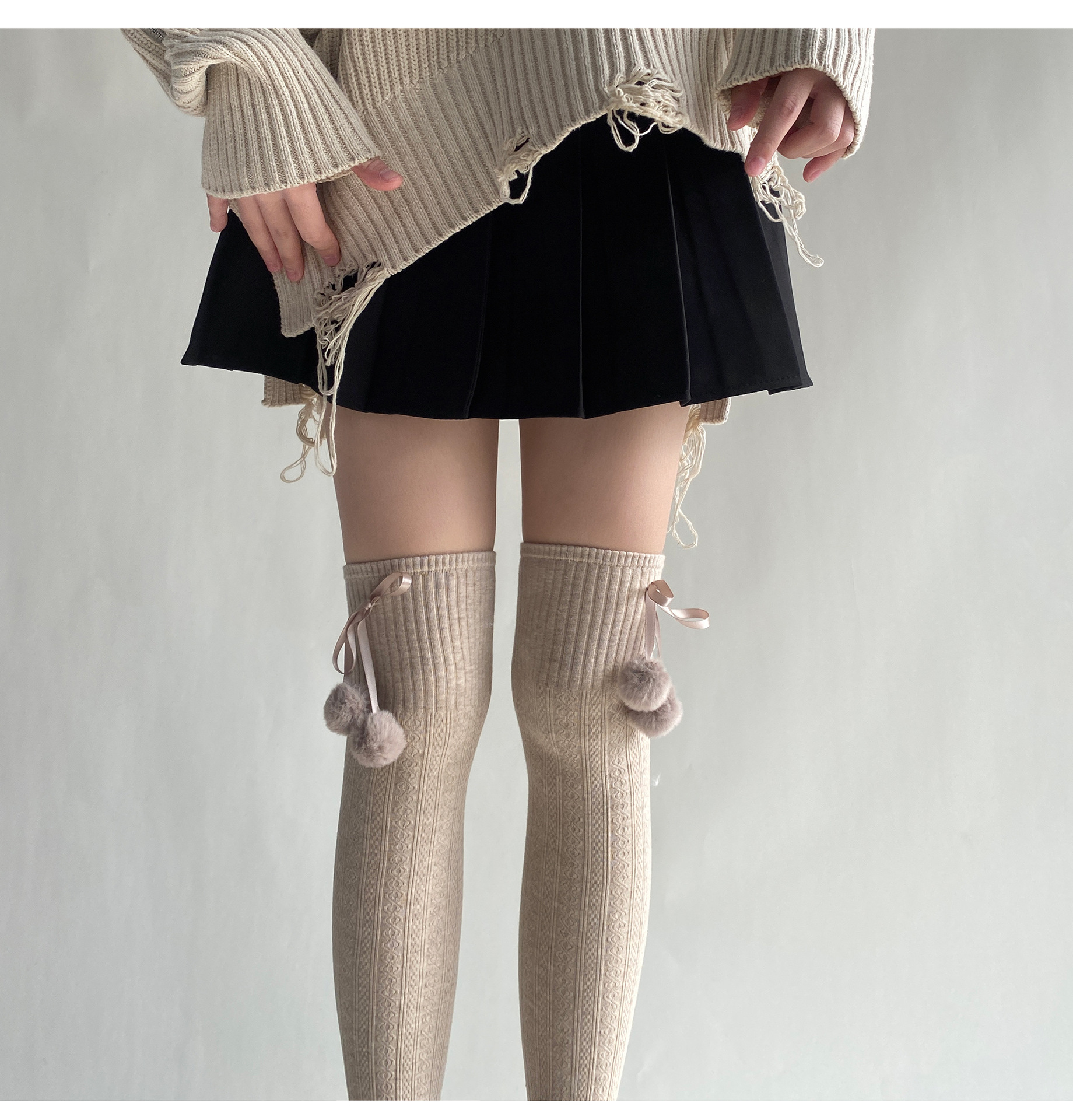 가을과 겨울 플러시 귀여운 큰 모피 공 레이스 업 무릎 양말 여성의 일본 트위스트 하이 양말 다크 브라운 스타킹 올 매치