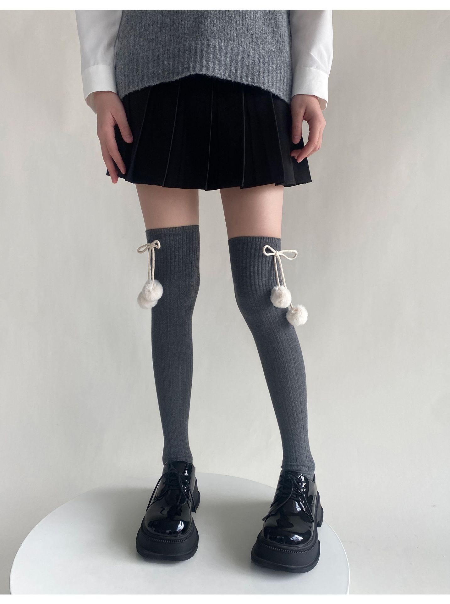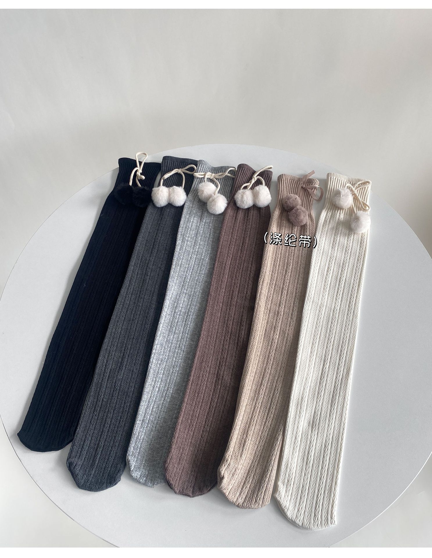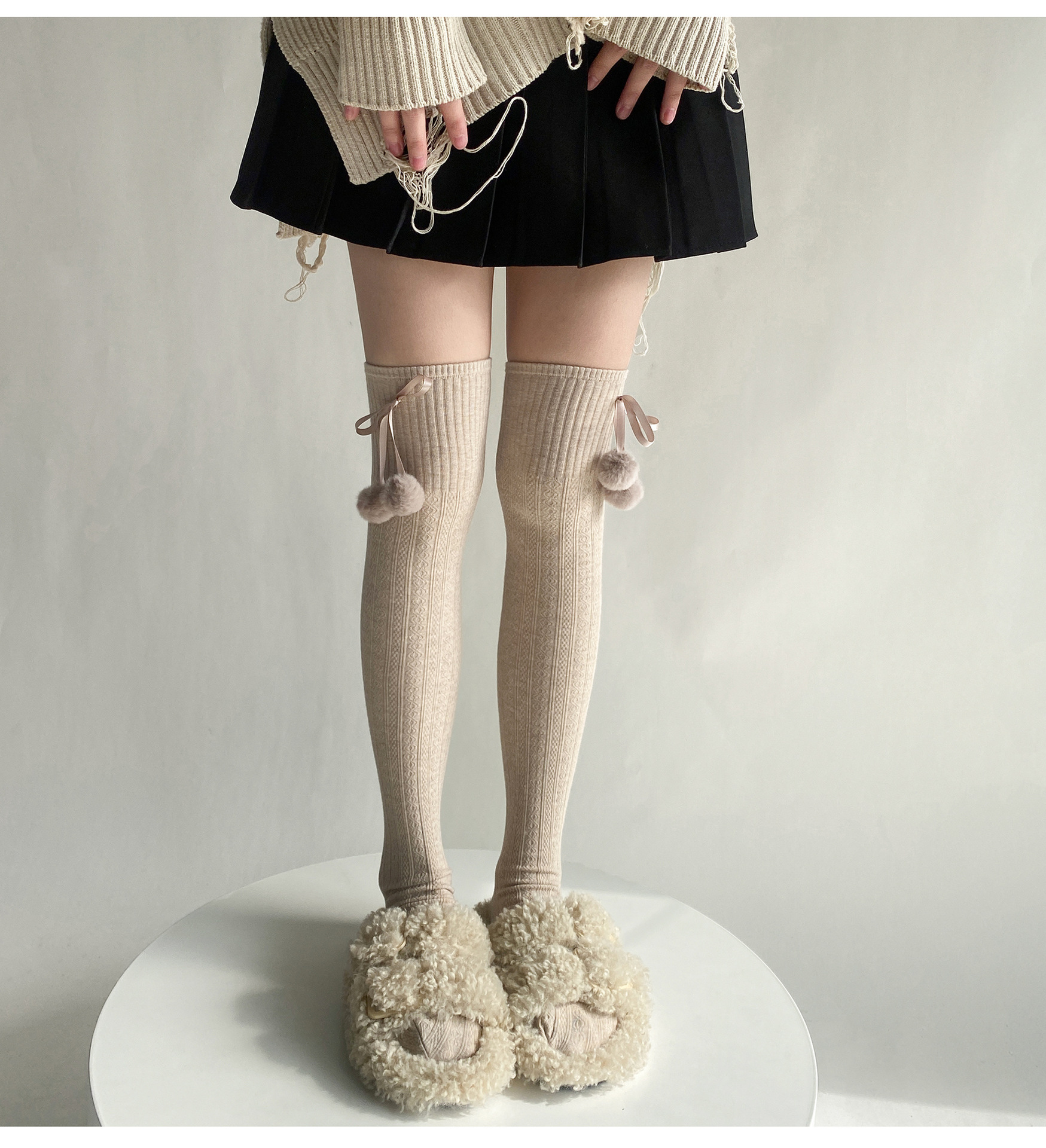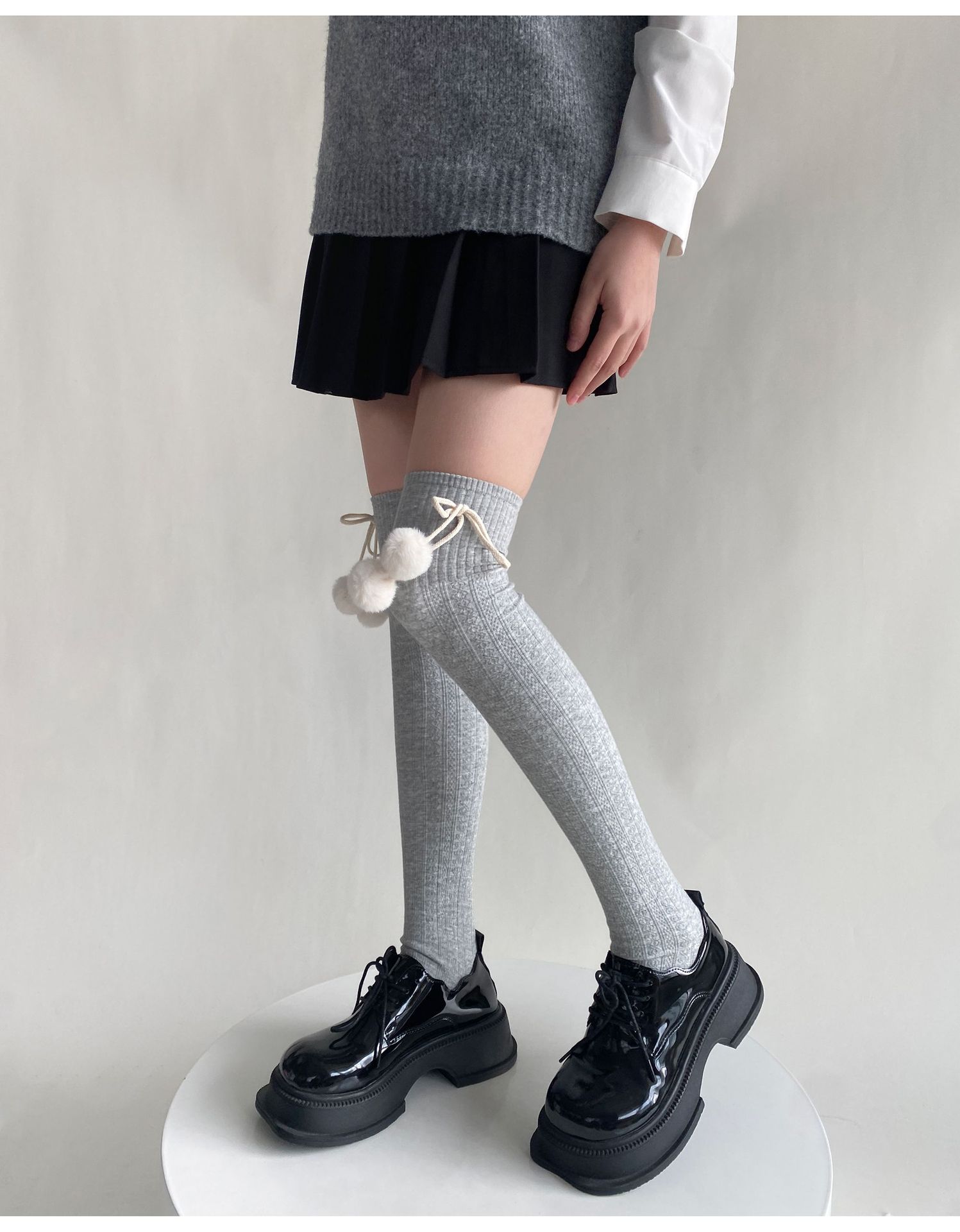 가을과 겨울 플러시 귀여운 큰 모피 공 레이스 업 무릎 양말 여성의 일본 트위스트 하이 양말 다크 브라운 스타킹 올 매치