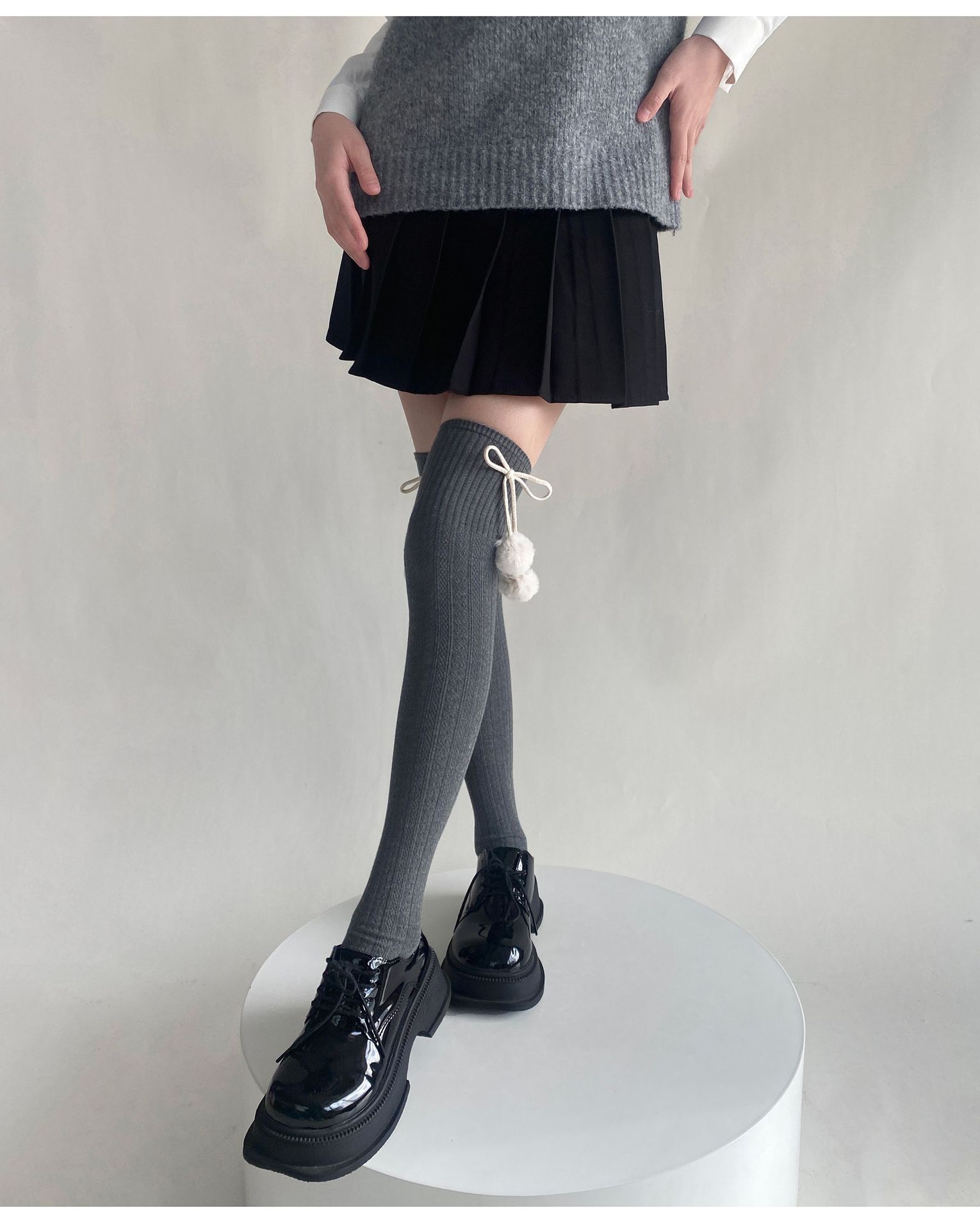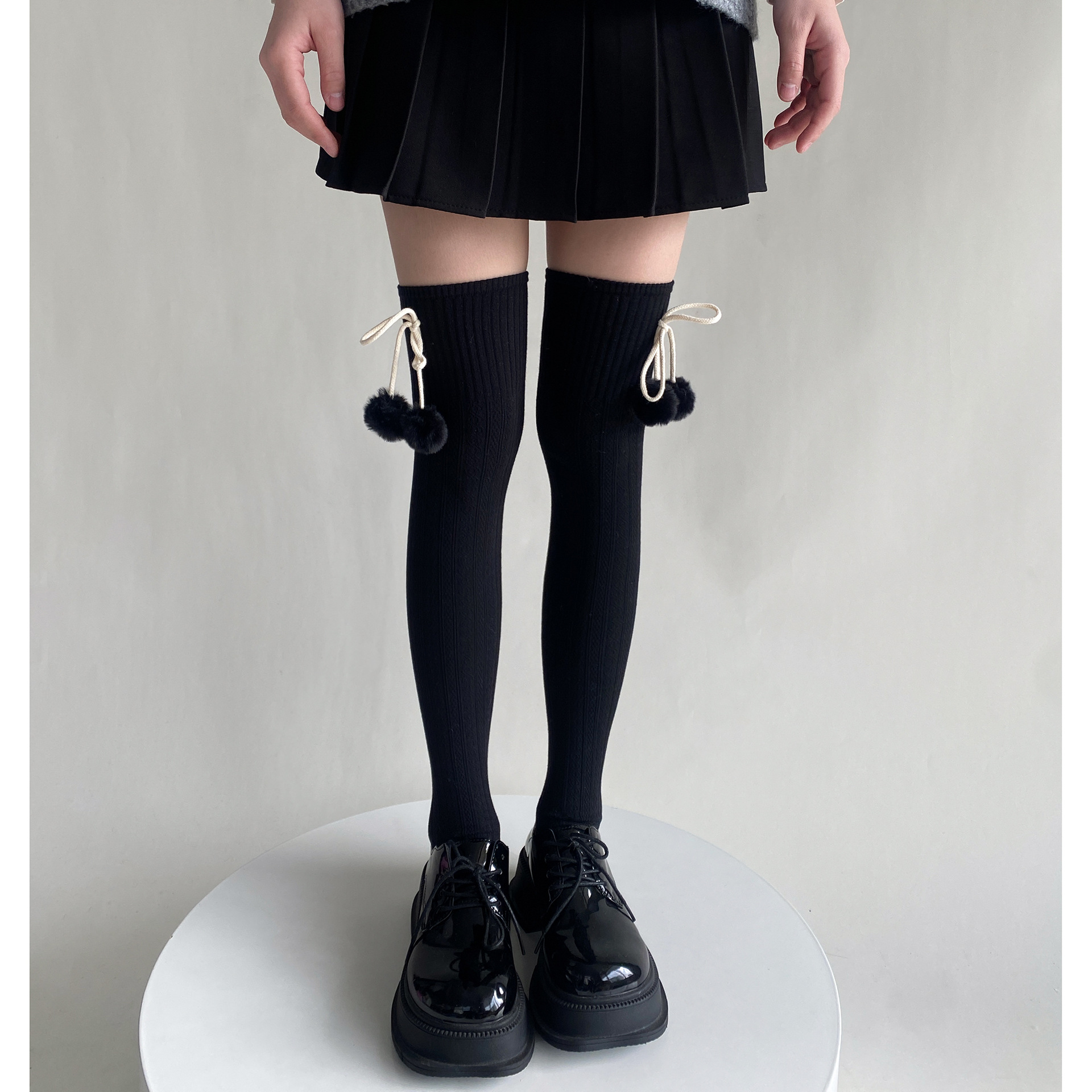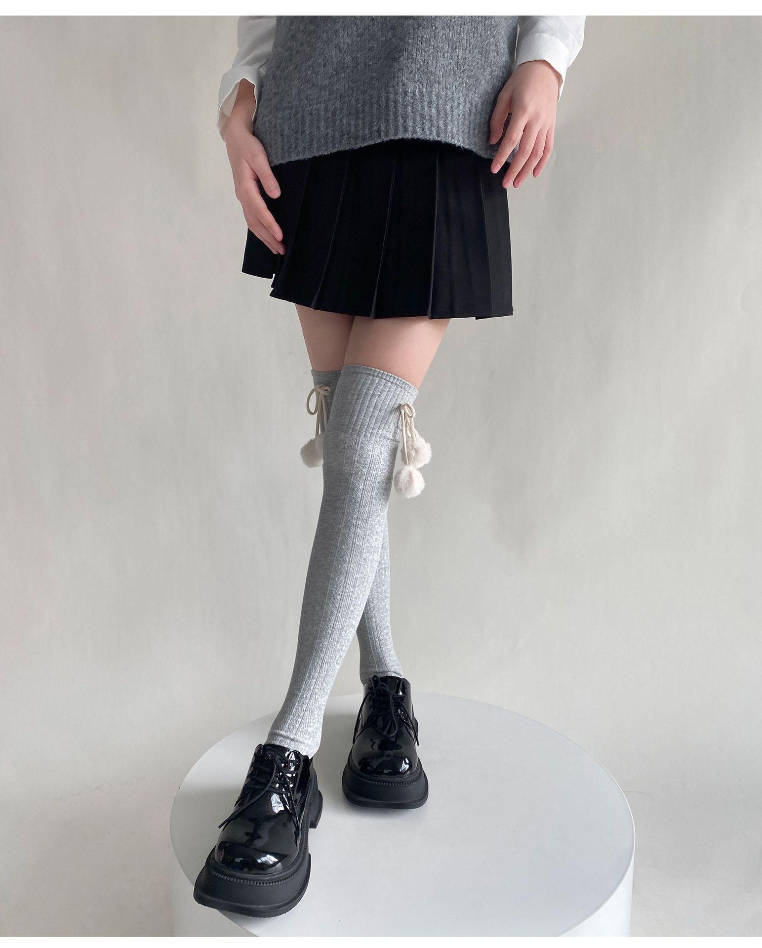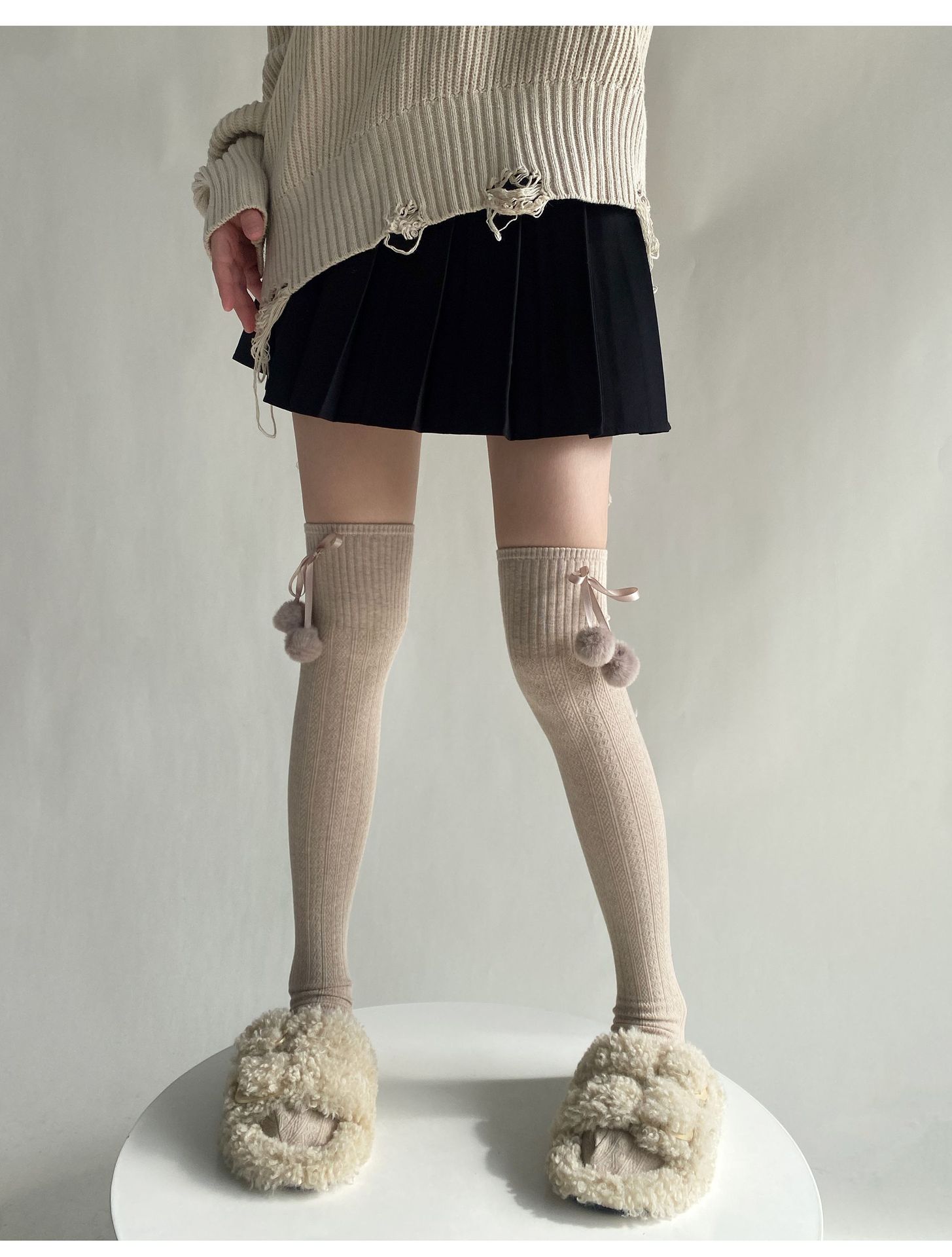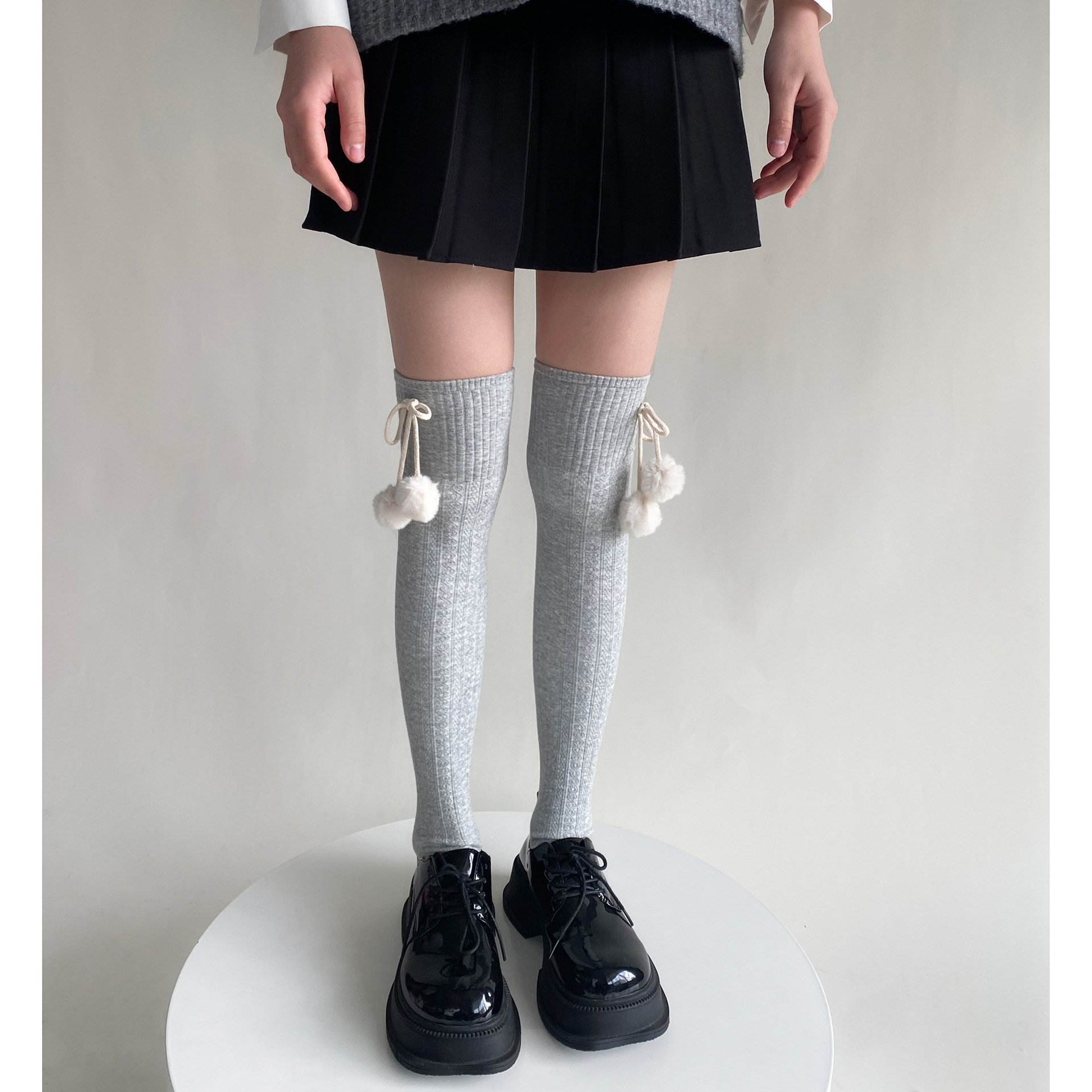 가을과 겨울 플러시 귀여운 큰 모피 공 레이스 업 무릎 양말 여성의 일본 트위스트 하이 양말 다크 브라운 스타킹 올 매치