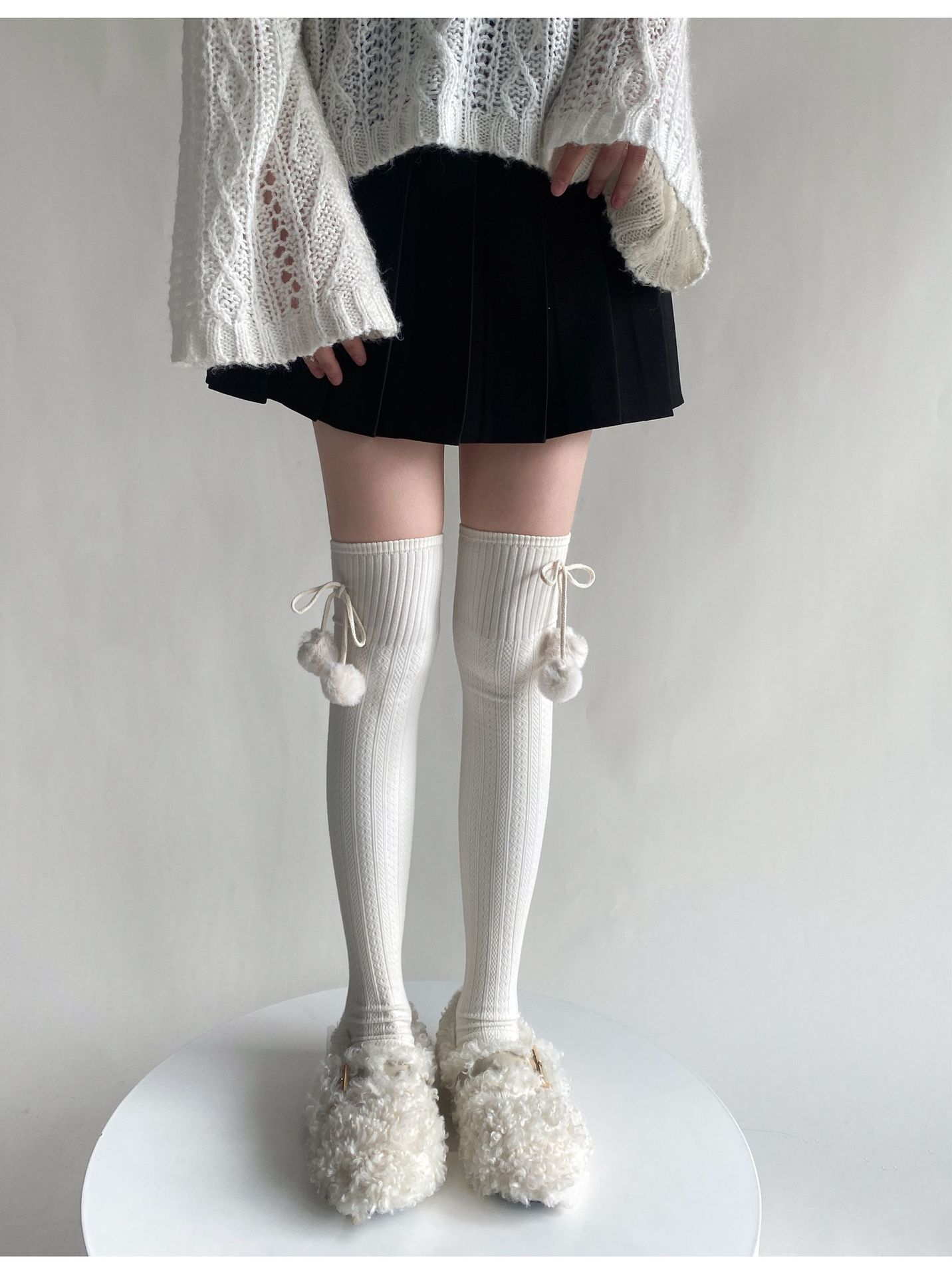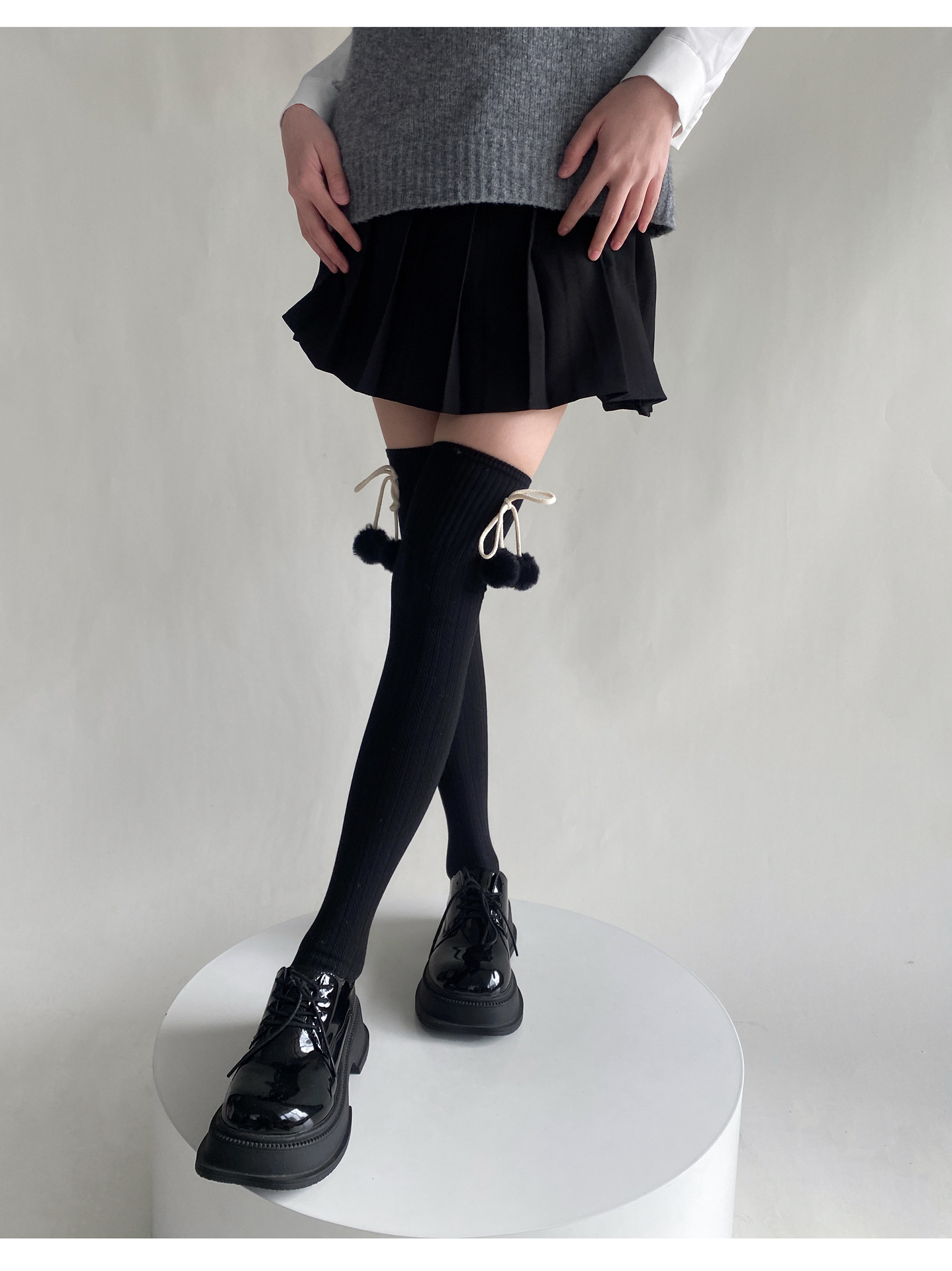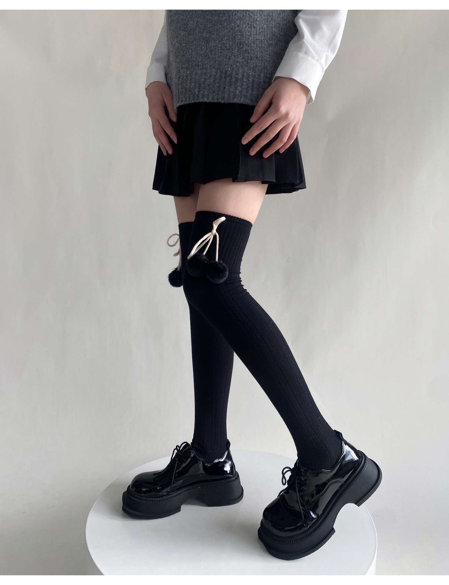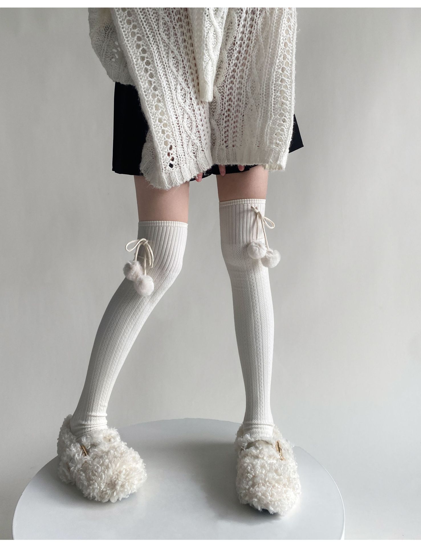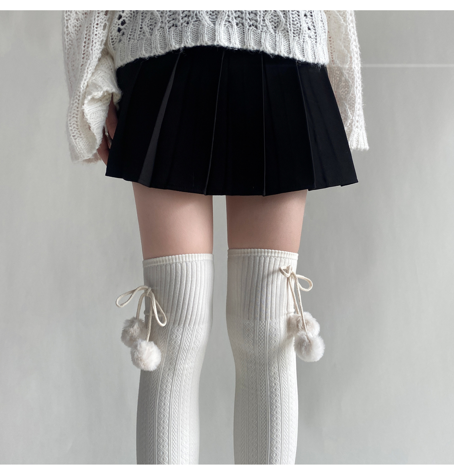 가을과 겨울 플러시 귀여운 큰 모피 공 레이스 업 무릎 양말 여성의 일본 트위스트 하이 양말 다크 브라운 스타킹 올 매치