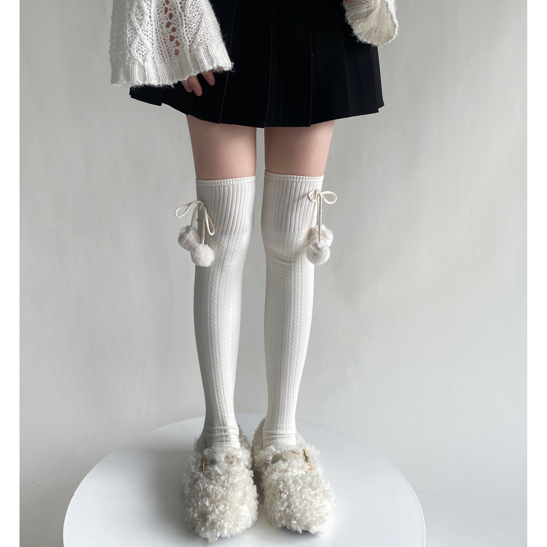 가을과 겨울 플러시 귀여운 큰 모피 공 레이스 업 무릎 양말 여성의 일본 트위스트 하이 양말 다크 브라운 스타킹 올 매치스토어 가기