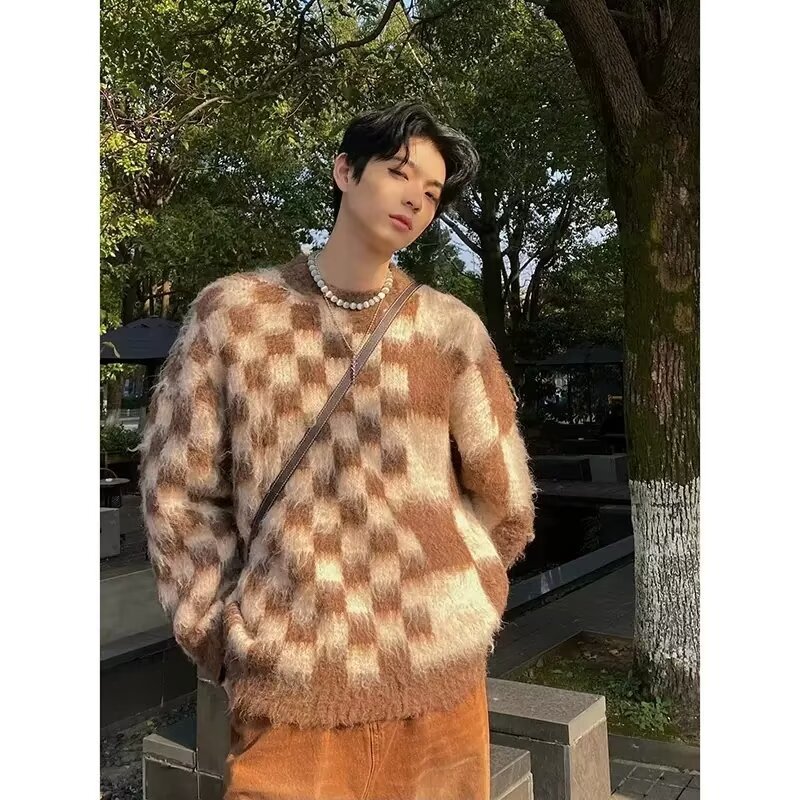 스웨터 남자의 가을 새로운 미국 복고풍 틈새 디자인 감각 체스 판 격자 무늬 커플의 느슨한 올 매치 두꺼운 라인 스웨터