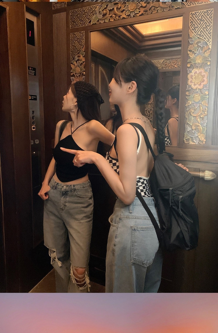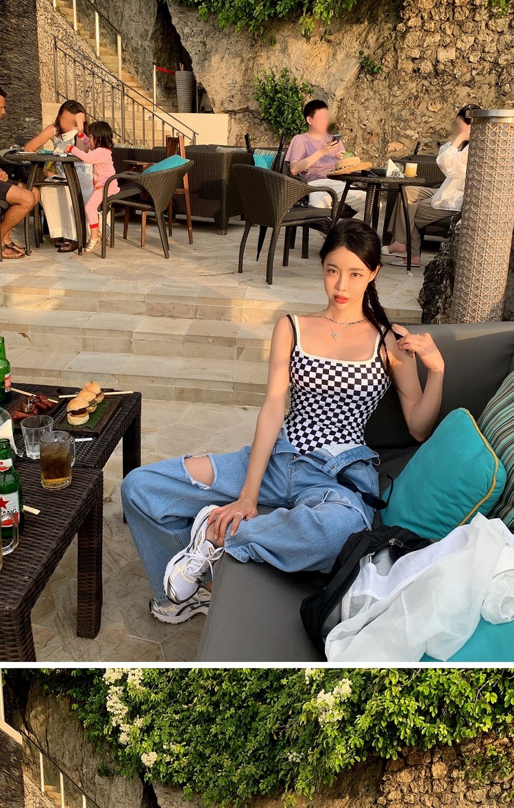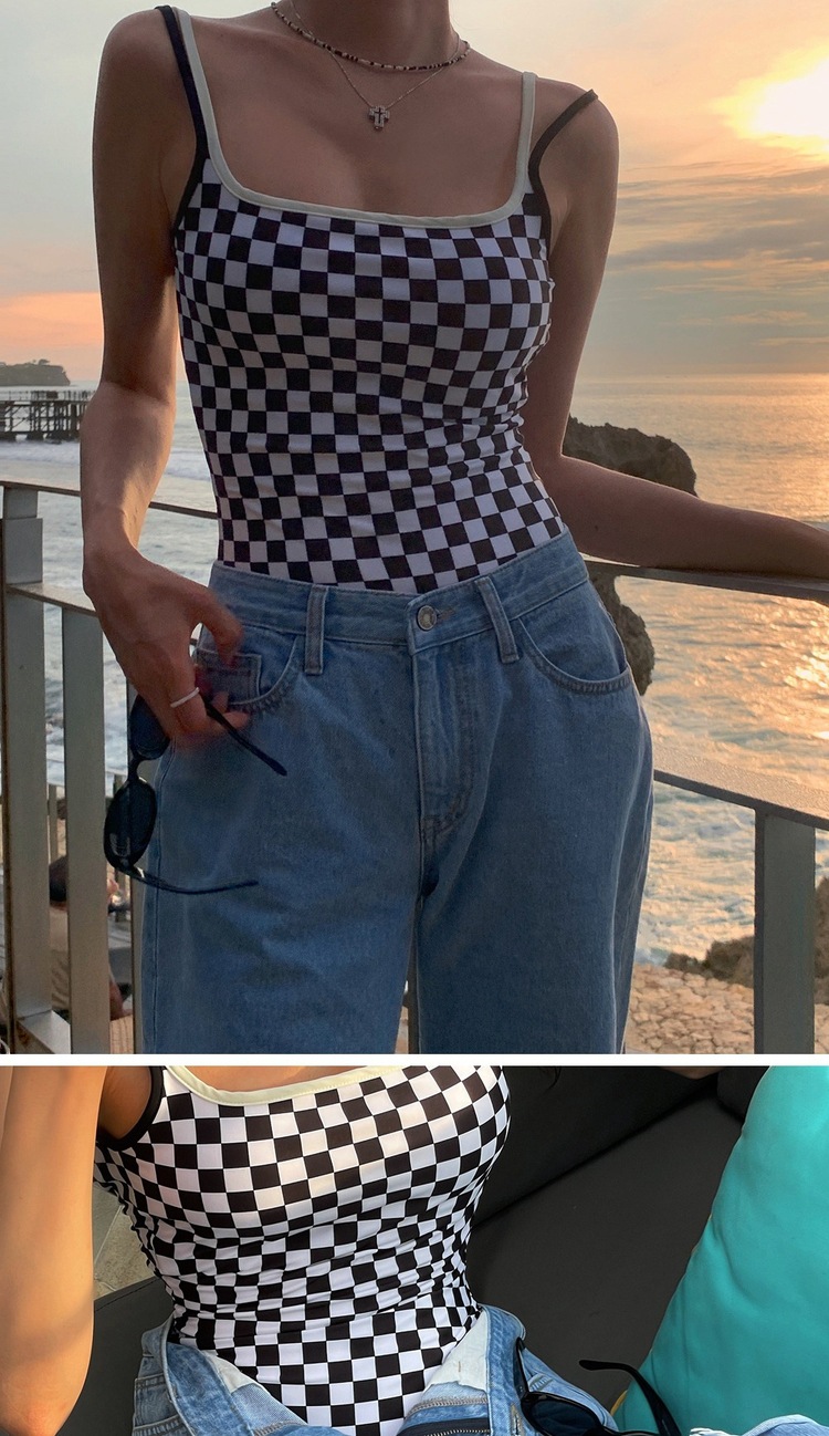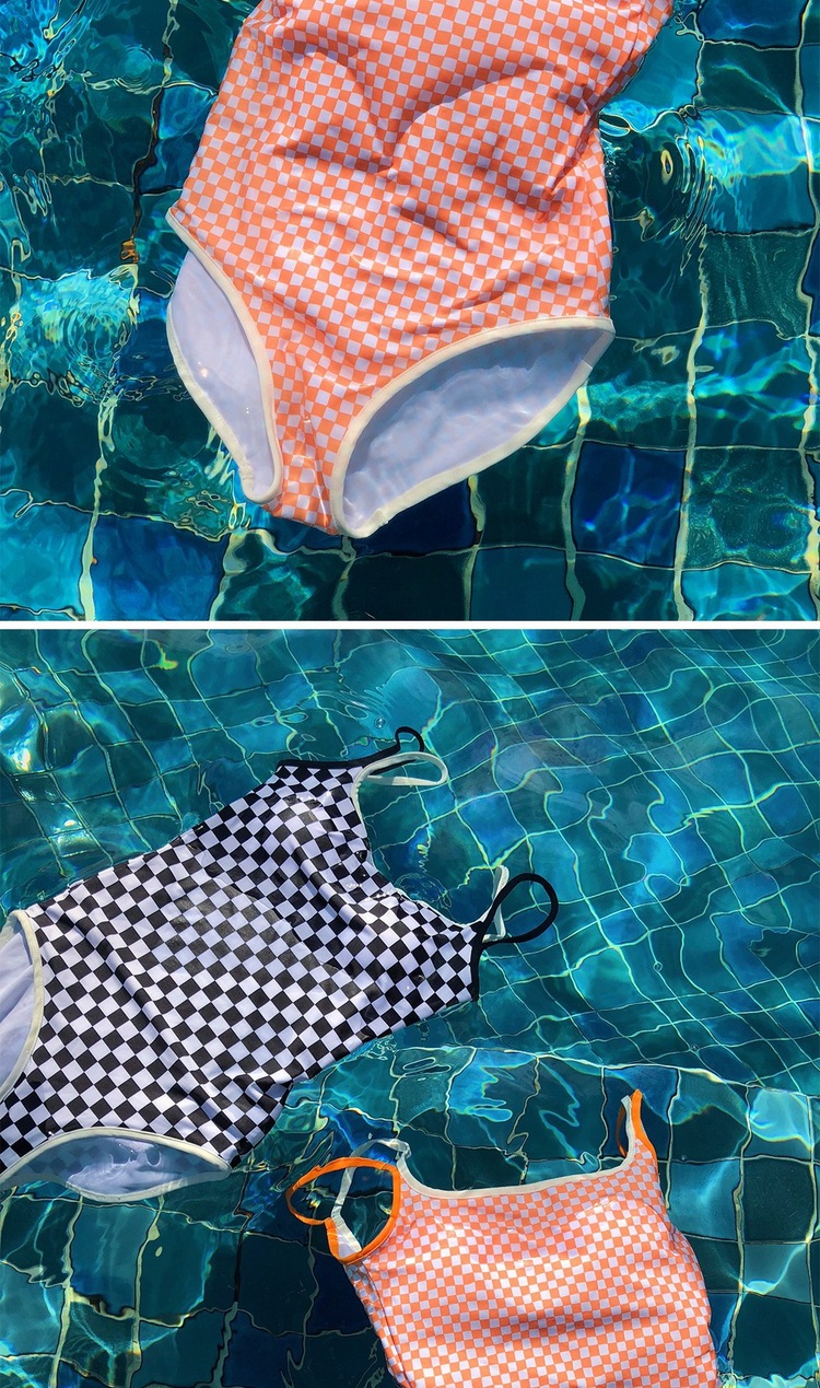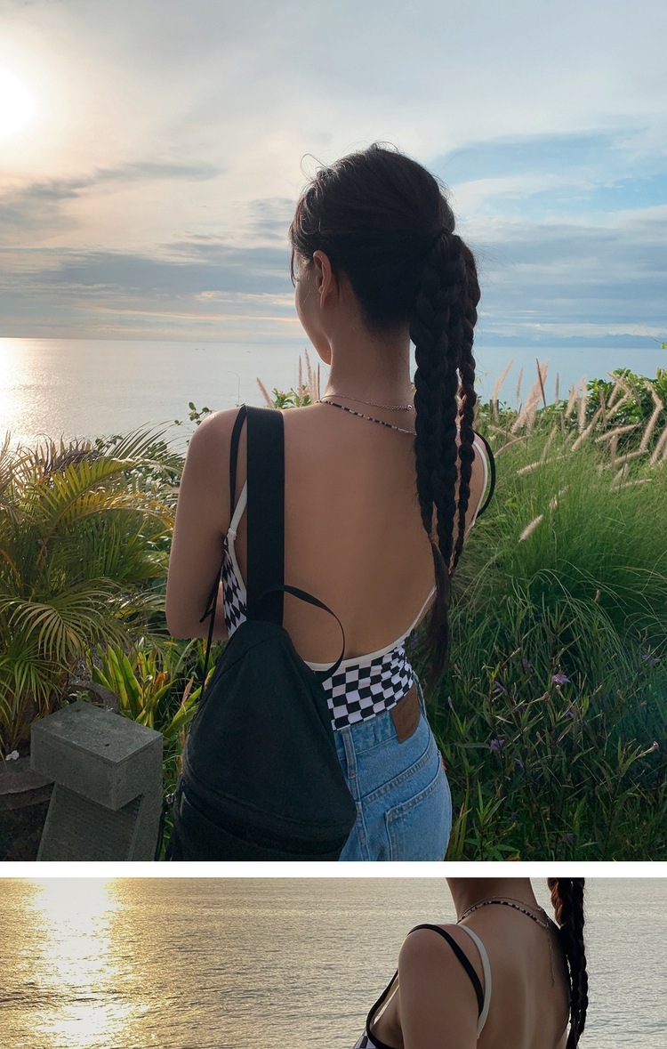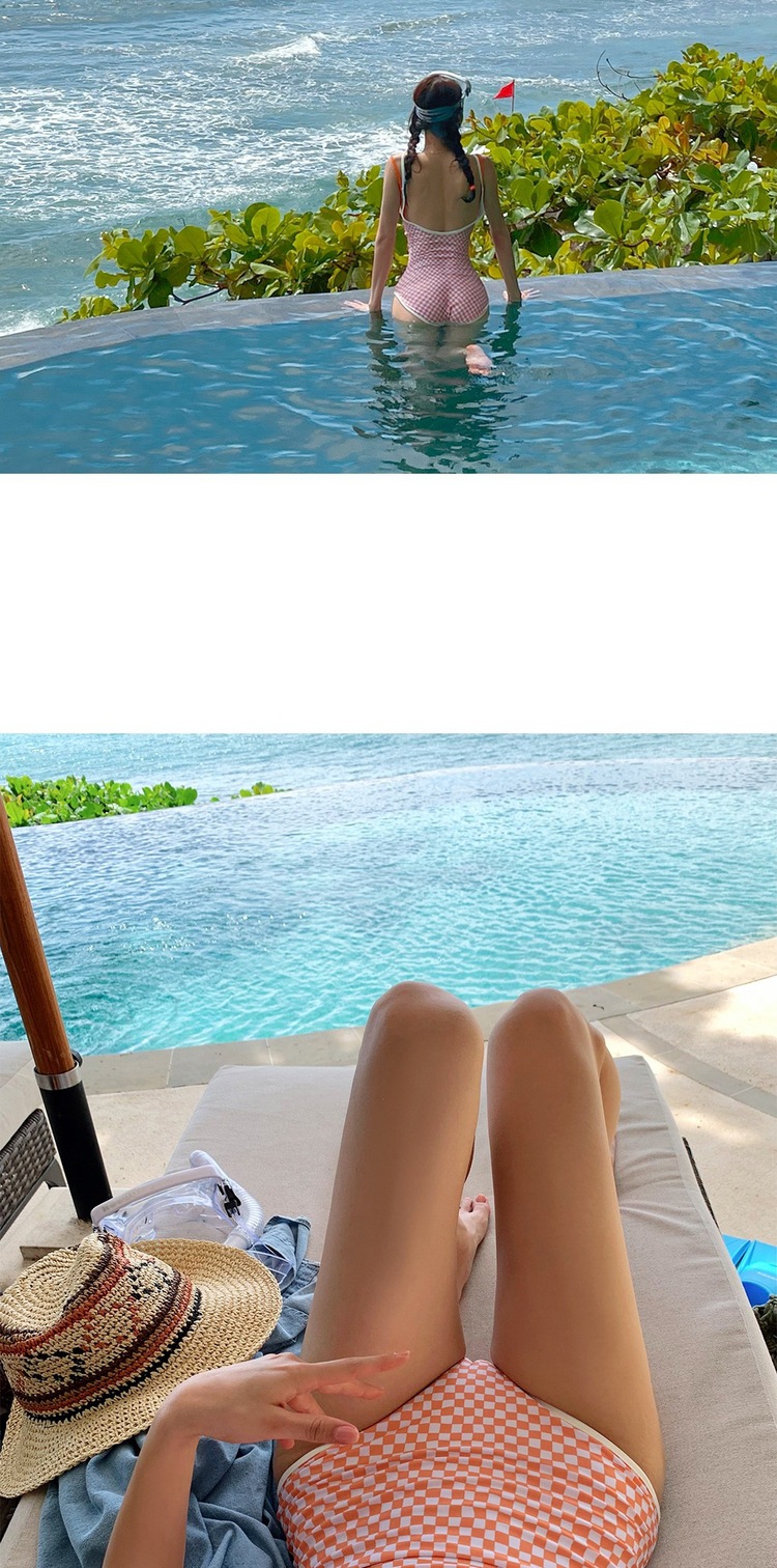 Ins 스타일 체스보드 컬러 접합 백리스 슬링 수영복 여성용 섹시한 슬림 룩 소녀의 보수적 인 해변 사진 수영복스토어 가기