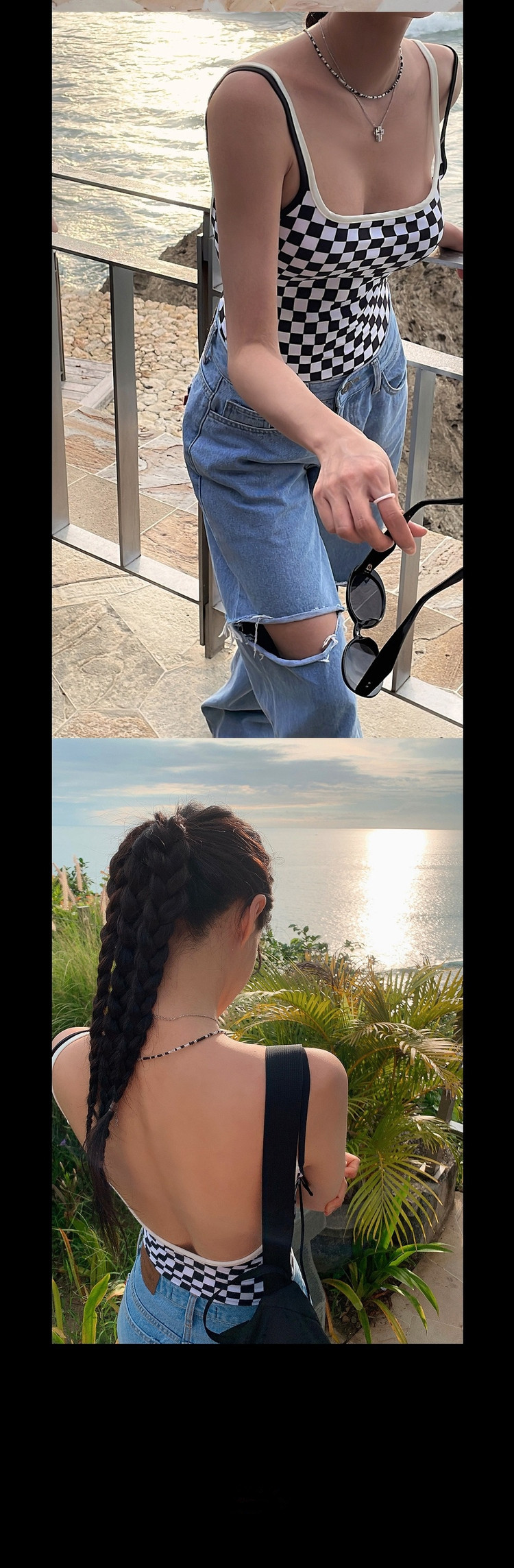Ins 스타일 체스보드 컬러 접합 백리스 슬링 수영복 여성용 섹시한 슬림 룩 소녀의 보수적 인 해변 사진 수영복
