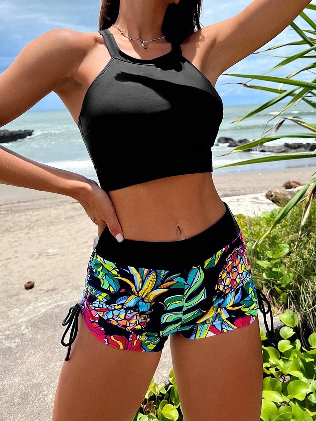 2024 새로운 유럽과 미국의 비키니 수영복 여성의 섹시한 단색 인쇄 스플릿 하이 허리 배꼽 커버 온천 수영복 여성