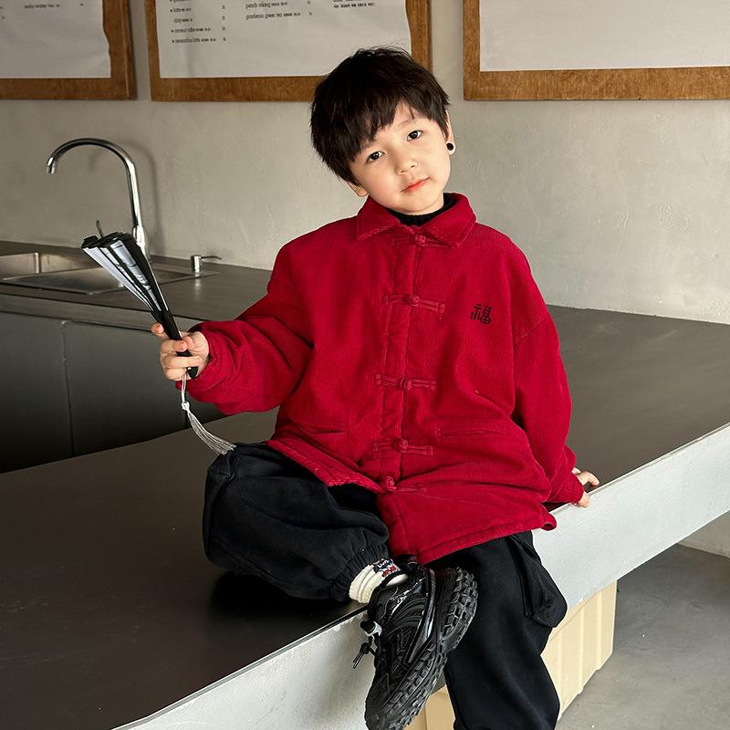남아용 새해맞이 의류 2024 겨울 엠모베이베이 아동용 중국 자수 누비 버튼 새해 따뜻한 가디건
