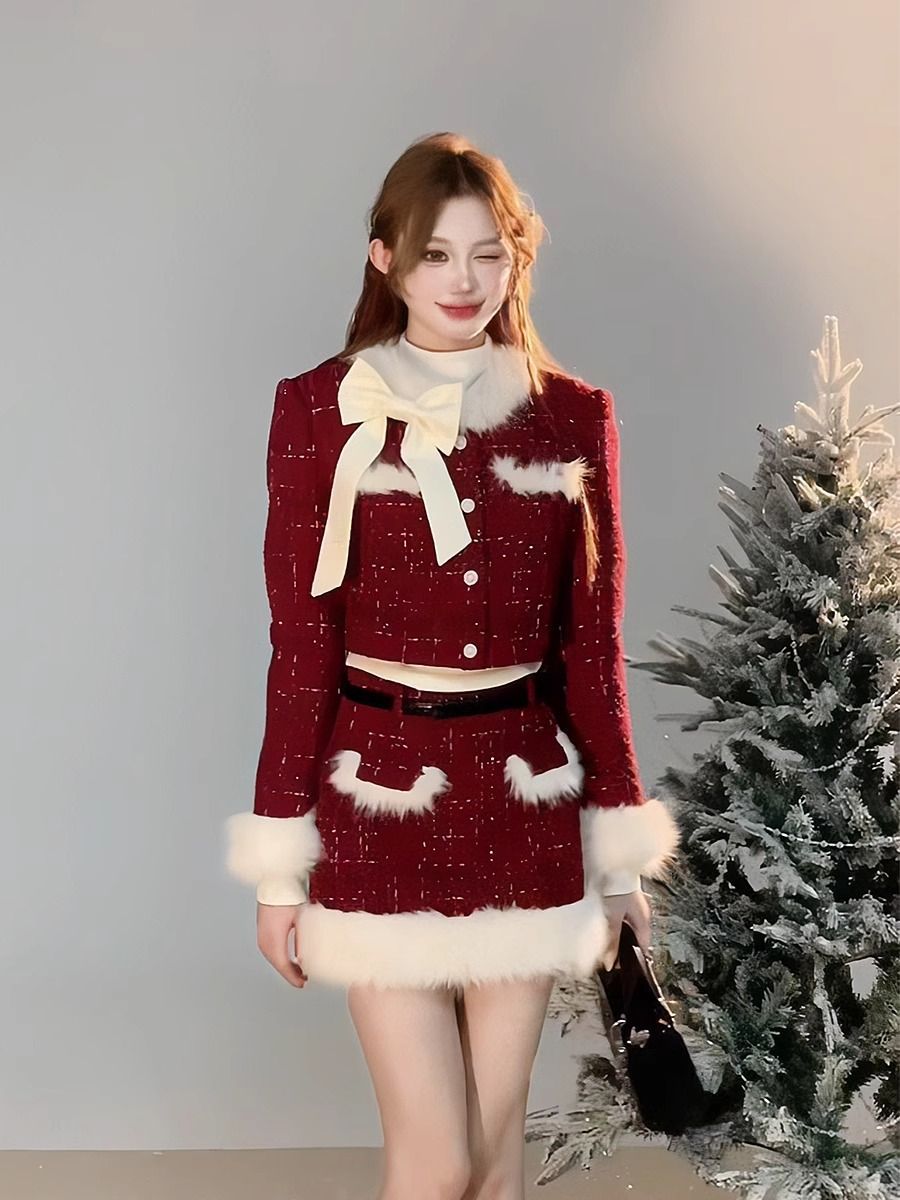 2025 겨울 신상 레드 체크 패턴 샤오샹 스타일 세트 가을 겨울 누빔 숏 재킷과 스커트 투피스 여성용스토어 가기