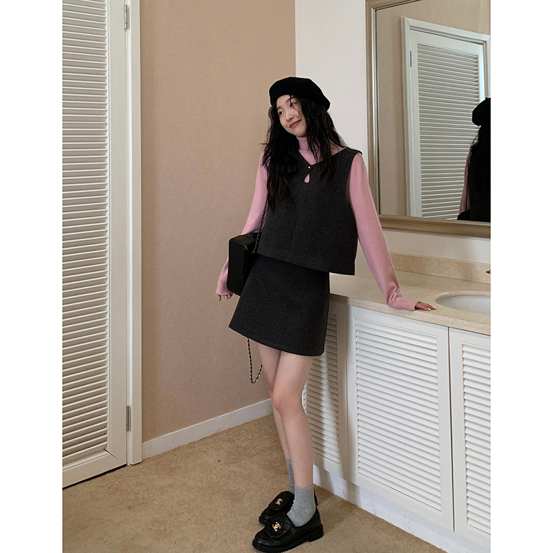 【게밍】프렌치 레트로 울 소재 여성용 조끼+A라인 힙허깅 미니스커트 투피스 세트 X4018F