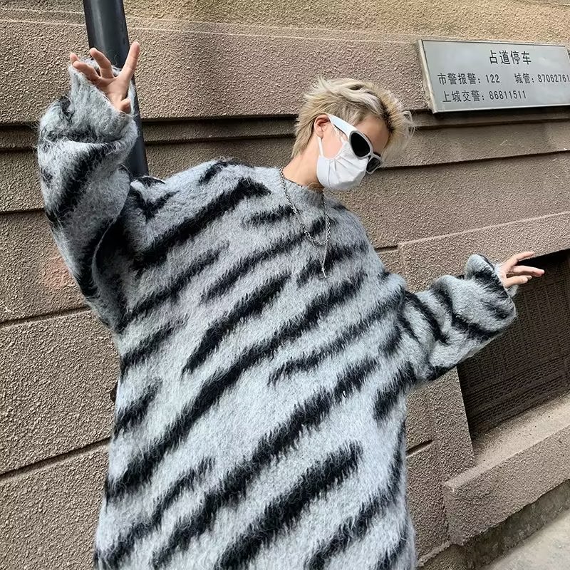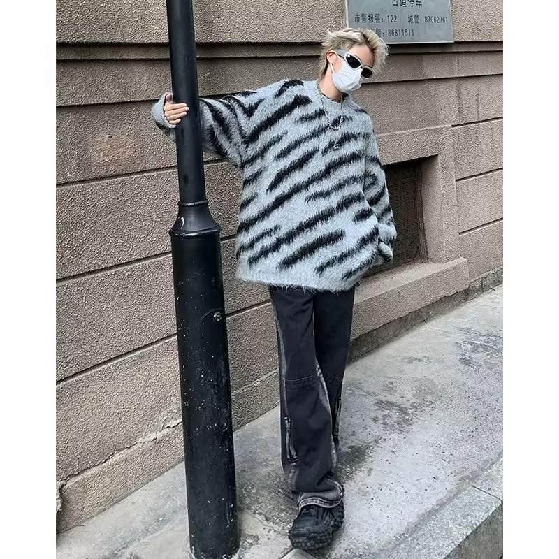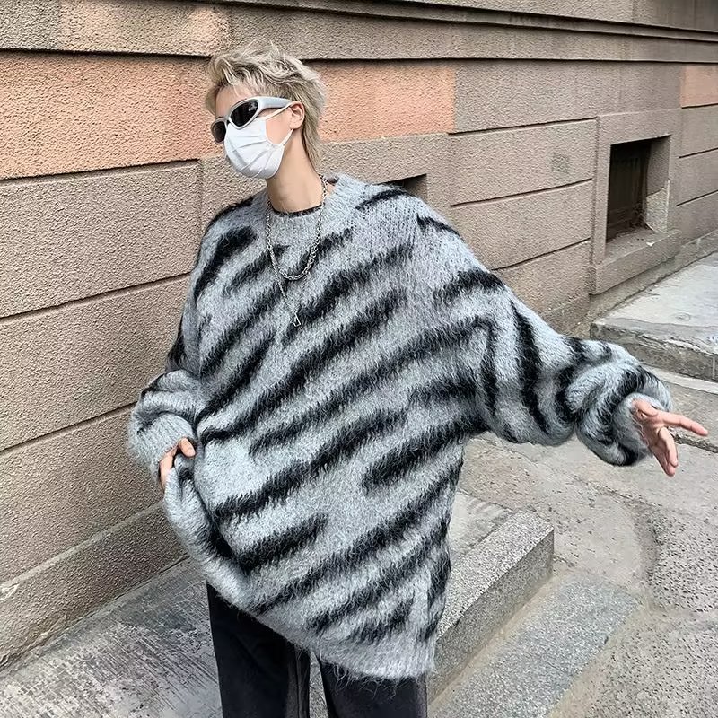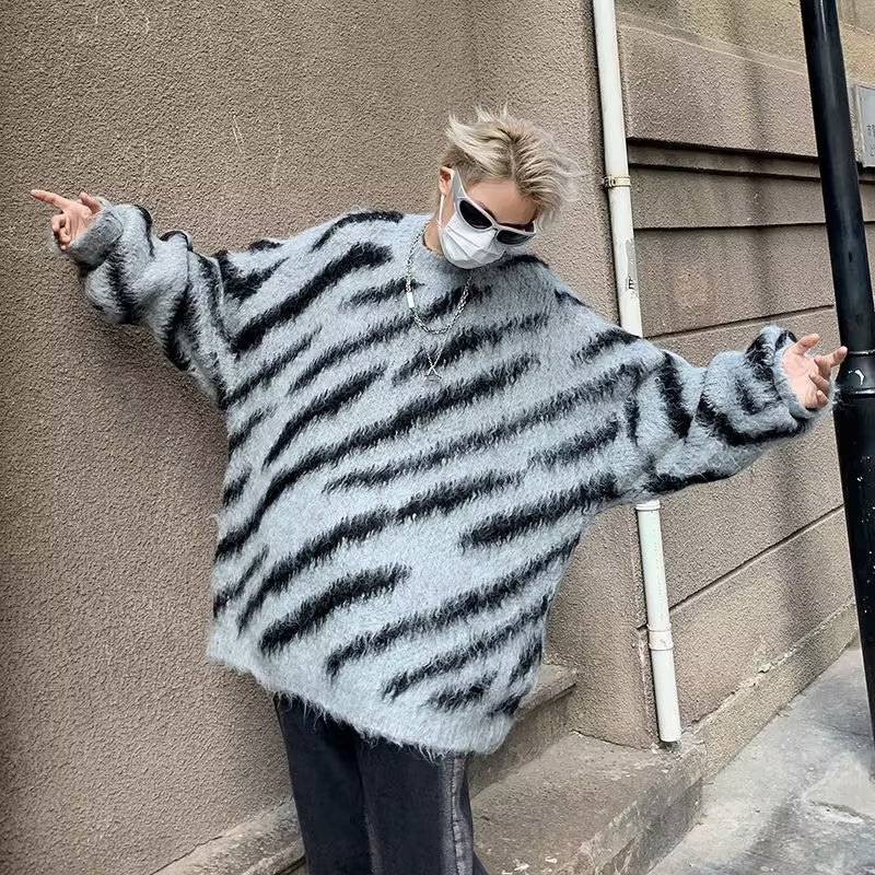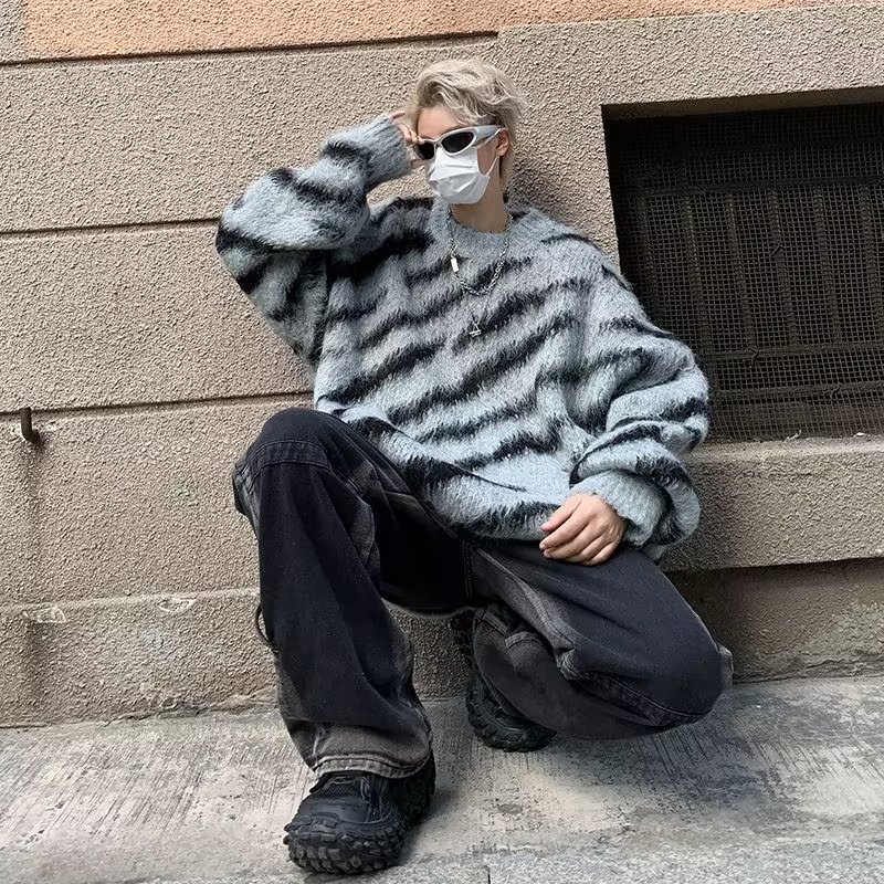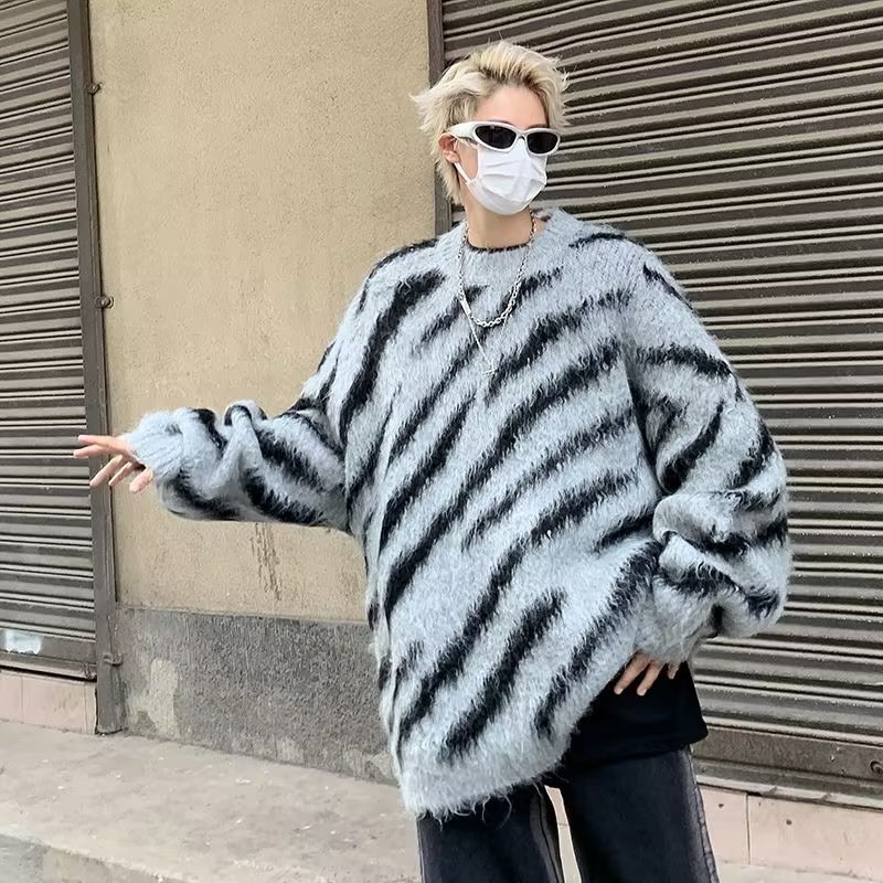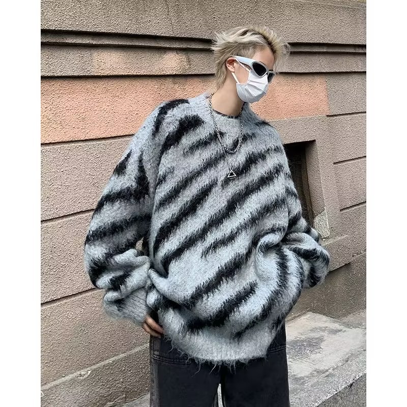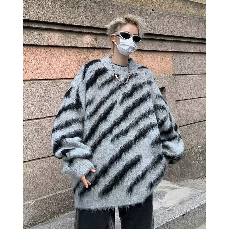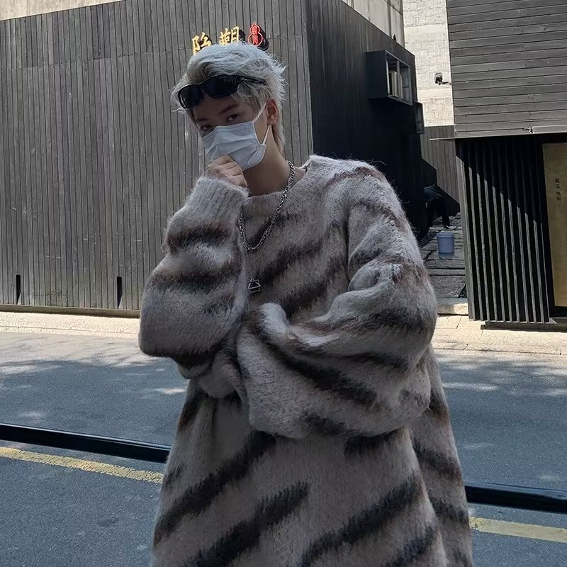 일본 줄무늬 둥근 목 스웨터 남자 2024 가을과 겨울 새로운 게으른 둥근 목 스웨터 느슨한 스웨터