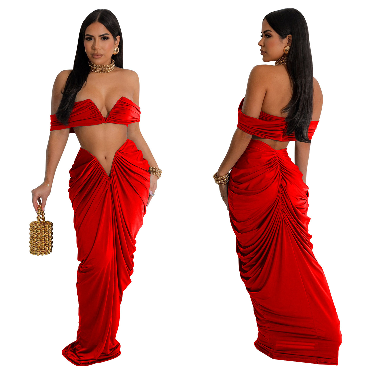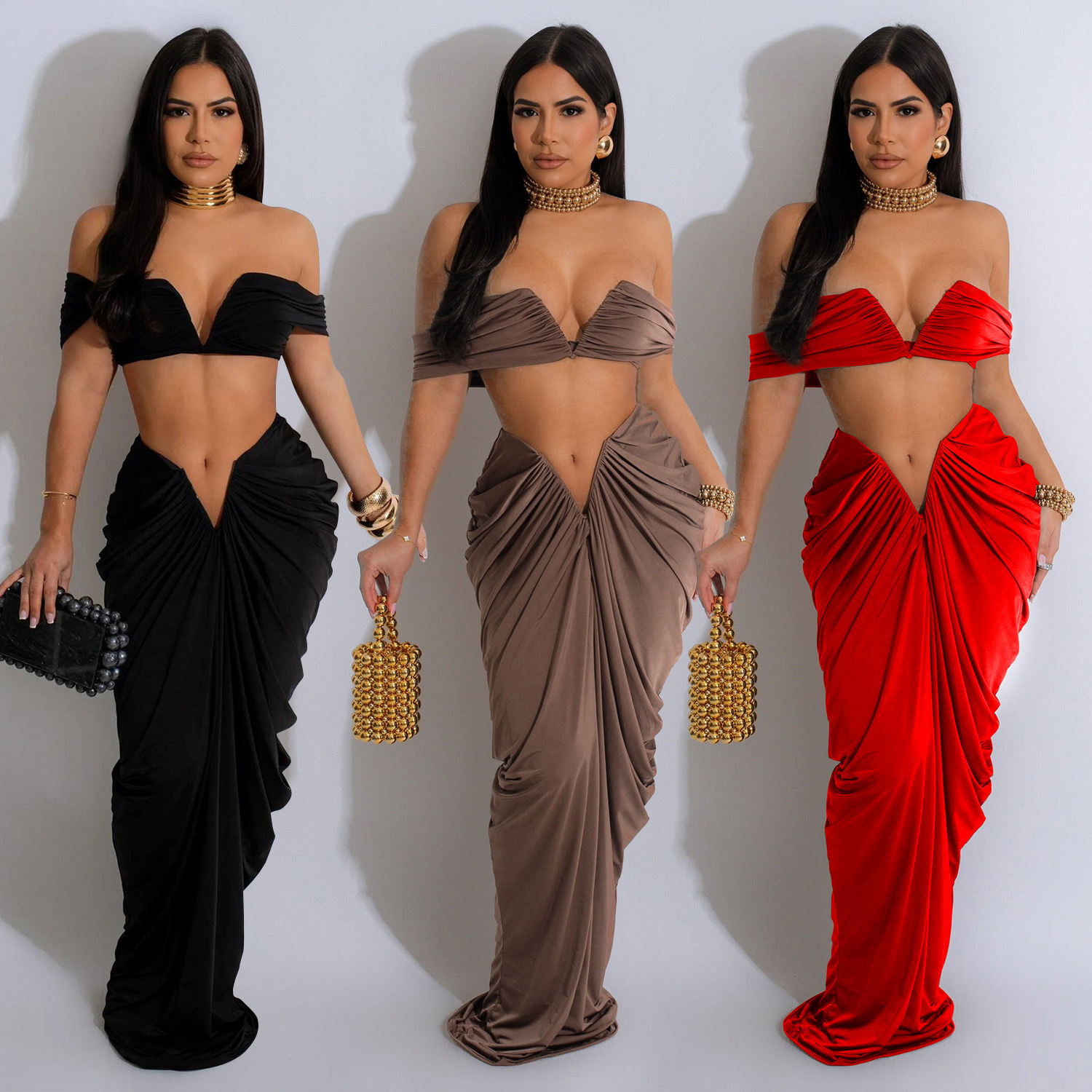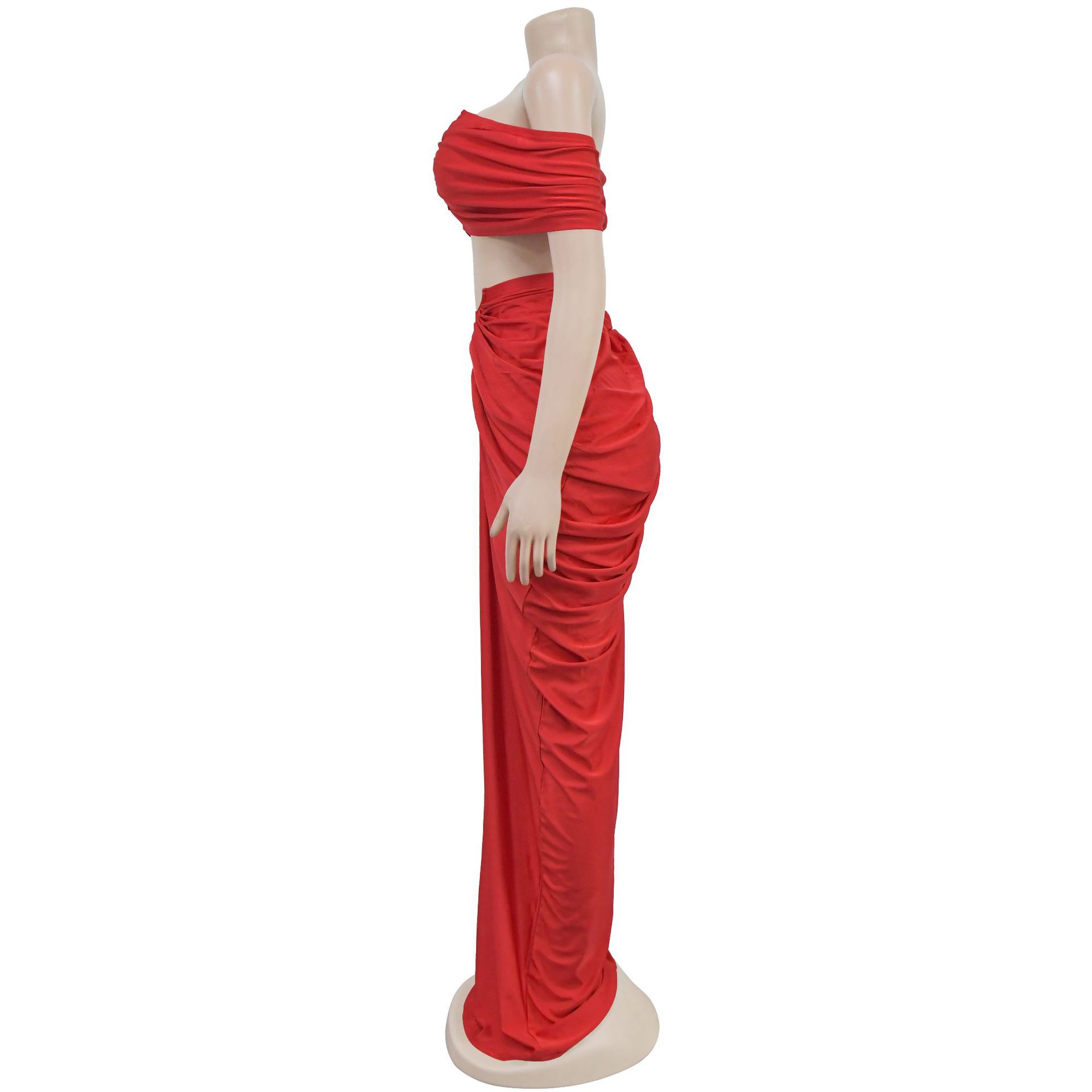 C6822 국경 간 AliExpress 아마존 유럽과 미국의 패션 여성의 단색 섹시한 끈이없는 주름진 스커트 투피스 세트스토어 가기