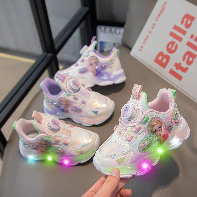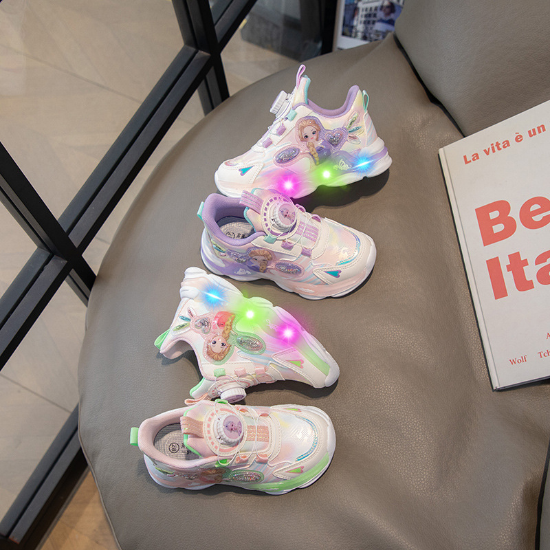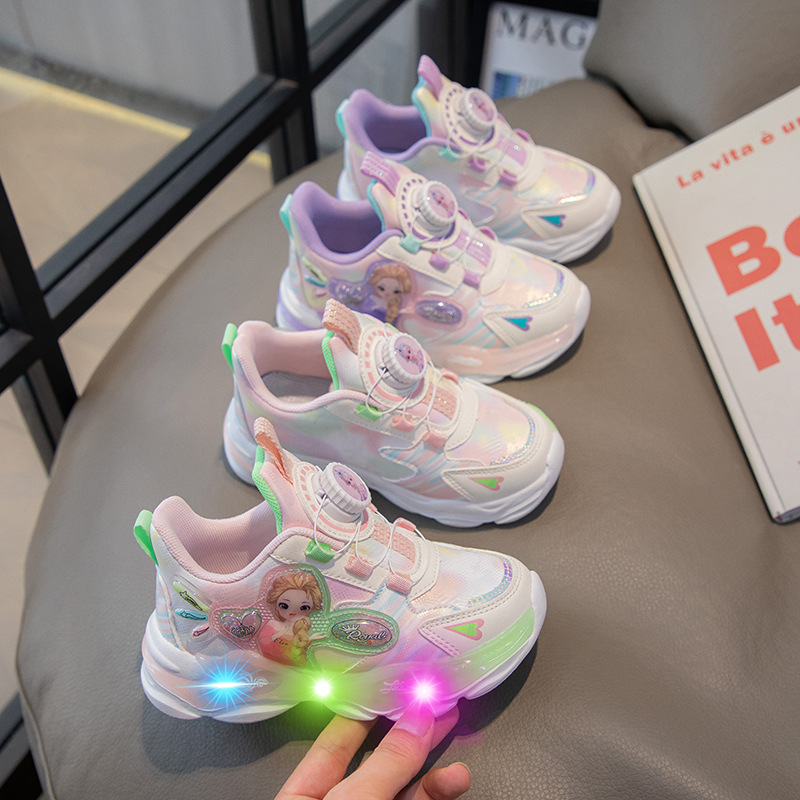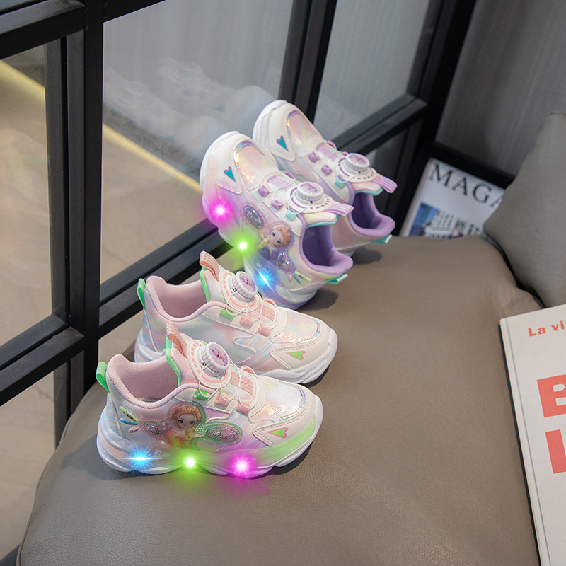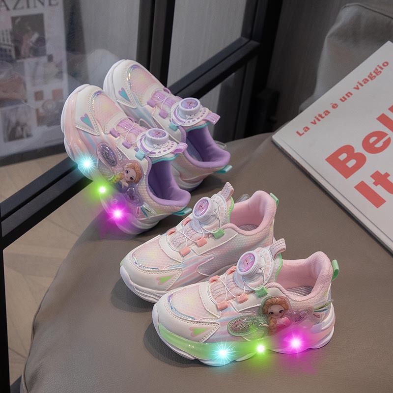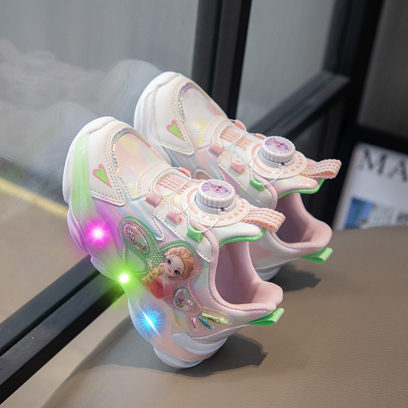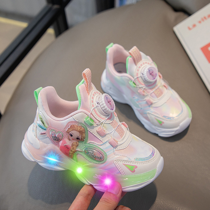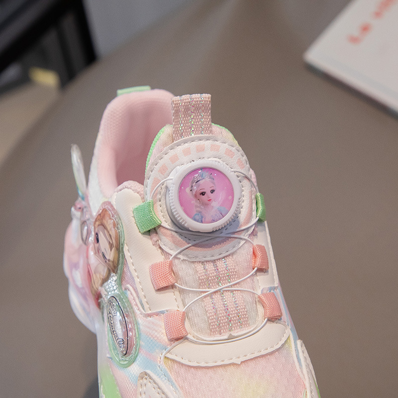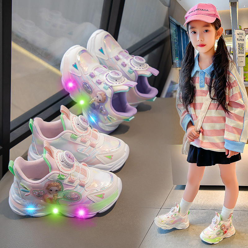 어린이 신상 소녀 라이트 바텀 스포츠 통기성 메쉬 슈즈와 회전 버튼 미끄럼 방지 랜턴 러닝 걸스 신발스토어 가기