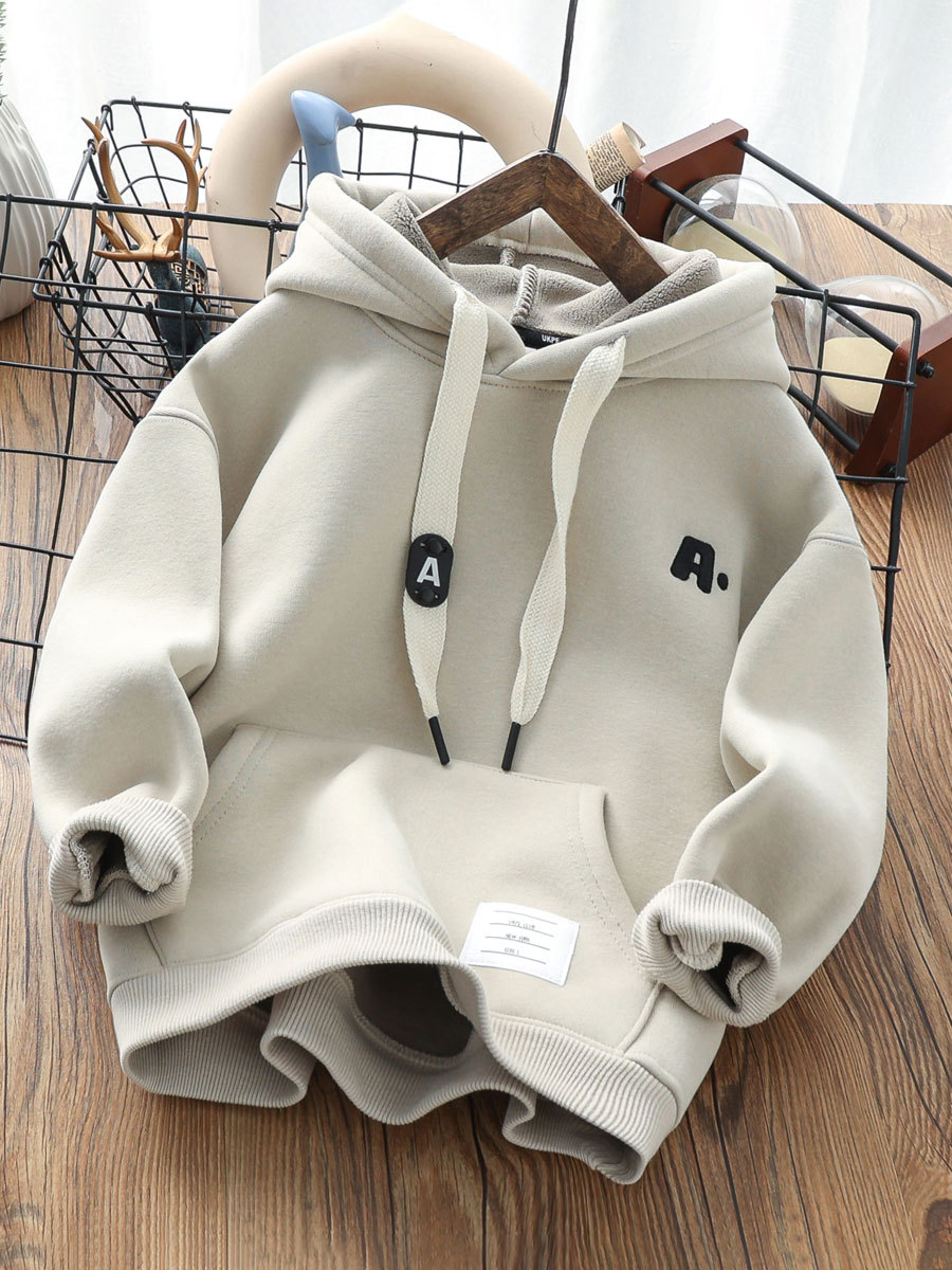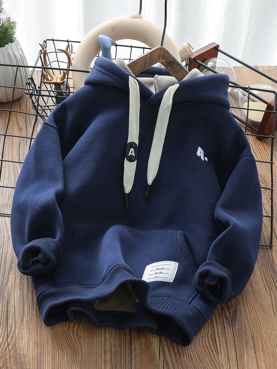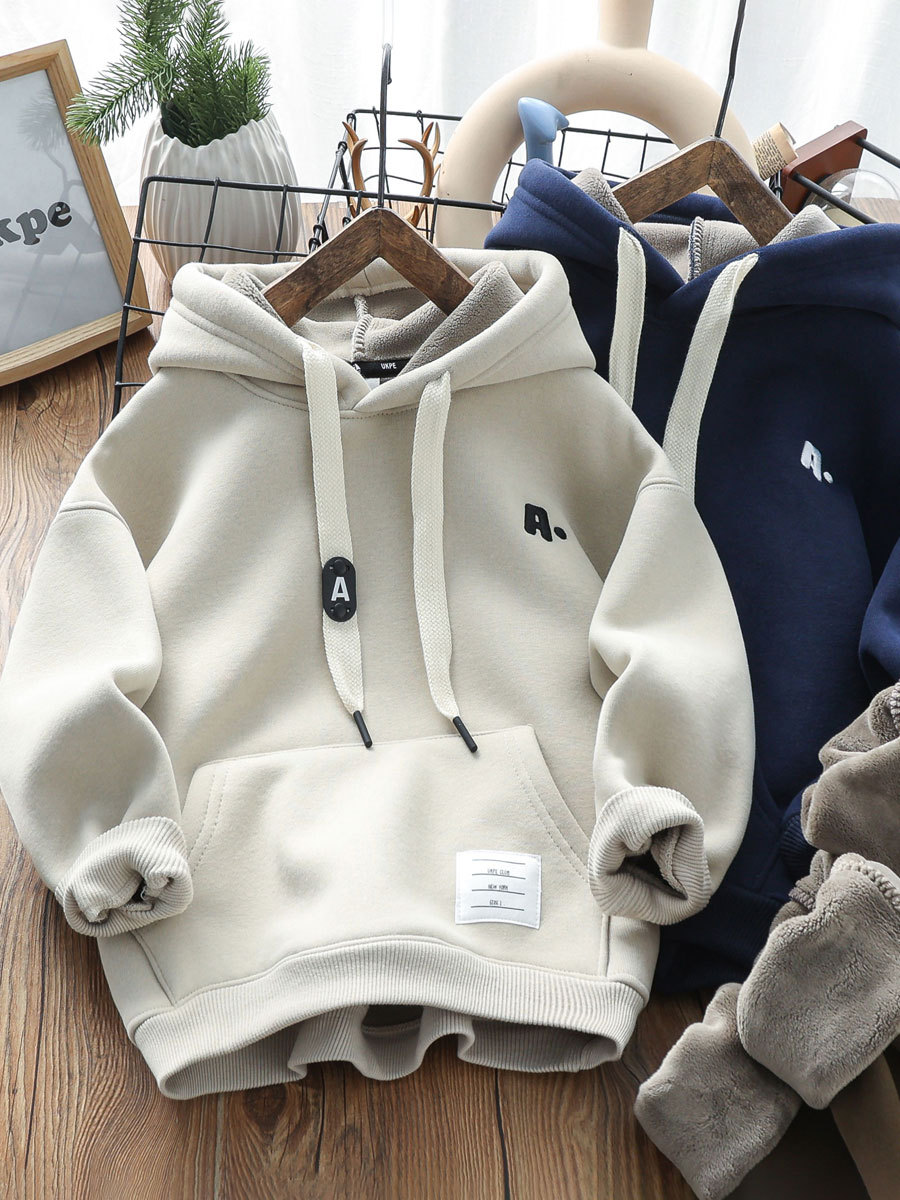 두꺼운 벨벳이 있는 겨울 소년 후드 티셔츠 2023 새로운 한국식 중대형 어린이 올인원 벨벳 소년 따뜻한 재킷스토어 가기