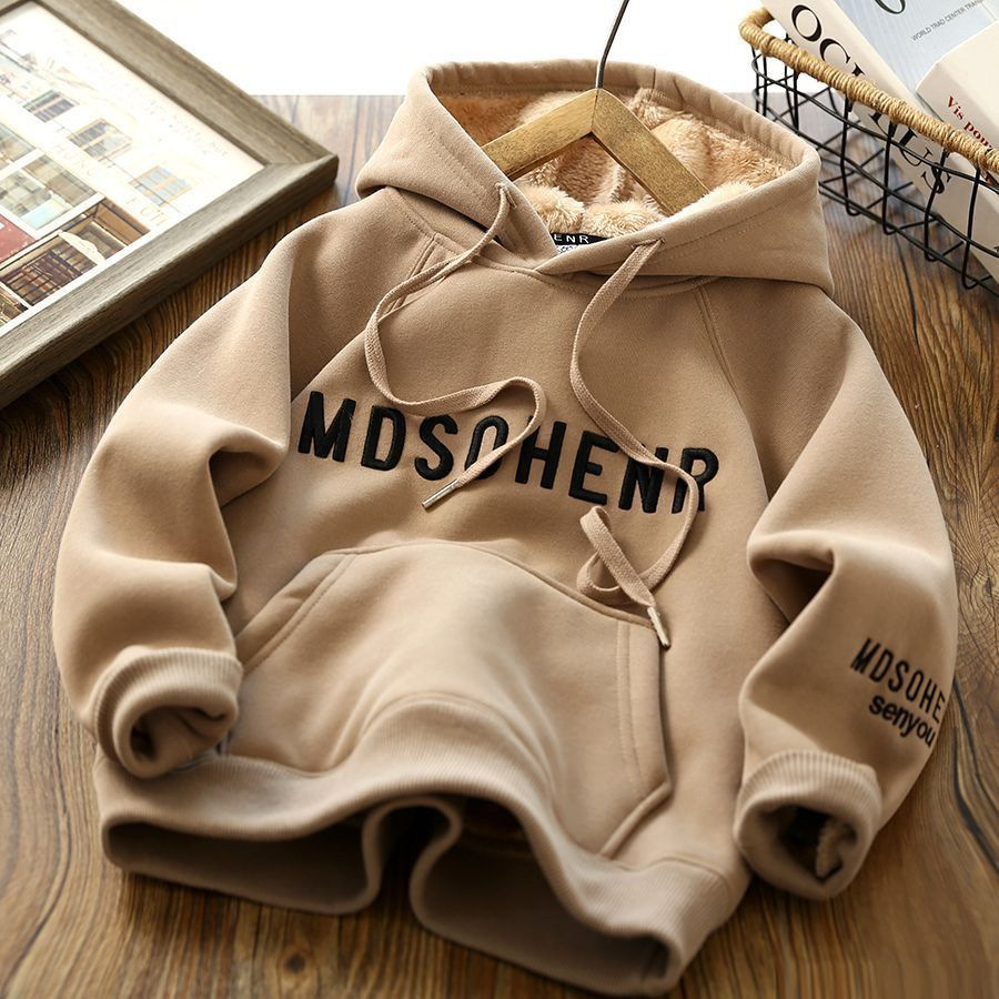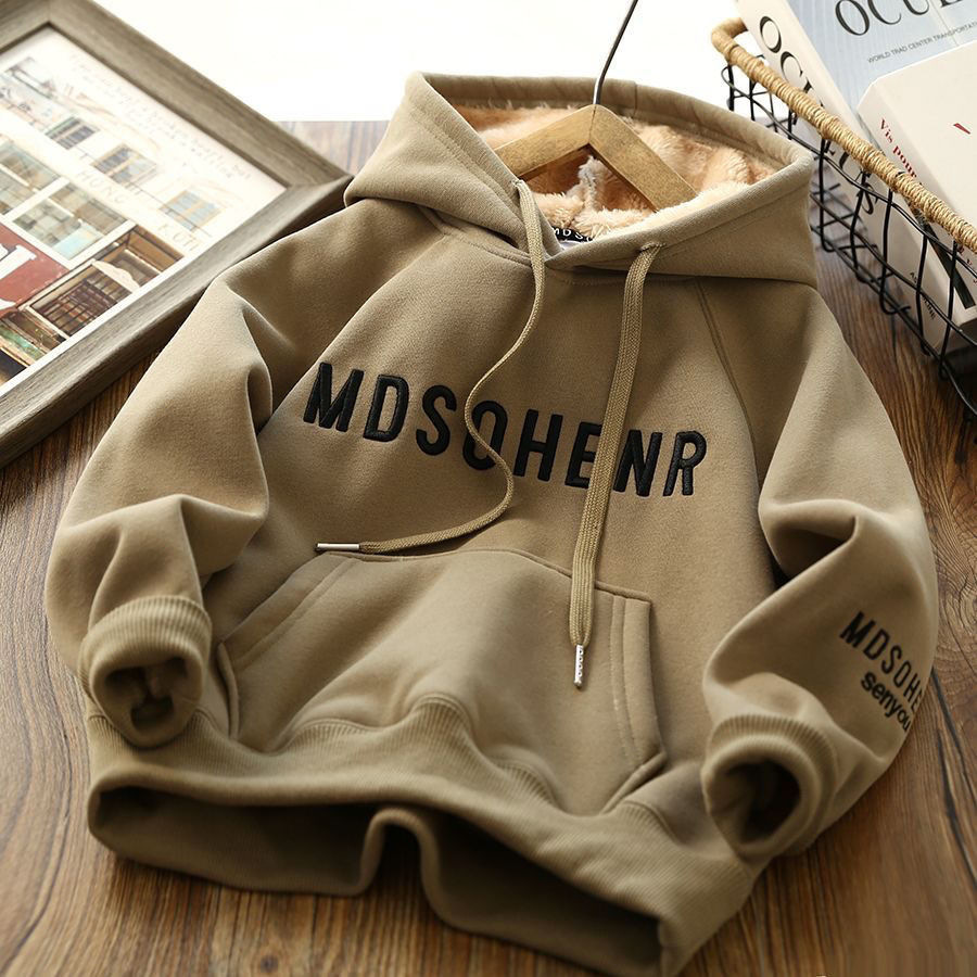 소년 겨울복 기모 두꺼운 후드 스웨트 셔츠 2023 새로운 스타일 중대형 어린이 잘 생긴 소년의 편지 자수 최고 유행스토어 가기