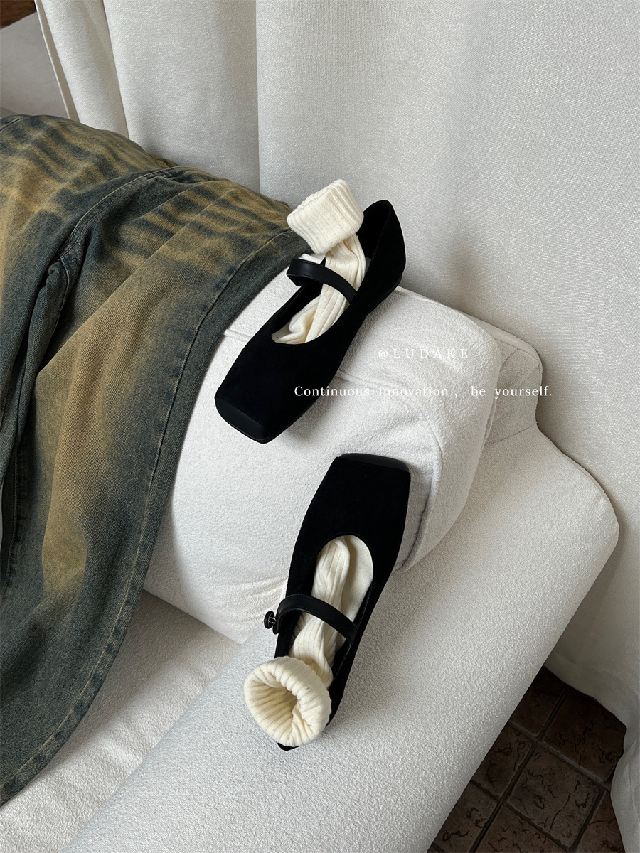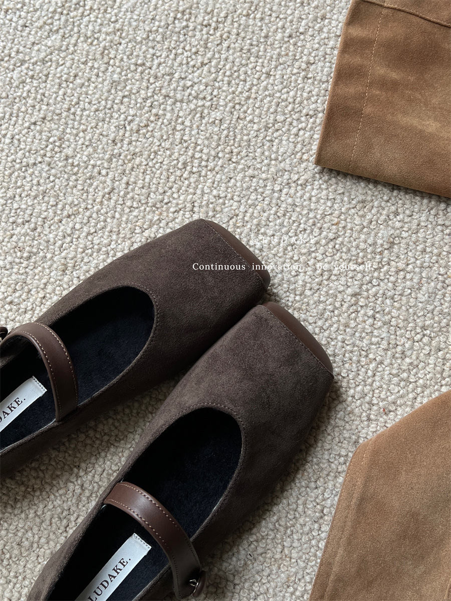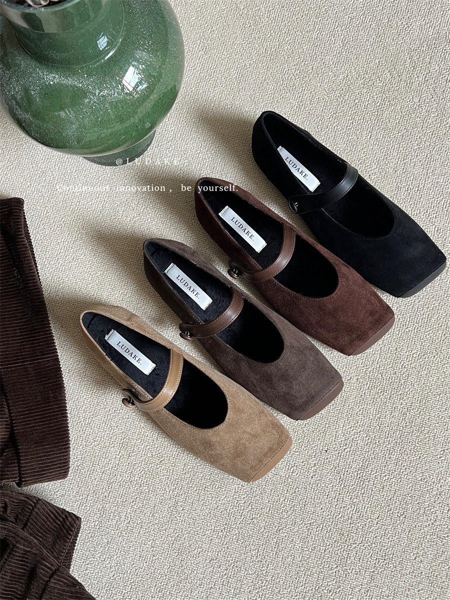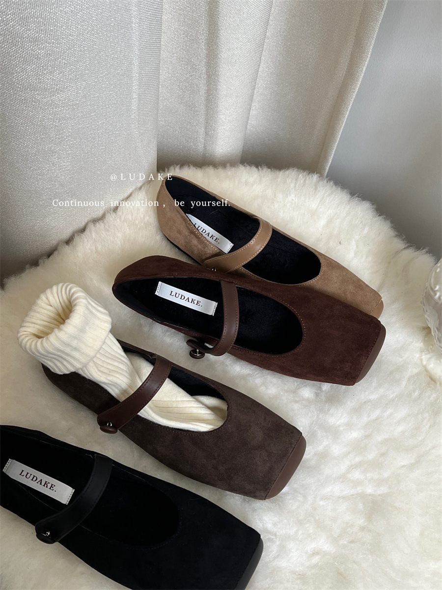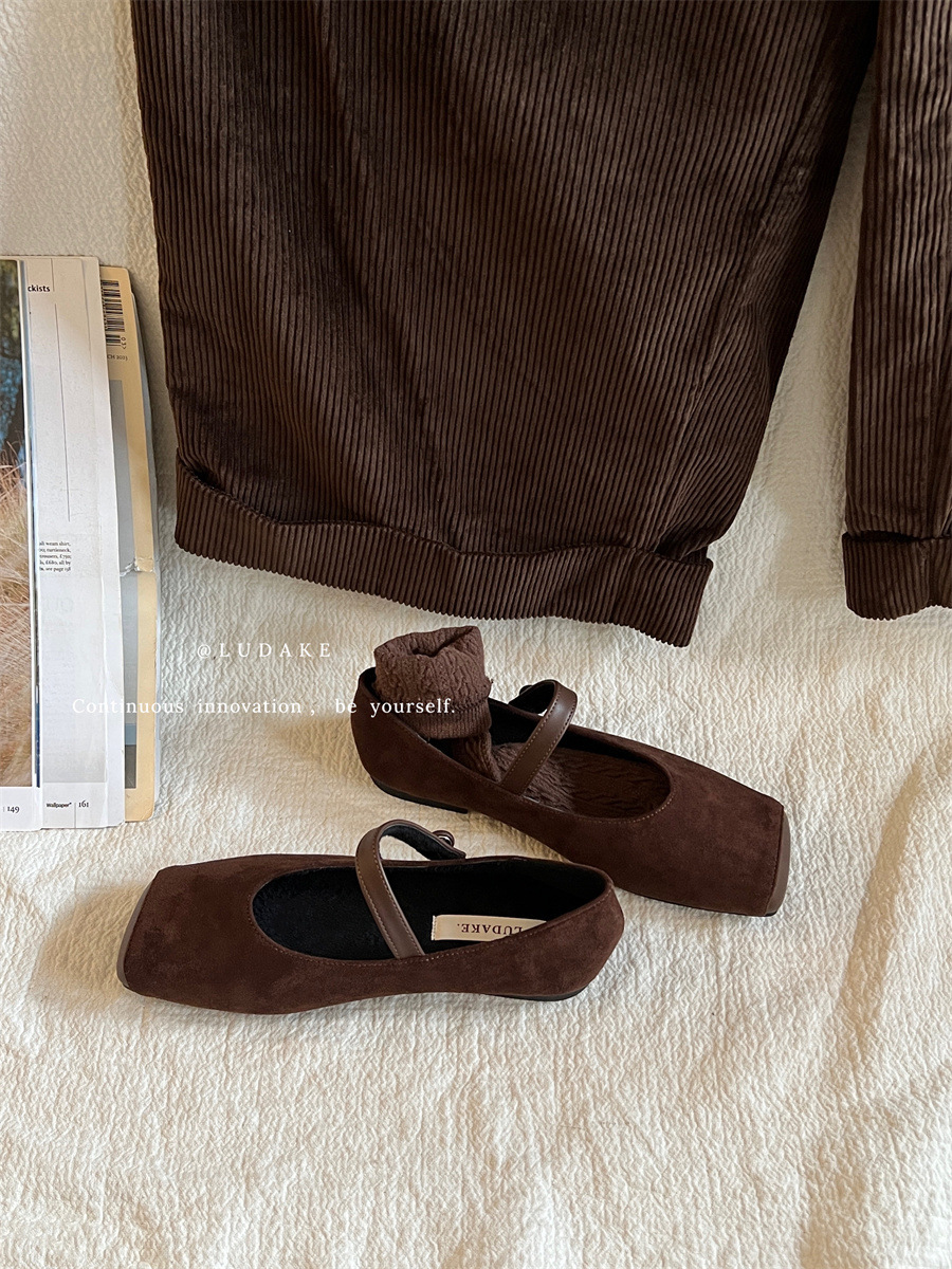 스퀘어 토 메리 제인 신발 2023 가을과 겨울 새로운 스웨이드 원 스트랩 레트로 원피스 기모 싱글 레이어 신발스토어 가기