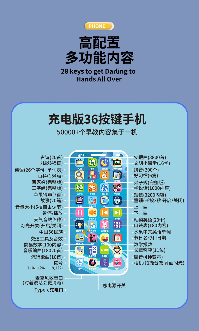 • [하늘색 마이크 버전] 36키 기능( 50k 조기교육 콘텐츠 + 마이크)
