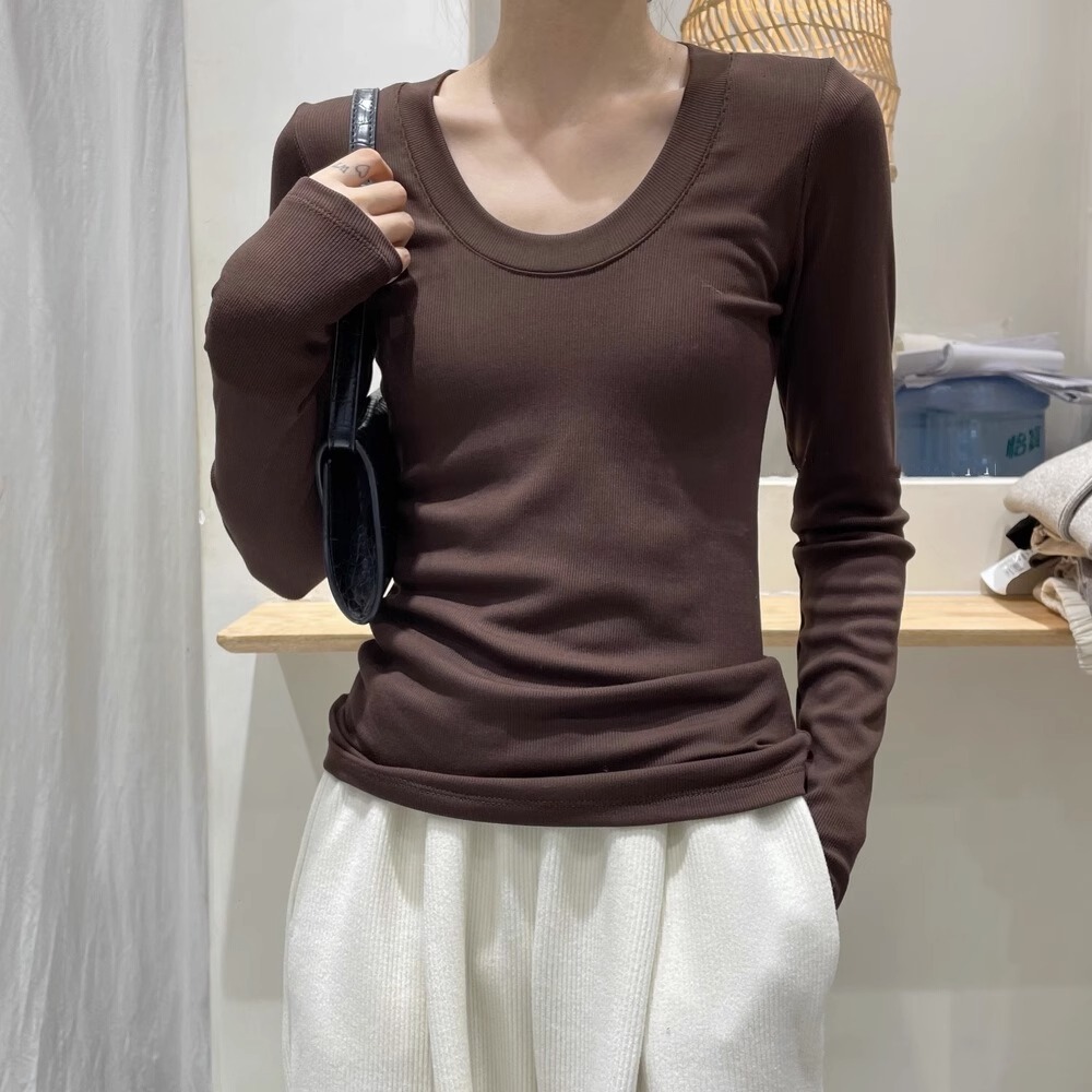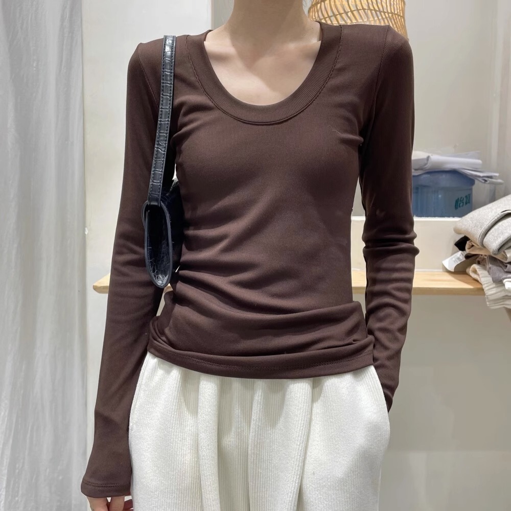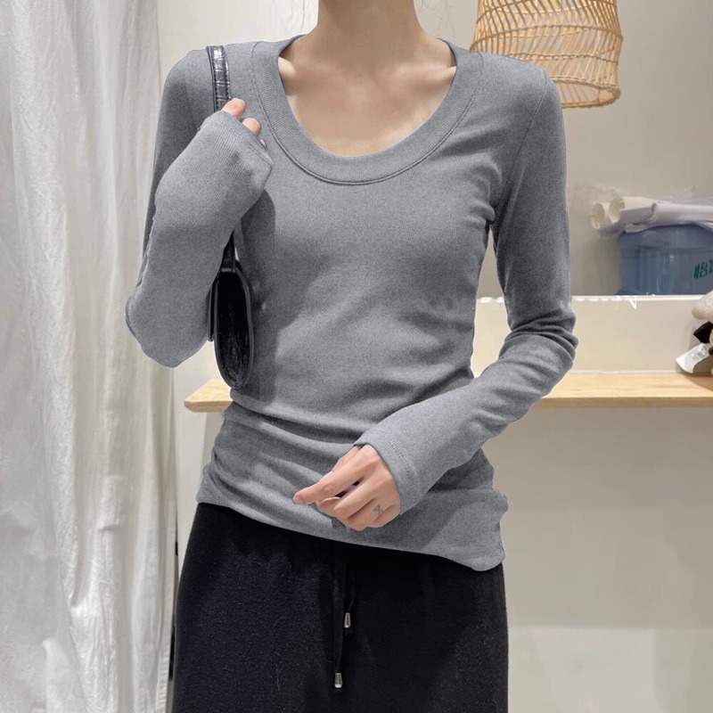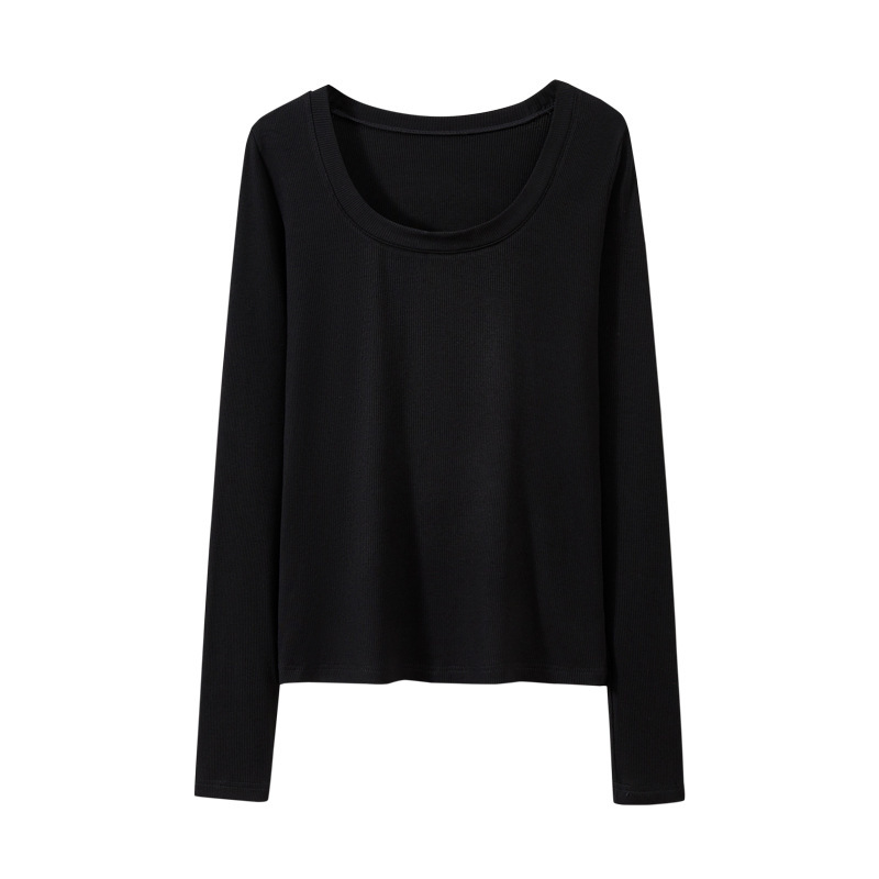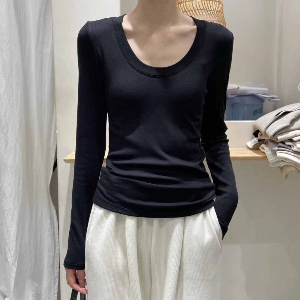 검은 바지 셔츠 여성용 긴 소매 2023 초가을 새로운 대형 라운드 넥 캐주얼 티셔츠 고급 스레드 탑 이너 웨어스토어 가기