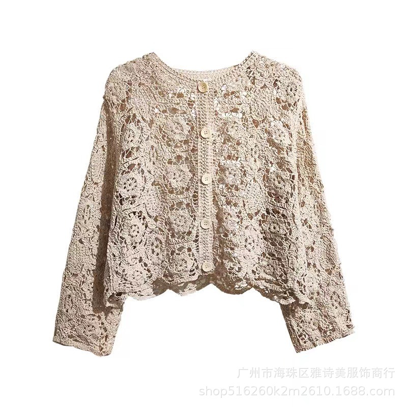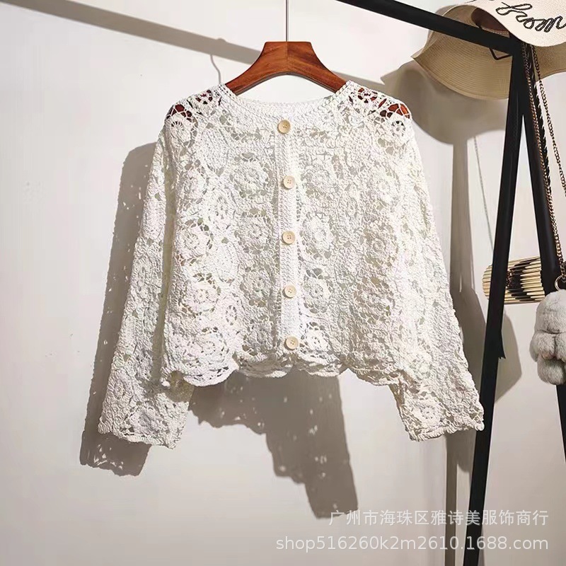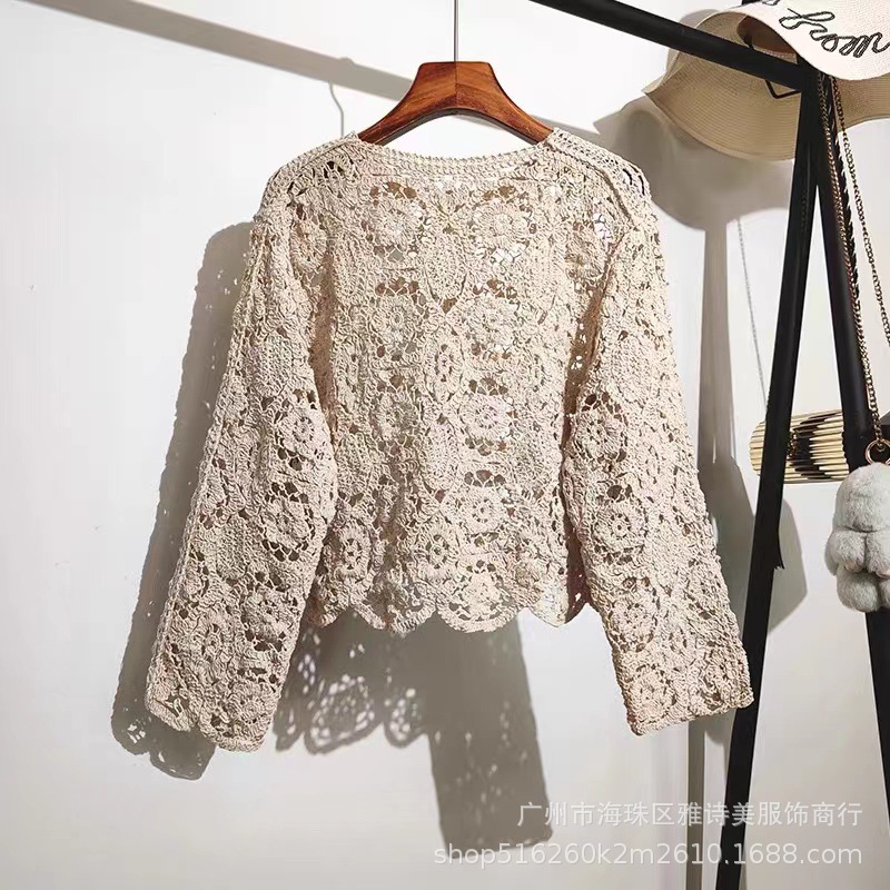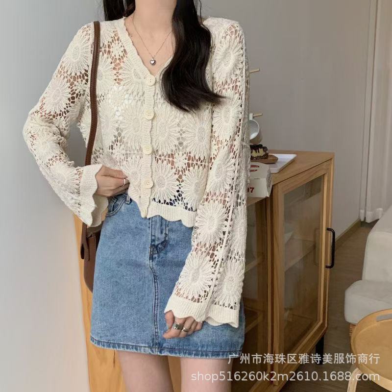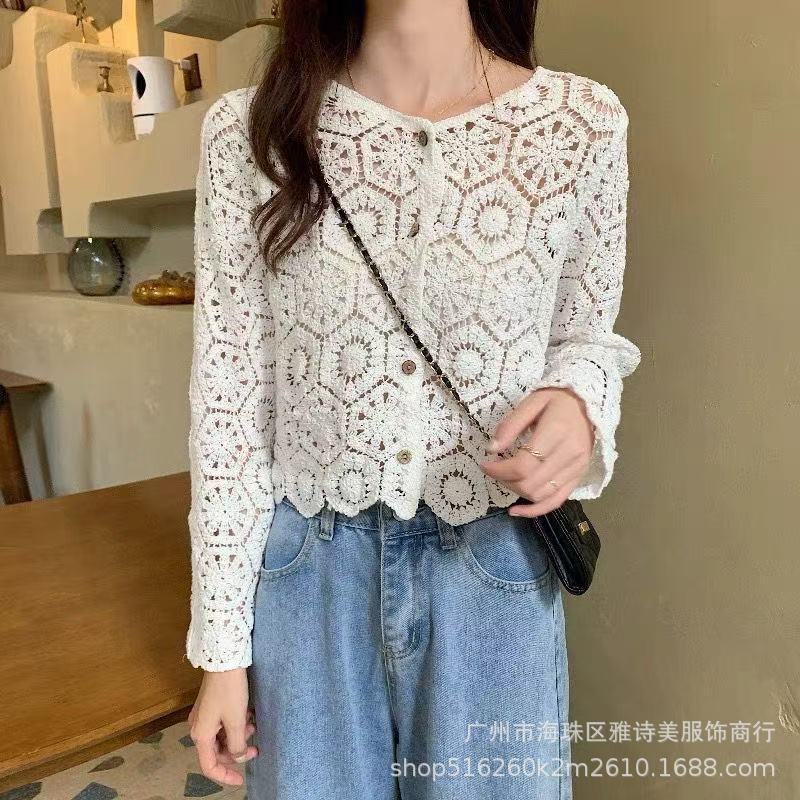 가을 디자인 카디건 서양식 니트웨어 여성의 새로운 세련된 작은 셔츠 수 놓은 속이 빈 뜨개질을 한 외부 상단 패션스토어 가기