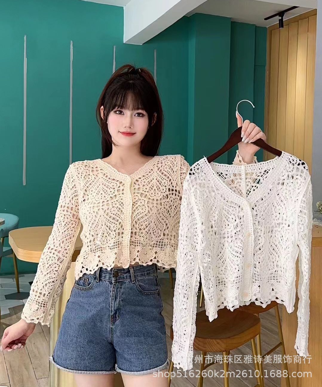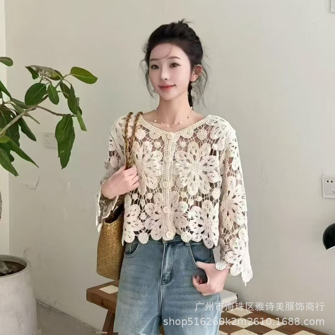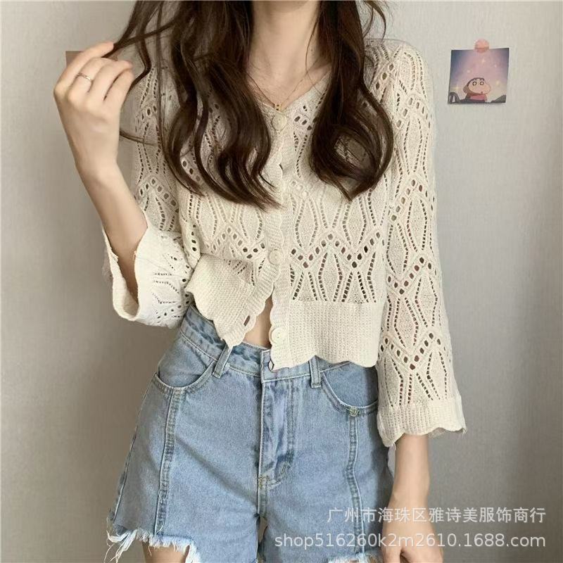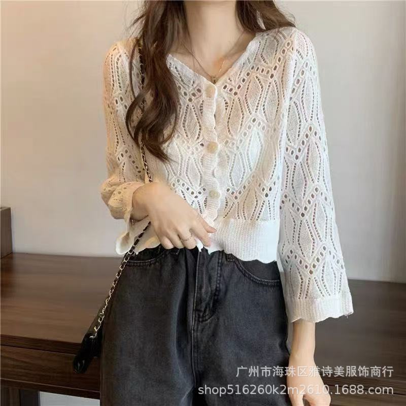 가을 디자인 카디건 서양식 니트웨어 여성의 새로운 세련된 작은 셔츠 수 놓은 속이 빈 뜨개질을 한 외부 상단 패션스토어 가기