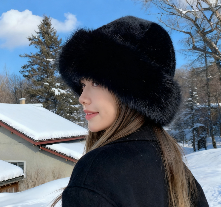 • 모조 밍크 풀 울 몽골리안 모자 - 블랙