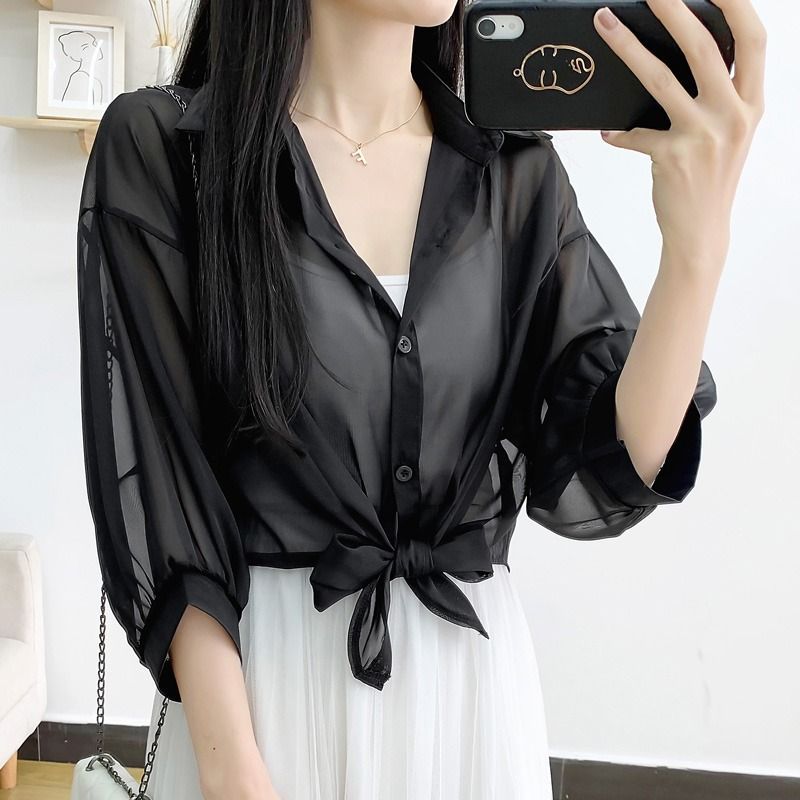 태양 보호 의류 여름 에어컨 셔츠 스커트 작은 목도리 여성용 2023 느슨한 외부 카디건 해변 단색 쉬폰 셔츠스토어 가기