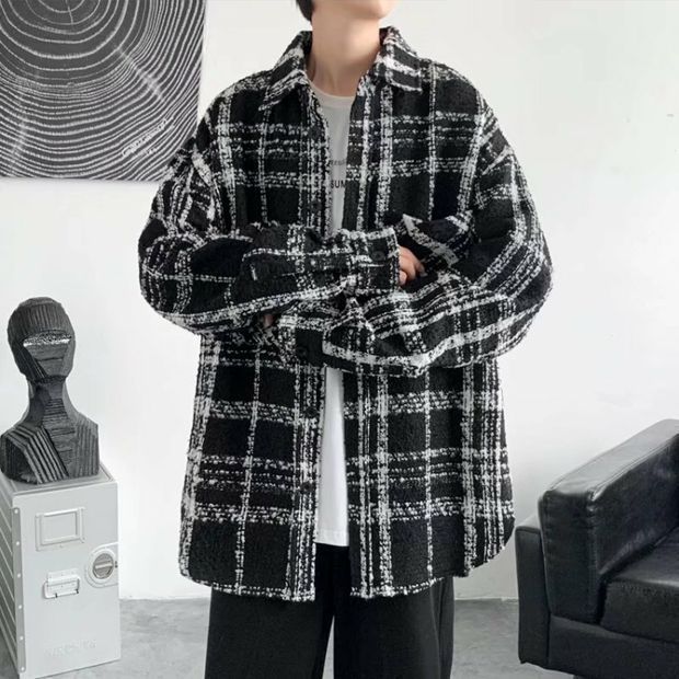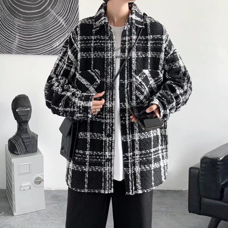 한국 스타일 오버 사이즈 흑백 체크 무늬 작은 감각 틈새 모직 향기로운 스타일 프라이드 스트리트 재킷 남성 봄과 가을 재킷