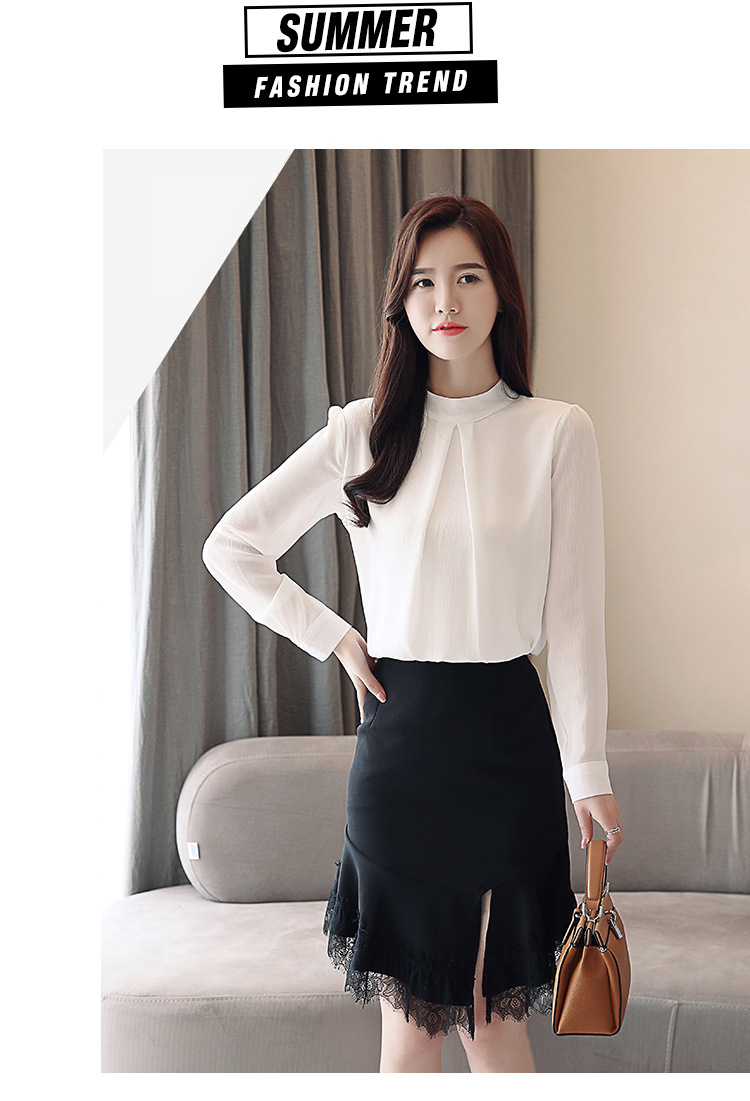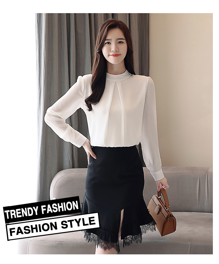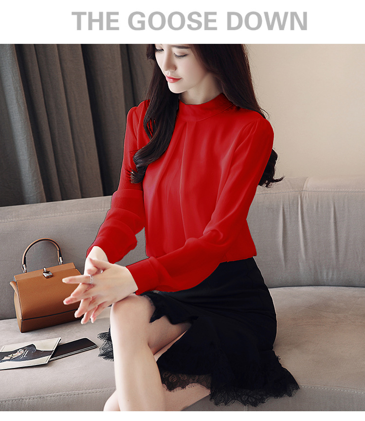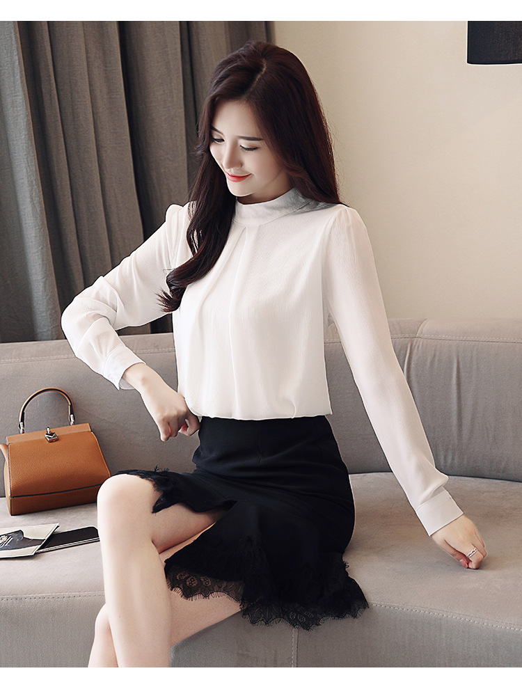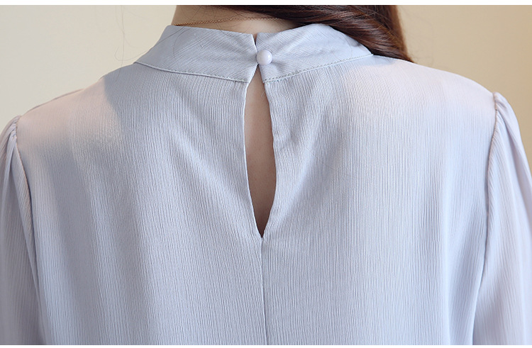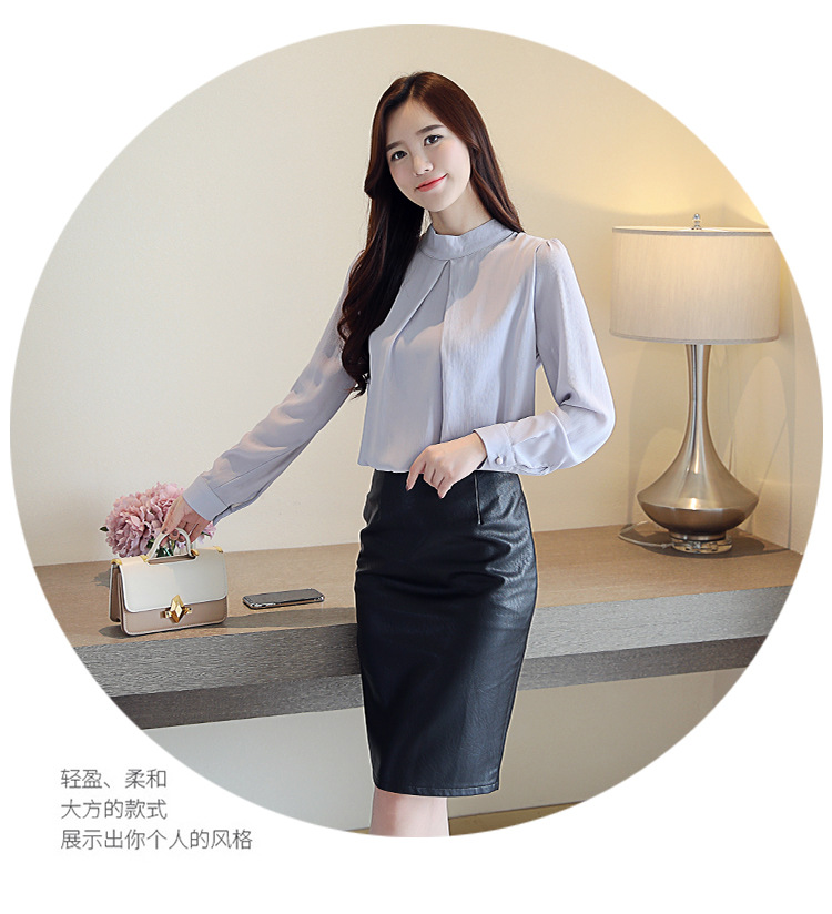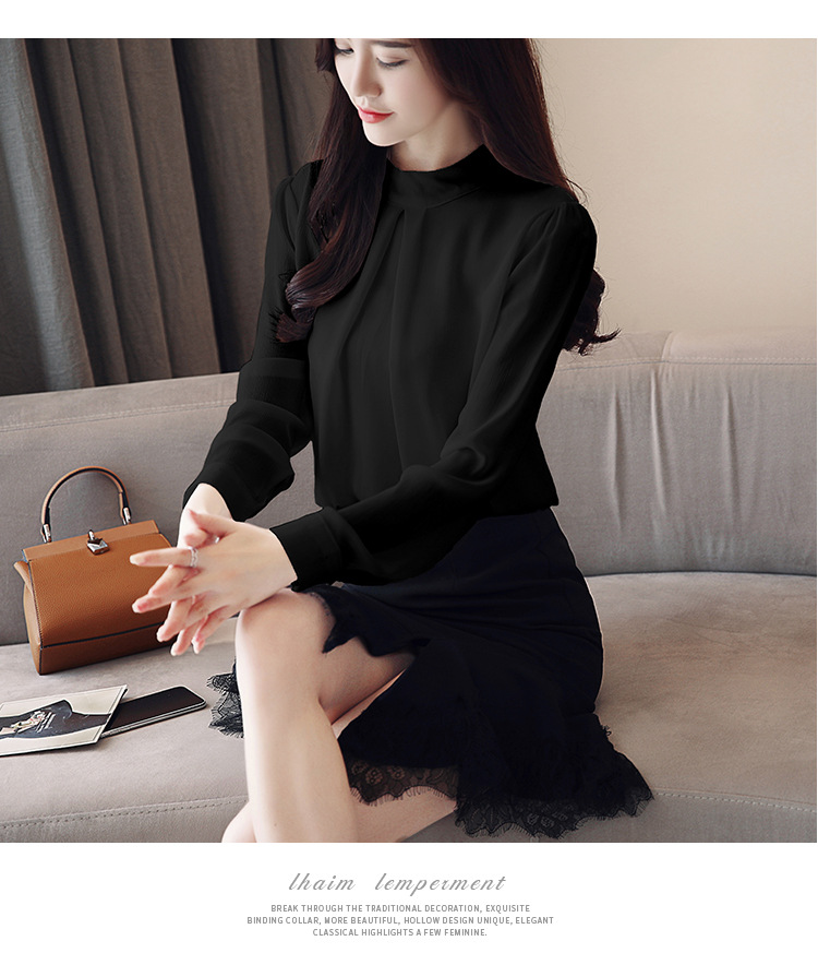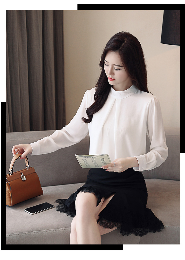 리얼 샷 23 가을 한국 스타일 긴 소매 느슨한 배꼽 커버 쉬폰 셔츠 탑 스탠드 칼라 유행 올 매치 우아한 서양식 작은 셔츠